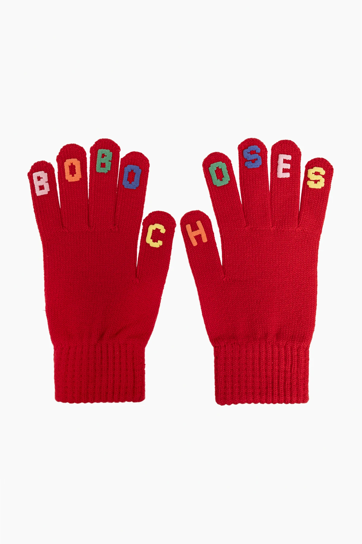 Te klasyczne, pięciopalczaste rękawiczki w dominującym kolorze czerwonym wyróżniają się wyjątkowym wzornictwem. Każdy palec zdobią wyszyte litery w barwnych odcieniach: niebieskim, różowym, zielonym, pomarańczowym i żółtym, układające się w napis "BOBO" na jednej rękawiczce oraz "CHOSES" na drugiej. Charakterystyczny napis "BOBO CHOSES" jest wyrazistym elementem, który podkreśla ekskluzywność produktu.
