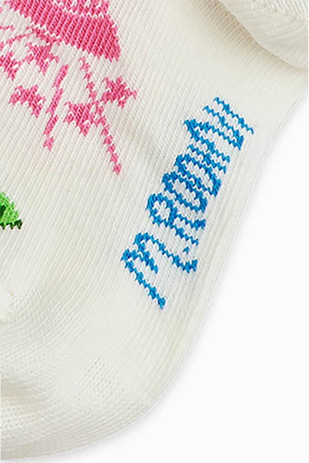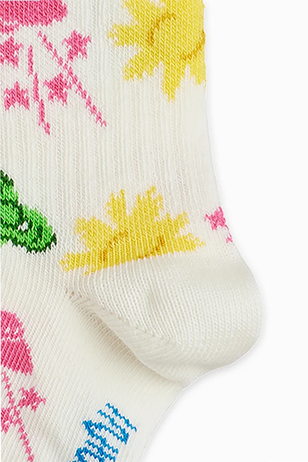 Starannie wykonane z miękkiej, gładkiej bawełny o drobnym splocie, zachwycają niesymetrycznym, wielobarwnym wzorem na całej powierzchni. Subtelne zielone chmurki, żółte kształty kwiatów i różowe, promienne obłoczki tworzą niepowtarzalną kompozycję – w duchu dziecięcej wyobraźni, którą celebruje marka. Warto zwrócić uwagę na wyrazisty, niebieski napis na spodzie skarpety, będący charakterystycznym detalem.