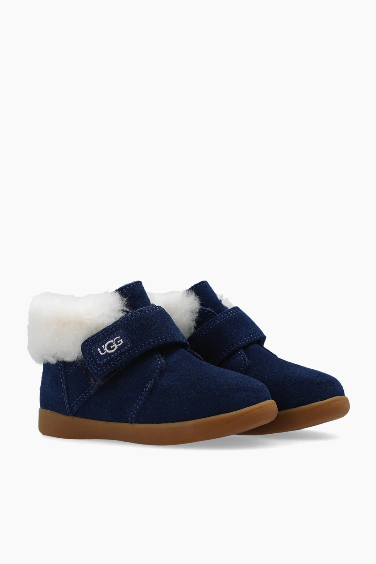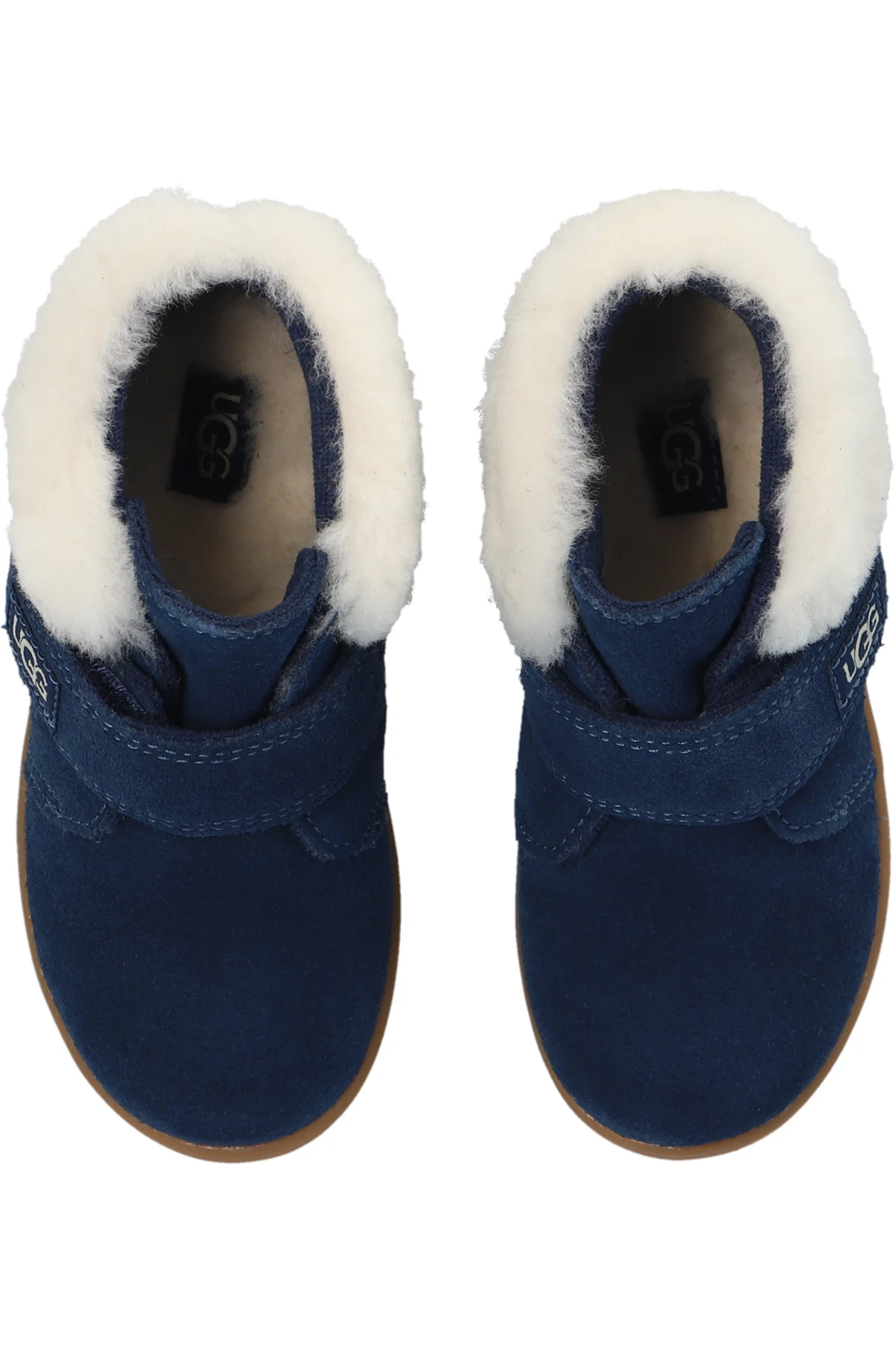 Granatowe buty, model ‘T Nolen’ UGG Kids. Wykonane z miękkiego zamszu. Wykończone owczą wełną w kolorze kremowym. Zapinane na rzep. Ozdobione wyszytym logo. Wyściółka z antybakteryjnej mikrofibry. Brązowa, elastyczna, lekka podeszwa zewnętrzna z formowanej gumy.