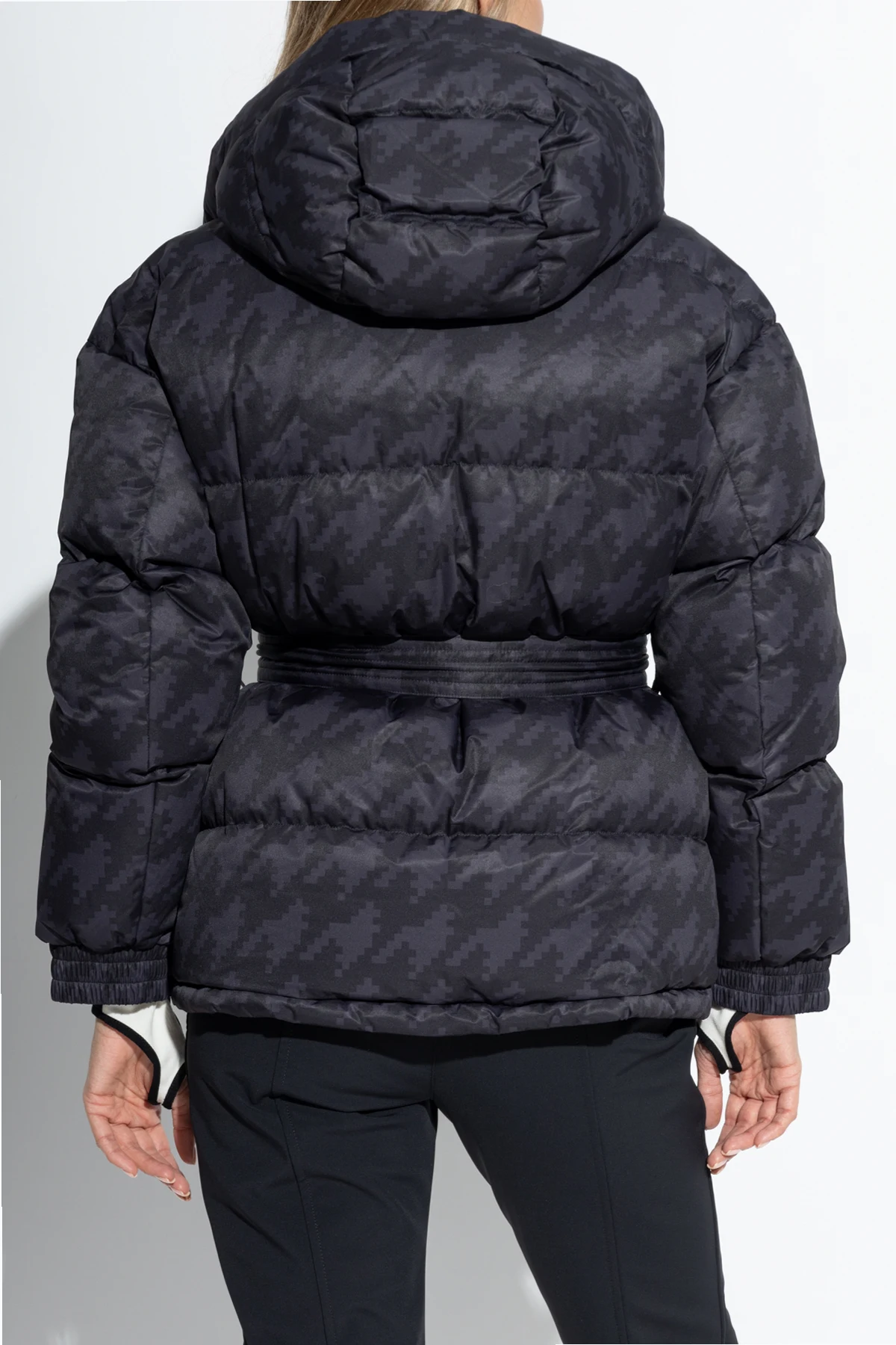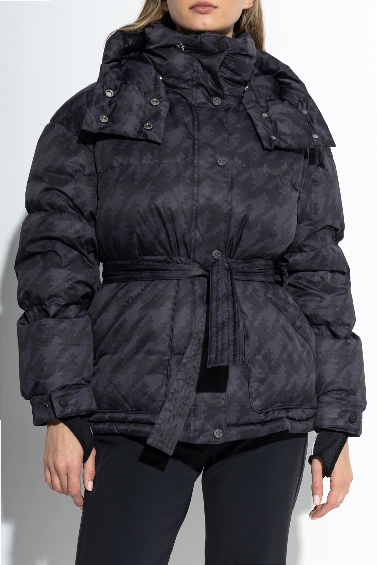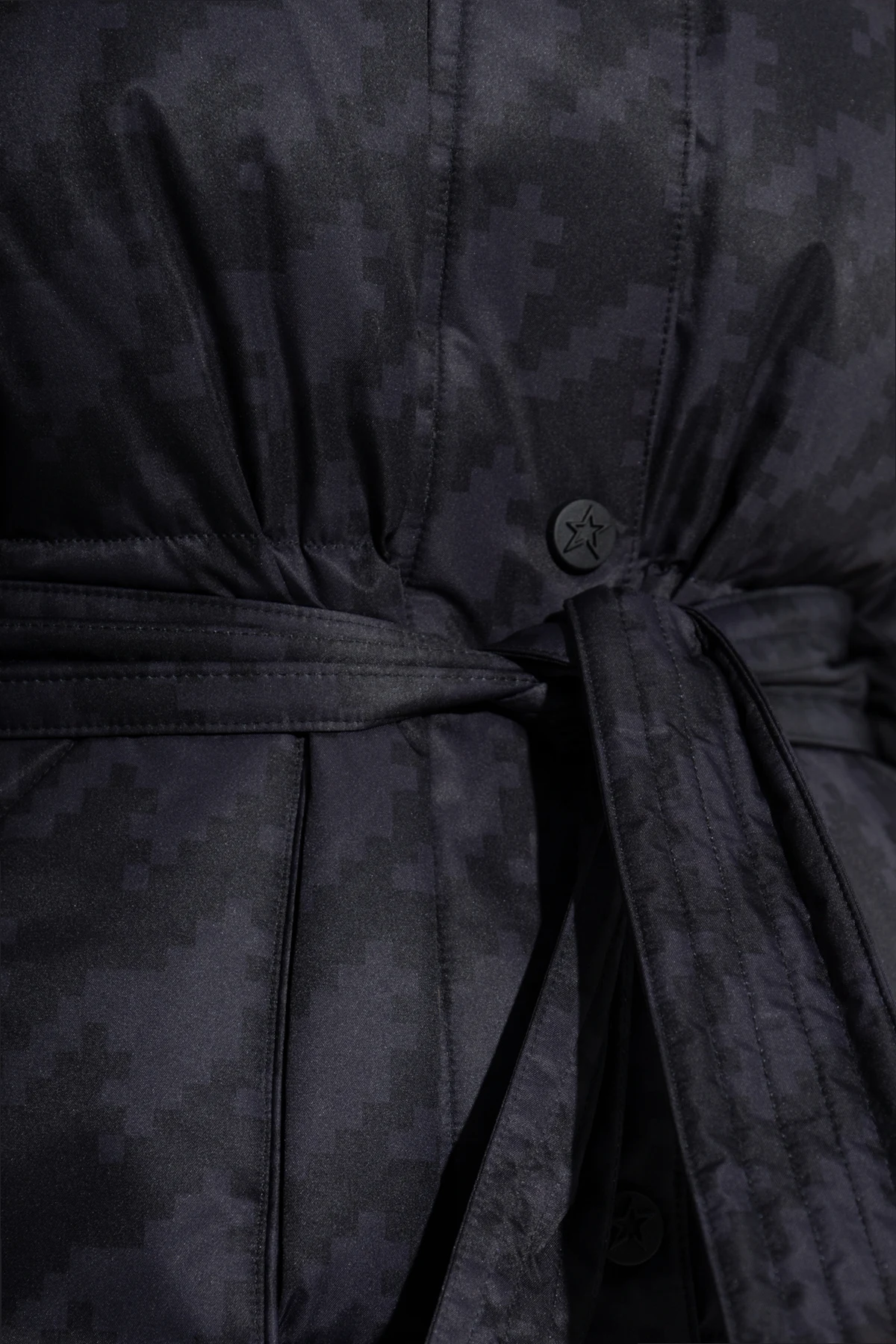 Jej czarno-szary kolor z pikselowym wzorem nadaje całości wyrafinowanego charakteru. Prosty krój z paskiem w talii podkreśla sylwetkę, a duży, odpinany kaptur i szerokie rękawy z mankietami na zatrzaski dodają funkcjonalności. Zapięcie na zamek i zatrzaski oraz dwie kieszenie na zamek pozwalają na wygodę użytkowania.