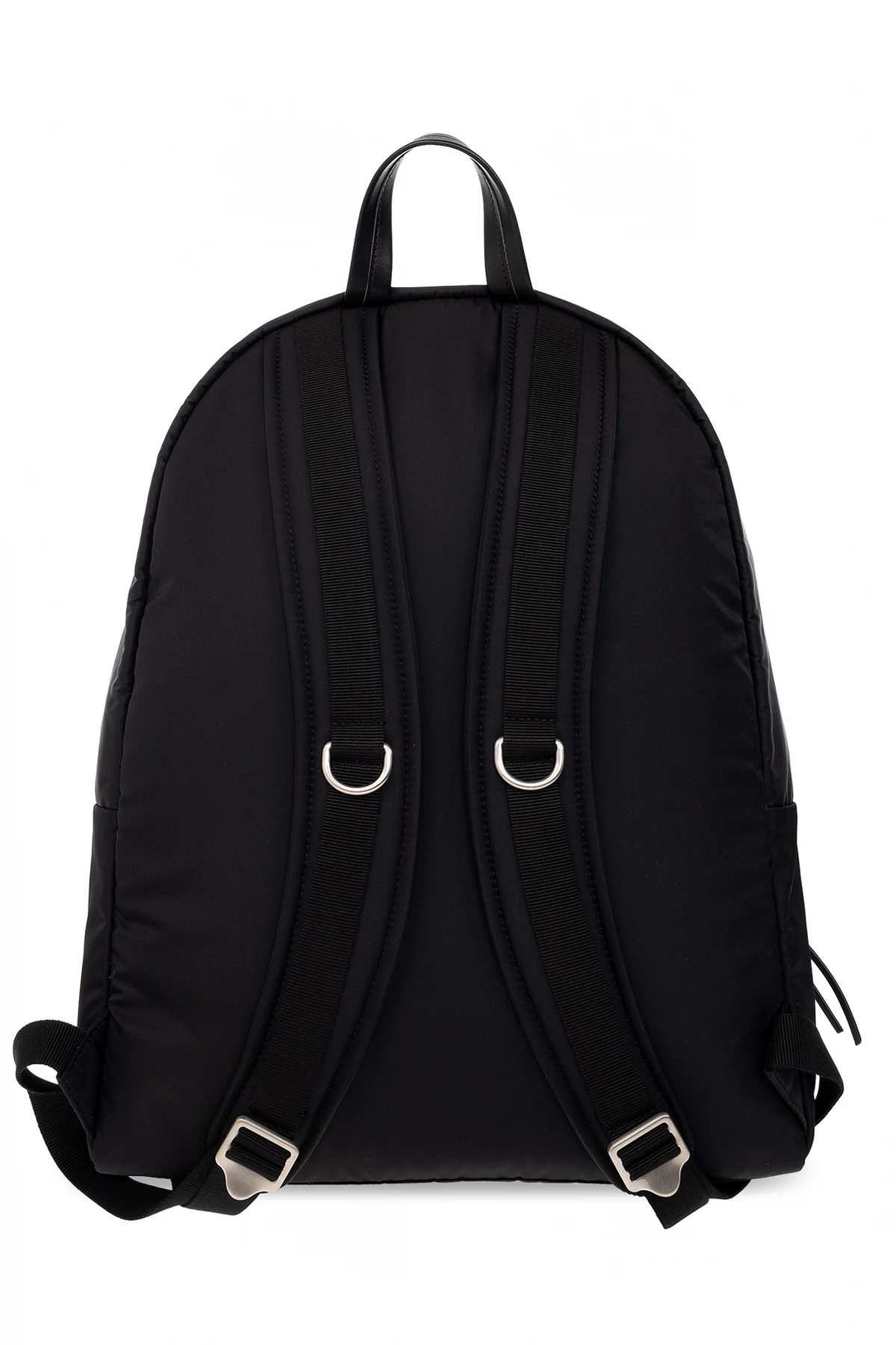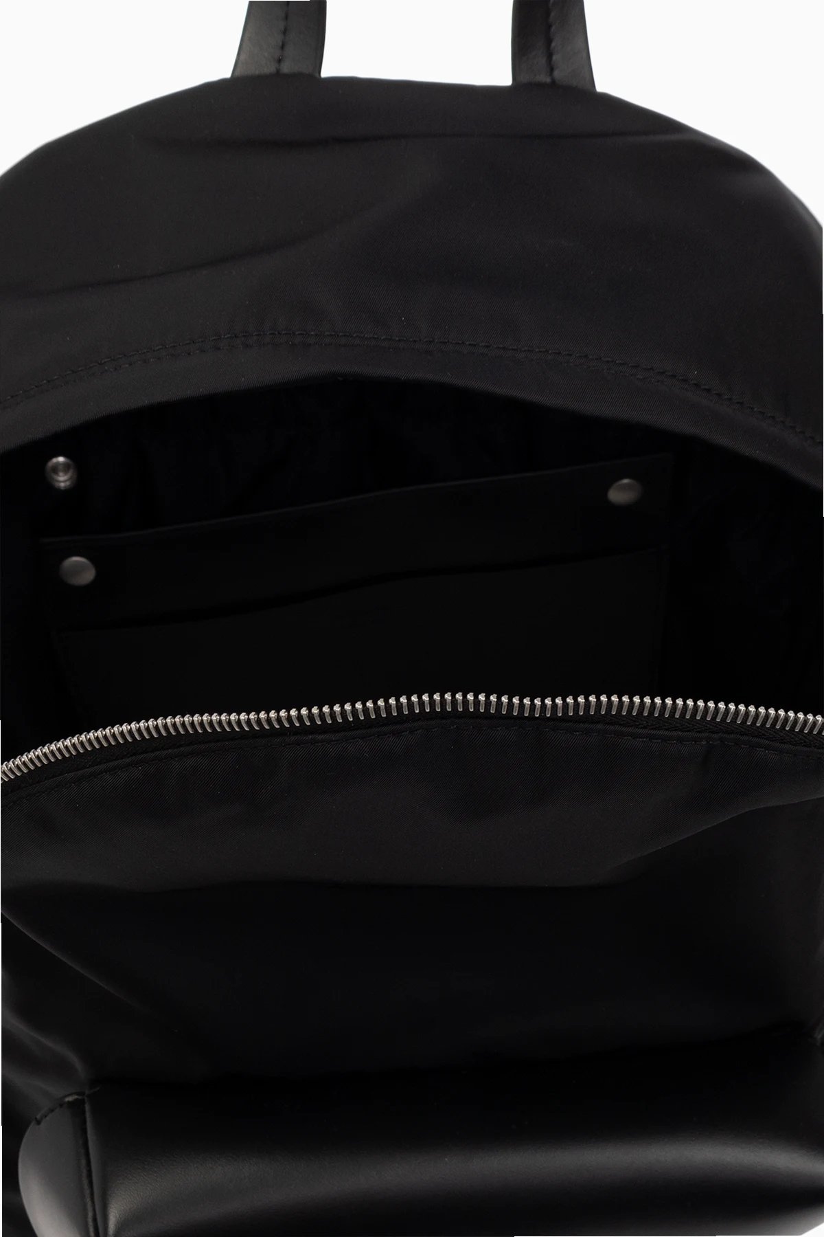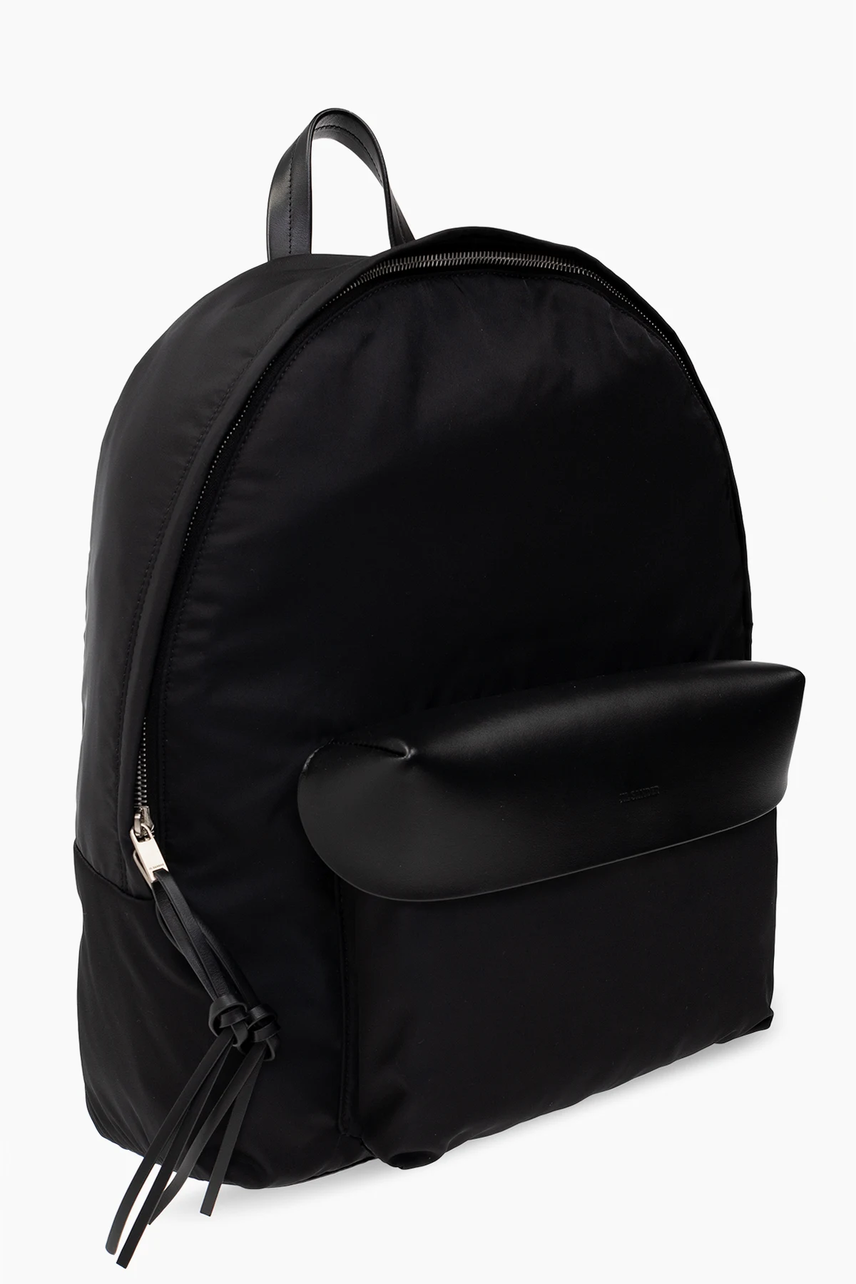 Czarny plecak Jil Sander. Wykonany z materiału. Wykończony skórą cielęcą. Zamykany na dwubiegunowy zamek. Ozdobiony wytłoczonym logo. Z przodu kieszeń z patką zamykaną na zatrzask zamek. Półokrągła rączka. Regulowane szelki. Wewnątrz komora i dwie wsuwane kieszenie, jedna odpinana. Metalowe elementy w kolorze srebrnym.