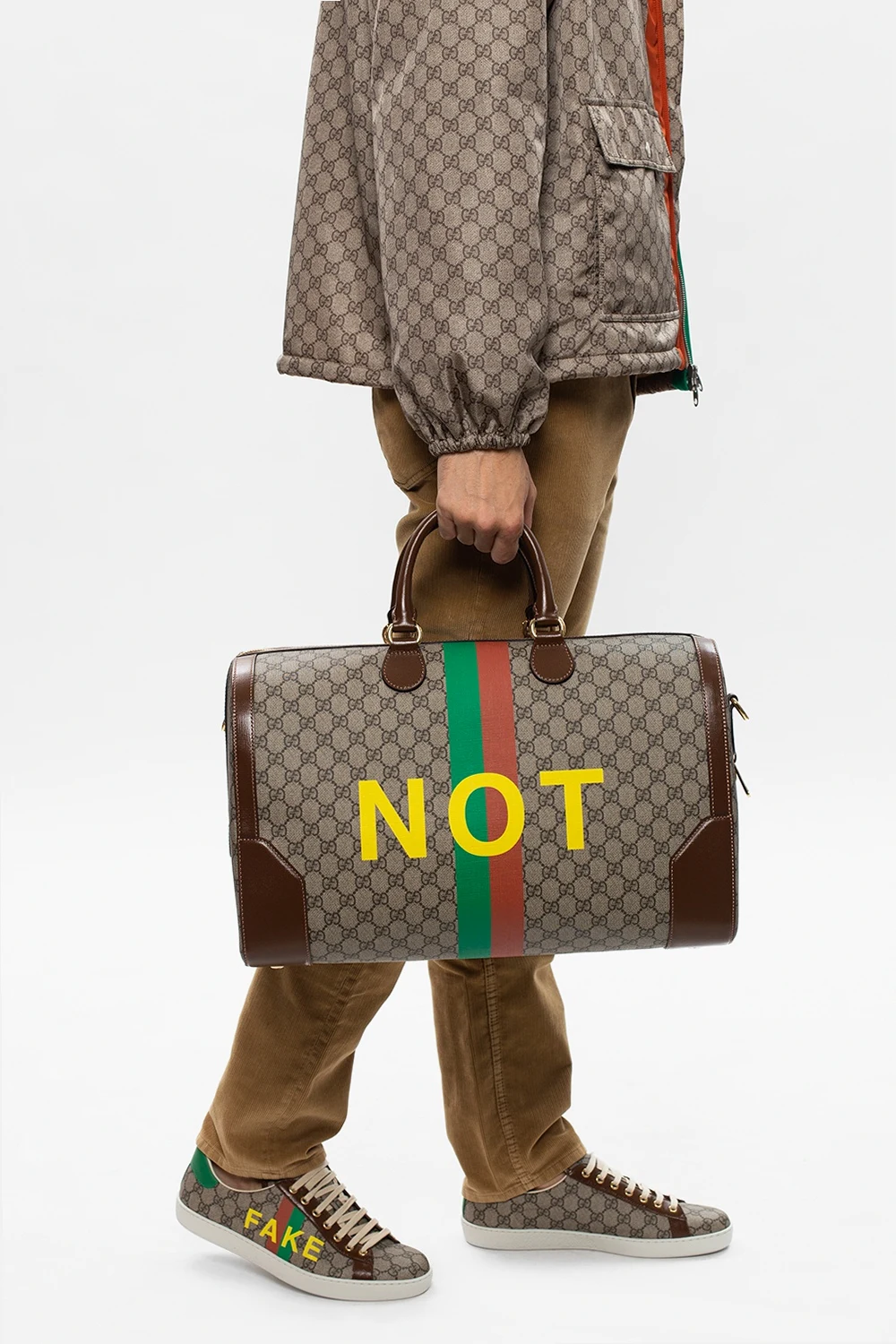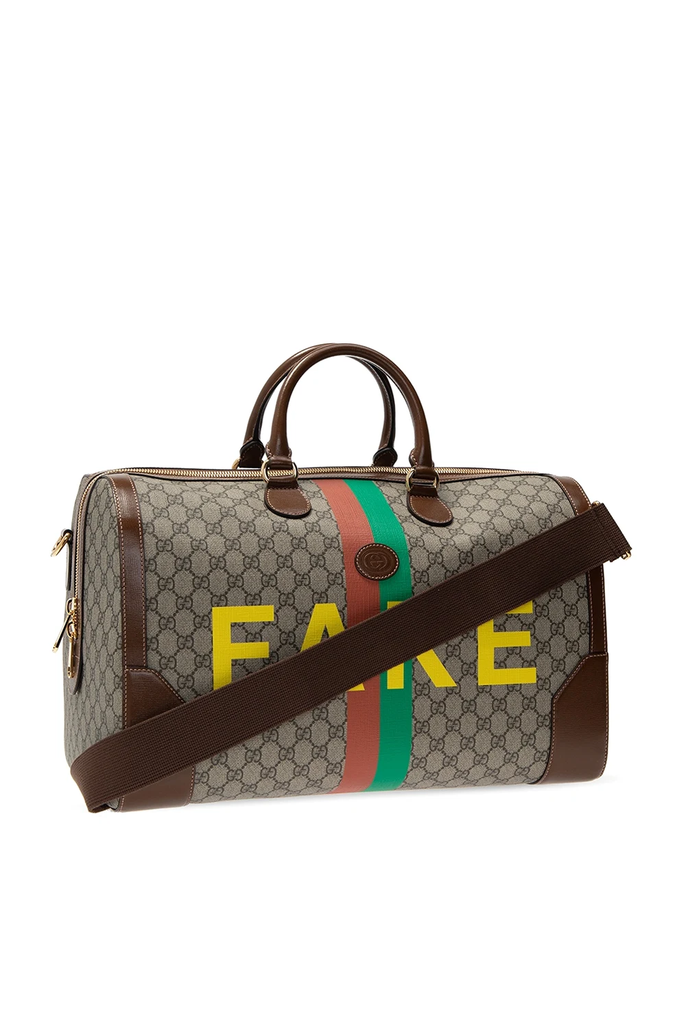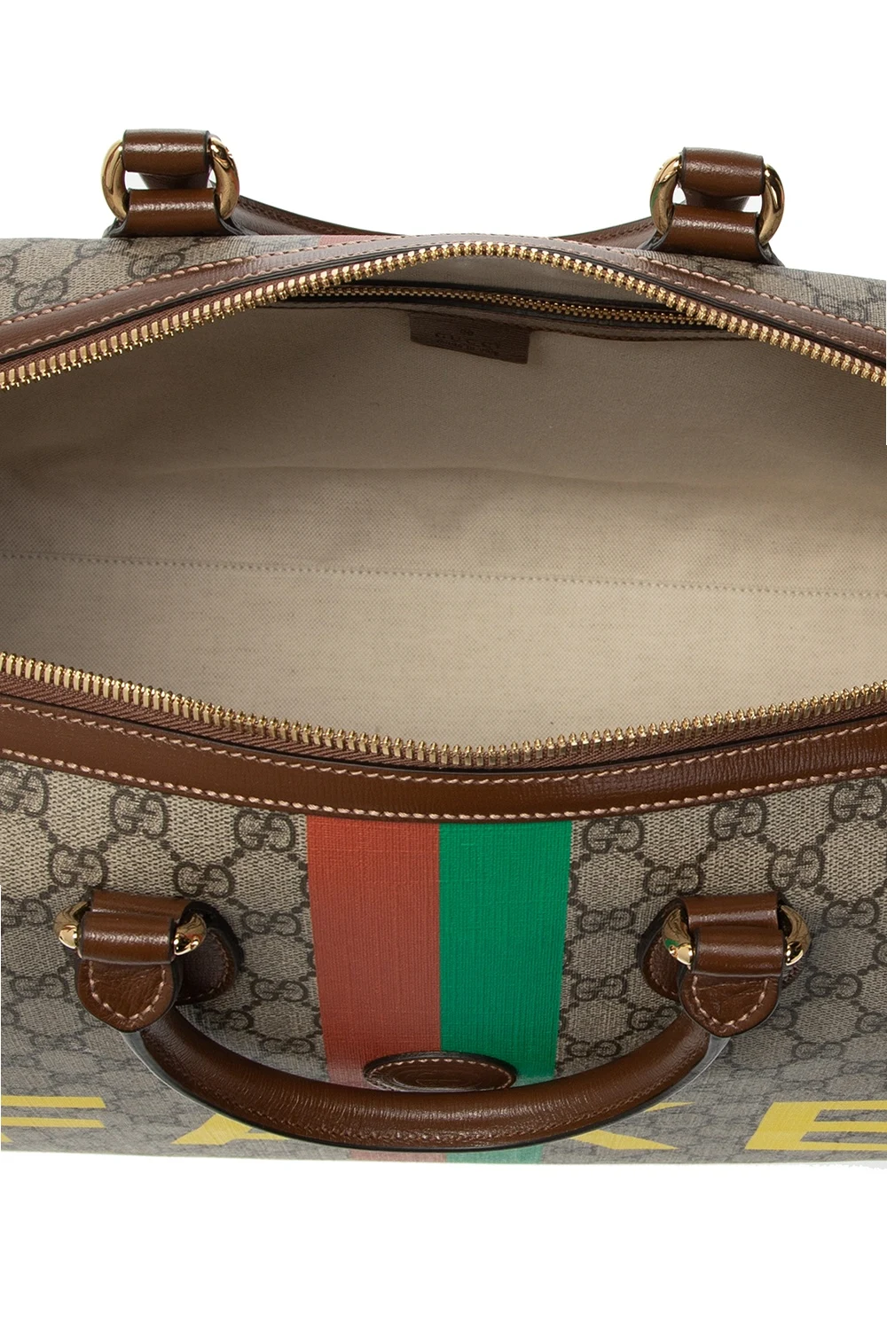 Beżowo-brązowa torba podręczna, model ‘Ophidia’ Gucci. Wykonana z charakterystycznego dla marki płótna ‘GG Supreme’. Wykończona skórą. Zamykana na dwubiegunowy zamek. Ozdobiona wzorem z logo, żółtymi nadrukami oraz zielono-czerwonymi paskami ‘Web’. Dwie półokrągłe rączki. Odpinany pasek na ramię z możliwością regulacji długości. Warstwa wewnętrzna w kolorze kremowym. Wewnątrz komora, wsuwana kieszeń oraz kieszeń zapinana na zamek. Dołączone dwie zawieszki: jedna zapinana na zatrzask z dołączoną kłódką oraz kluczami.