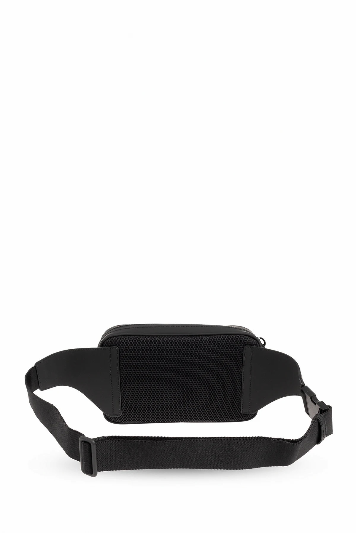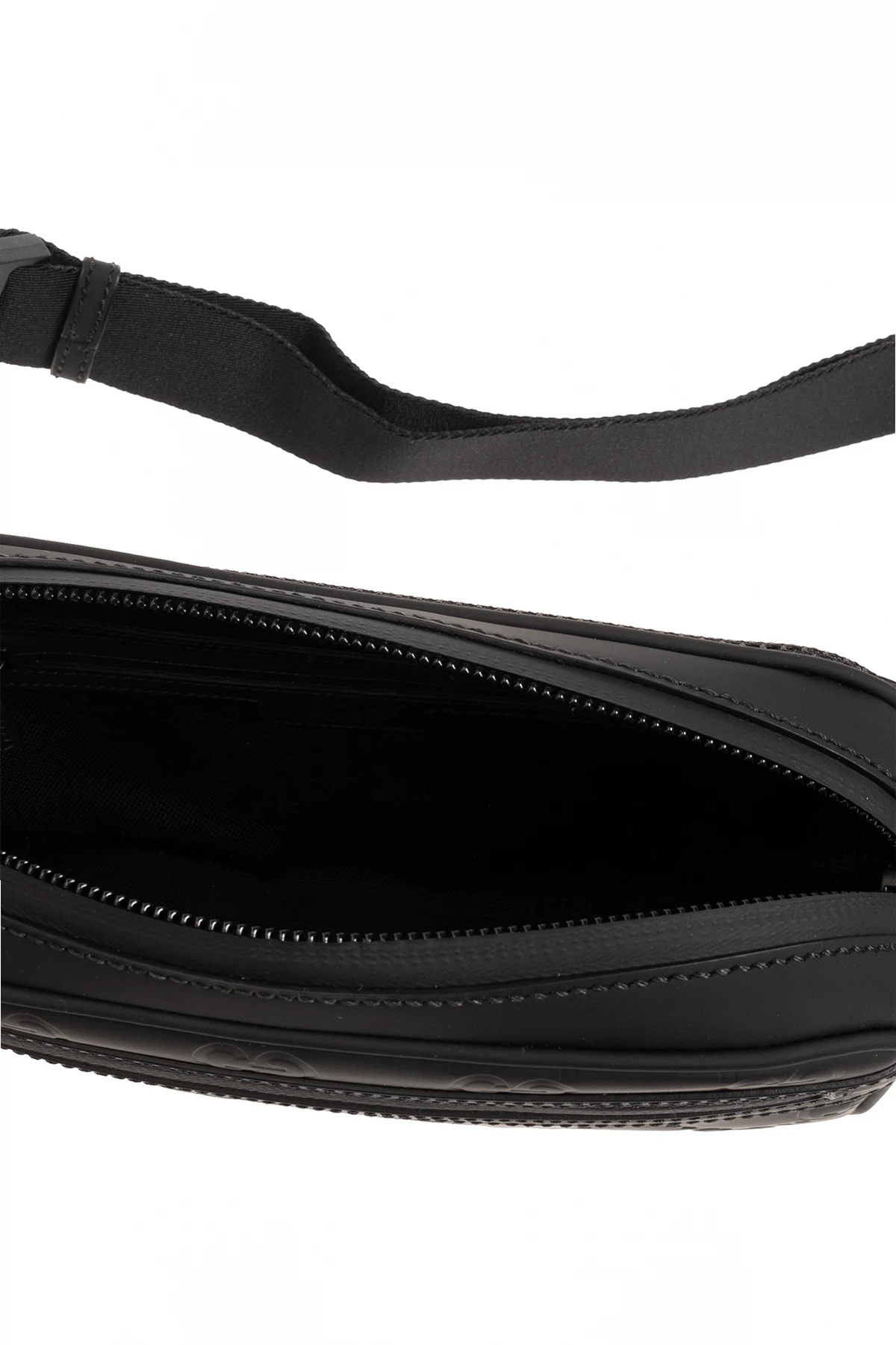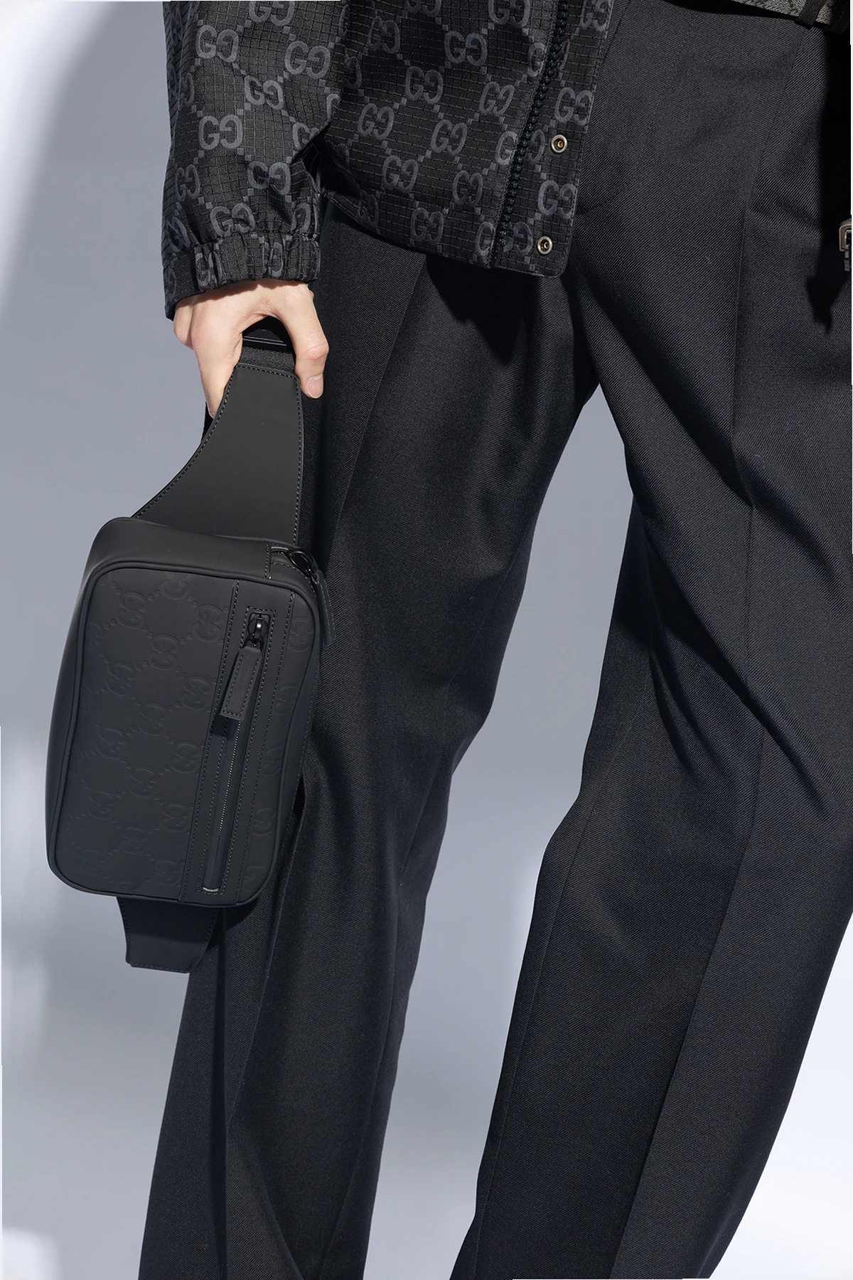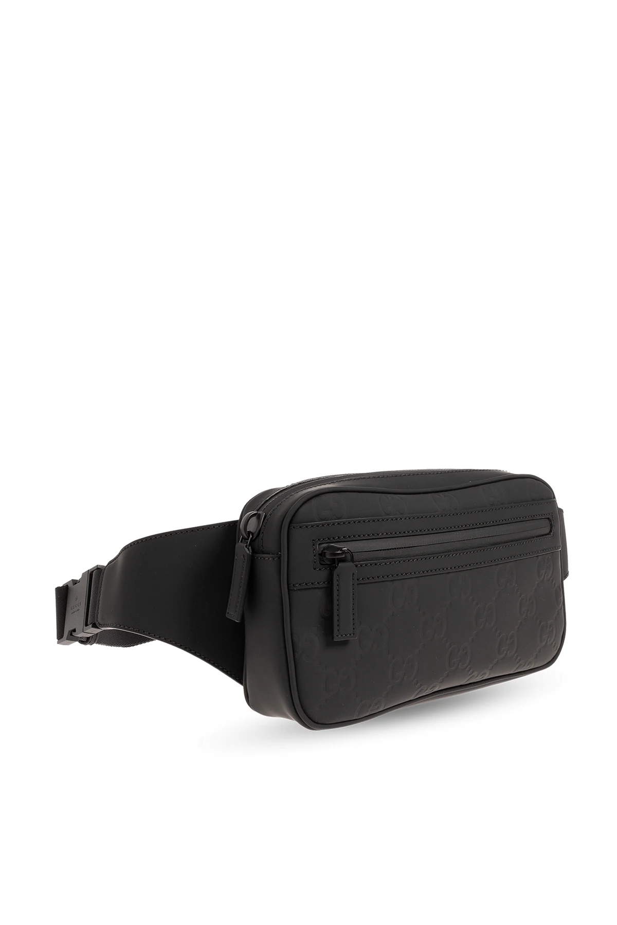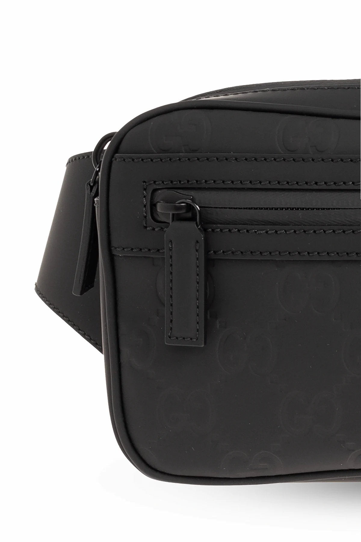 Czarna torba na pas Gucci. Wykonana ze skóry cielęcej pokrytej gumową powłoką. Zamykana na zamek. Ozdobiona wytłoczonym monogramem. Z przodu kieszeń z zamknięciem na zamek. Regulowany pasek. Wewnątrz komora z kieszenią zamykaną na zamek.
