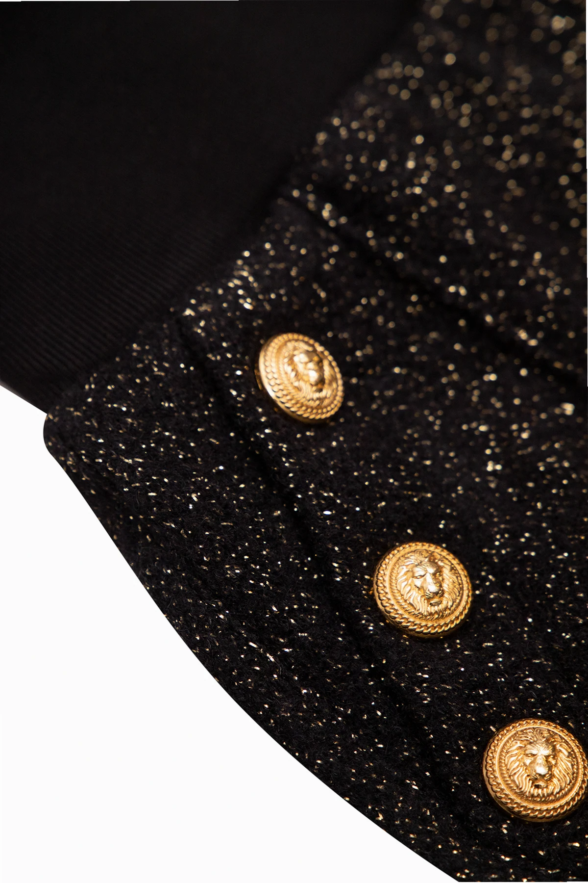 Czarne szorty Balmain Kids. W pasie wszyta szeroka guma. Z przodu dwie kieszenie i dekoracyjne guziki w kolorze złotym z charakterystyczną głową lwa. Nogawki z przeszyciem z przodu. Wykończone lureksową nicią w kolorze złotym.