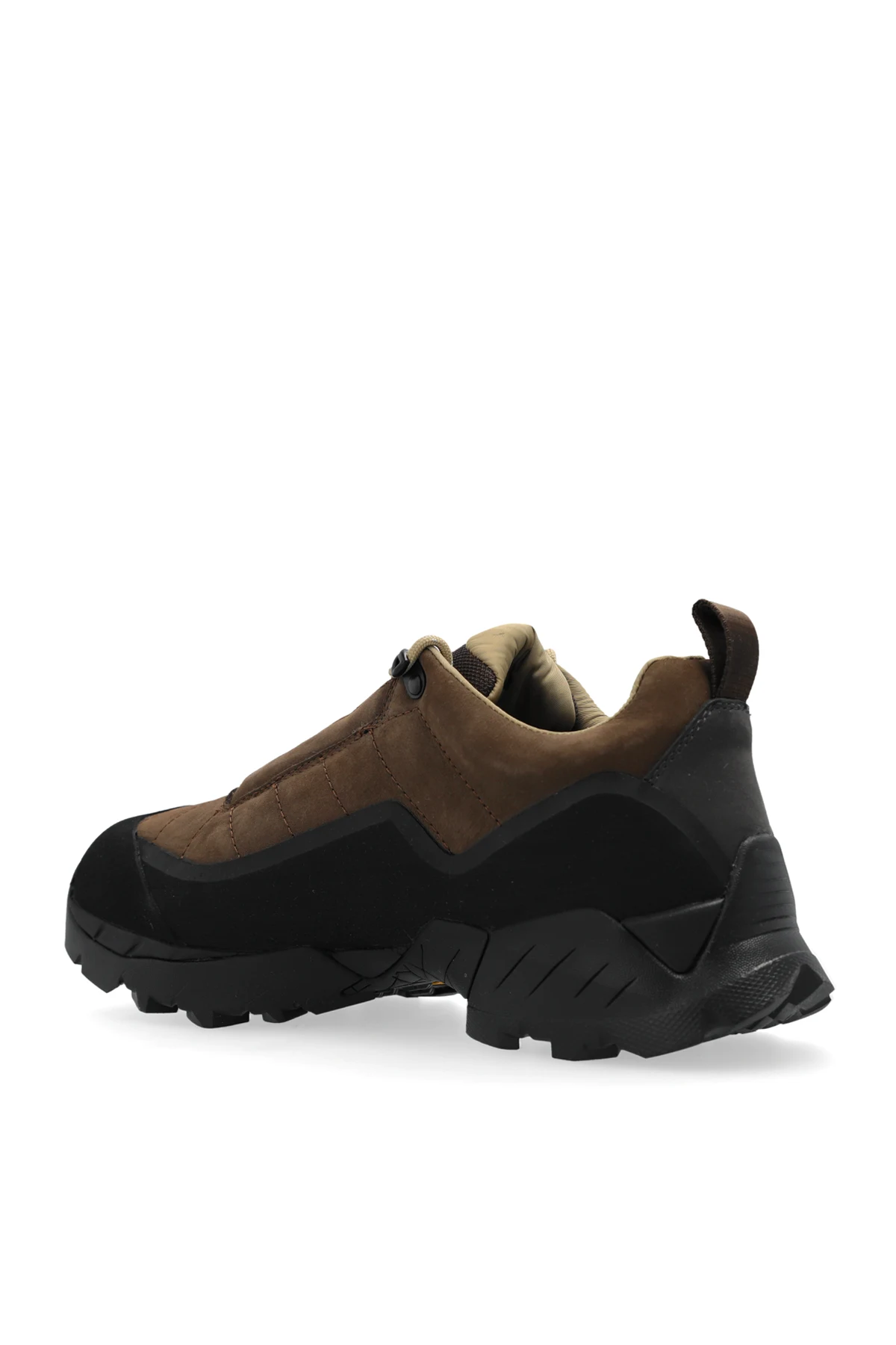 Cholewka wykonana z mieszanki skóry nubukowej i materiałów syntetycznych zapewnia trwałość oraz komfort użytkowania. Buty są utrzymane w jednolitym brązowym kolorze z czarnymi akcentami, co nadaje im uniwersalny i elegancki wygląd. Logo projektanta w formie małego, białego trójkąta, subtelnie umieszczone na boku buta, podkreśla ich ekskluzywny charakter.