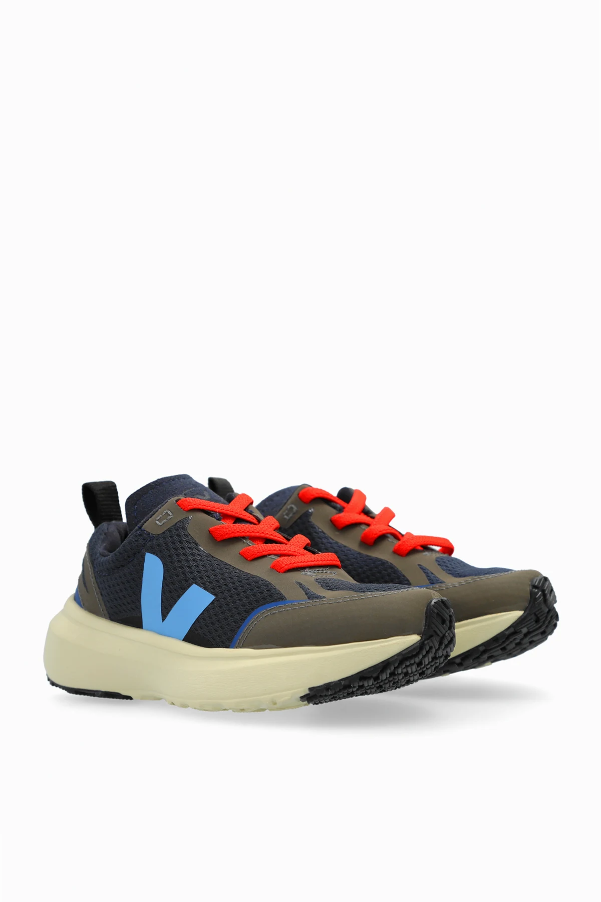 Cholewka wykonana z przewiewnego i lekkiego materiału typu Alveomesh w odcieniach granatu, brązu i jasnego beżu, dopełniona jest elementami zamszowymi oraz syntetycznymi, co wzmacnia konstrukcję buta. Charakterystyczne, duże niebieskie logo w kształcie litery 'V' zdobi boczną część cholewki, nadając butom niepowtarzalny wygląd. Jaskrawo czerwone sznurowadła dodają wyrazistości, a uchwyt na pięcie ułatwia zakładanie obuwia.