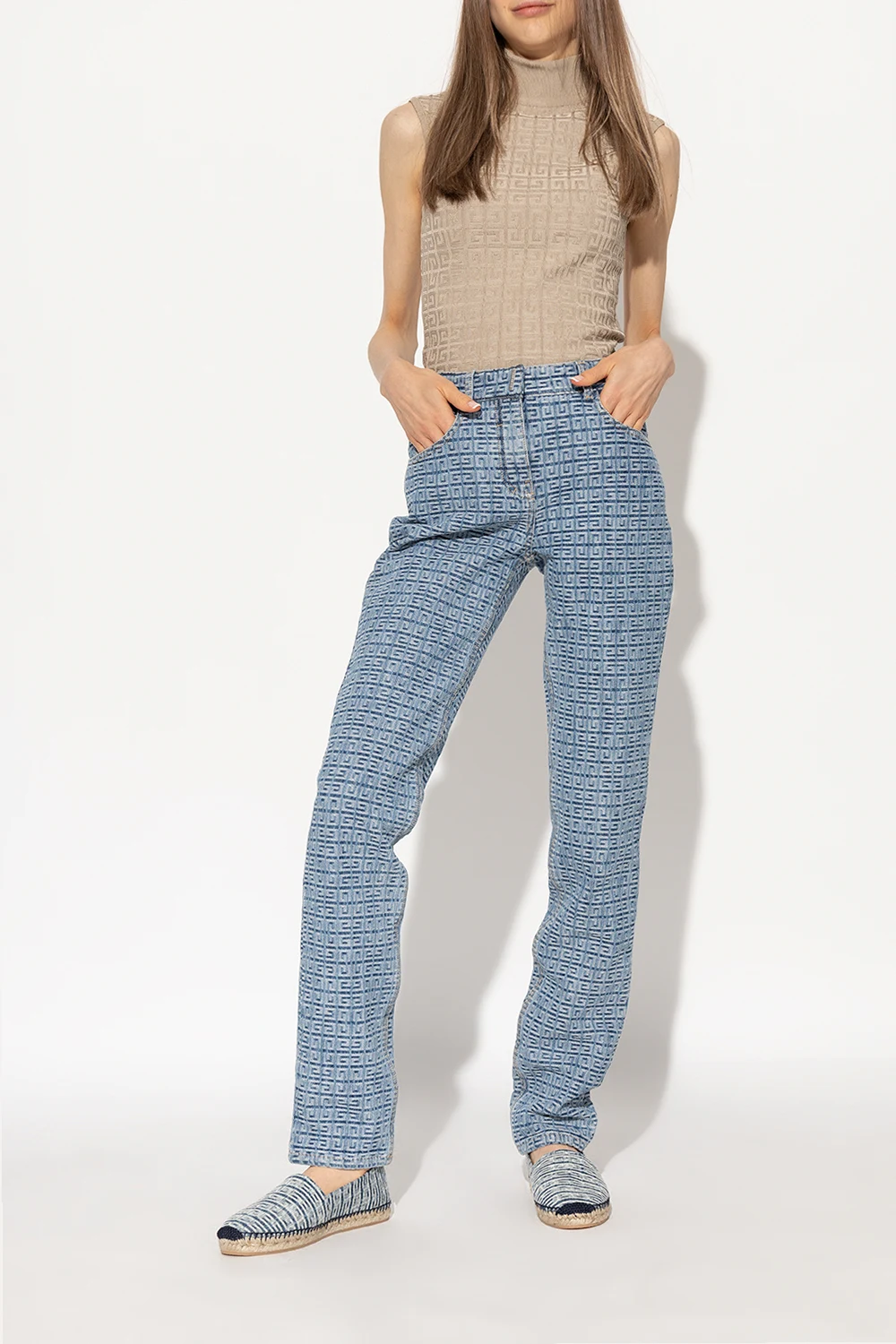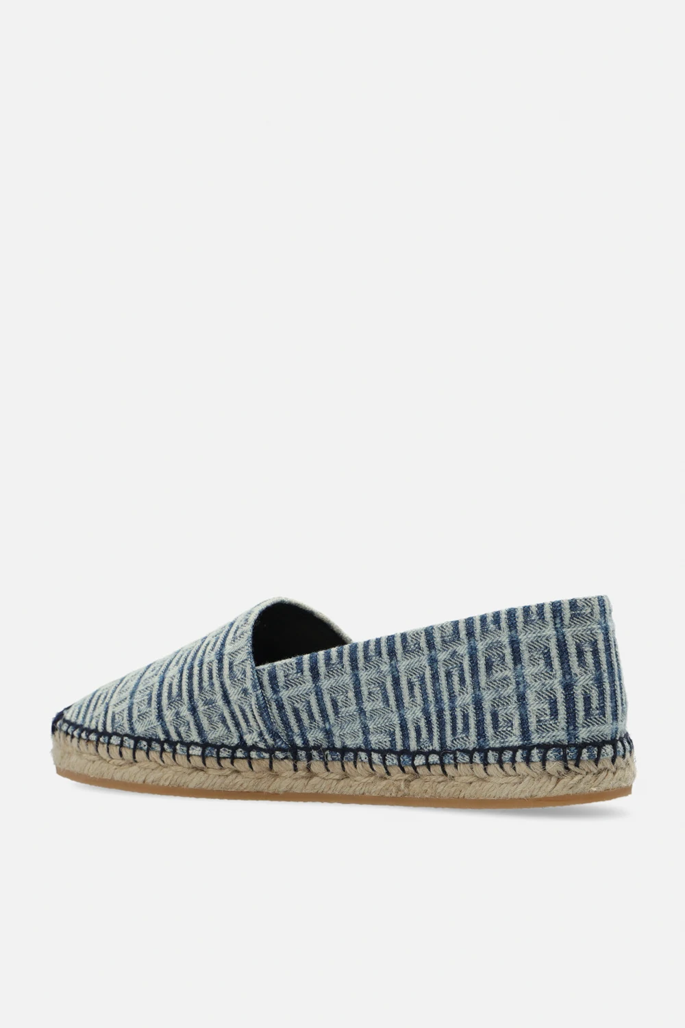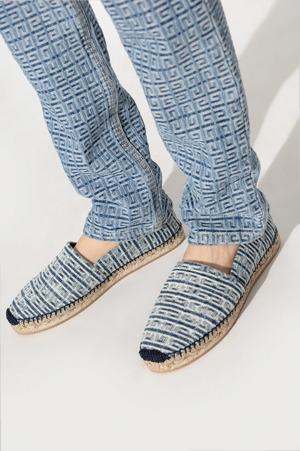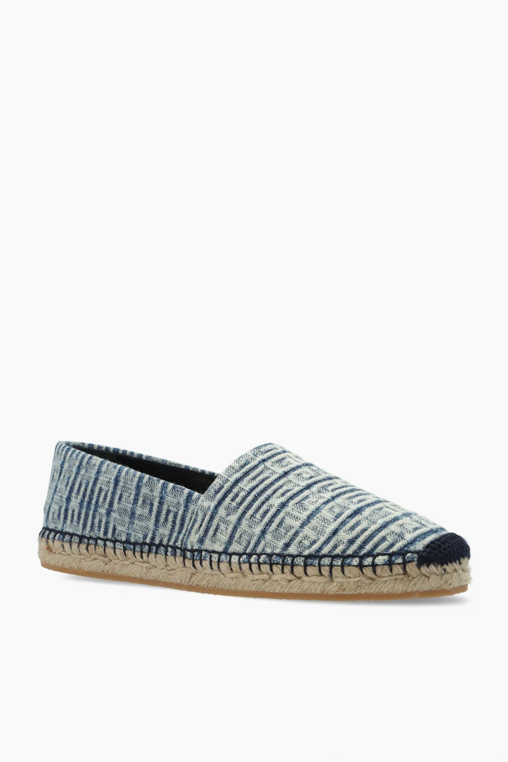 Niebiesko-kremowe espadryle Givenchy. Ozdobione monogramem. Beżowa, gumowa podeszwa wykończona jutą.