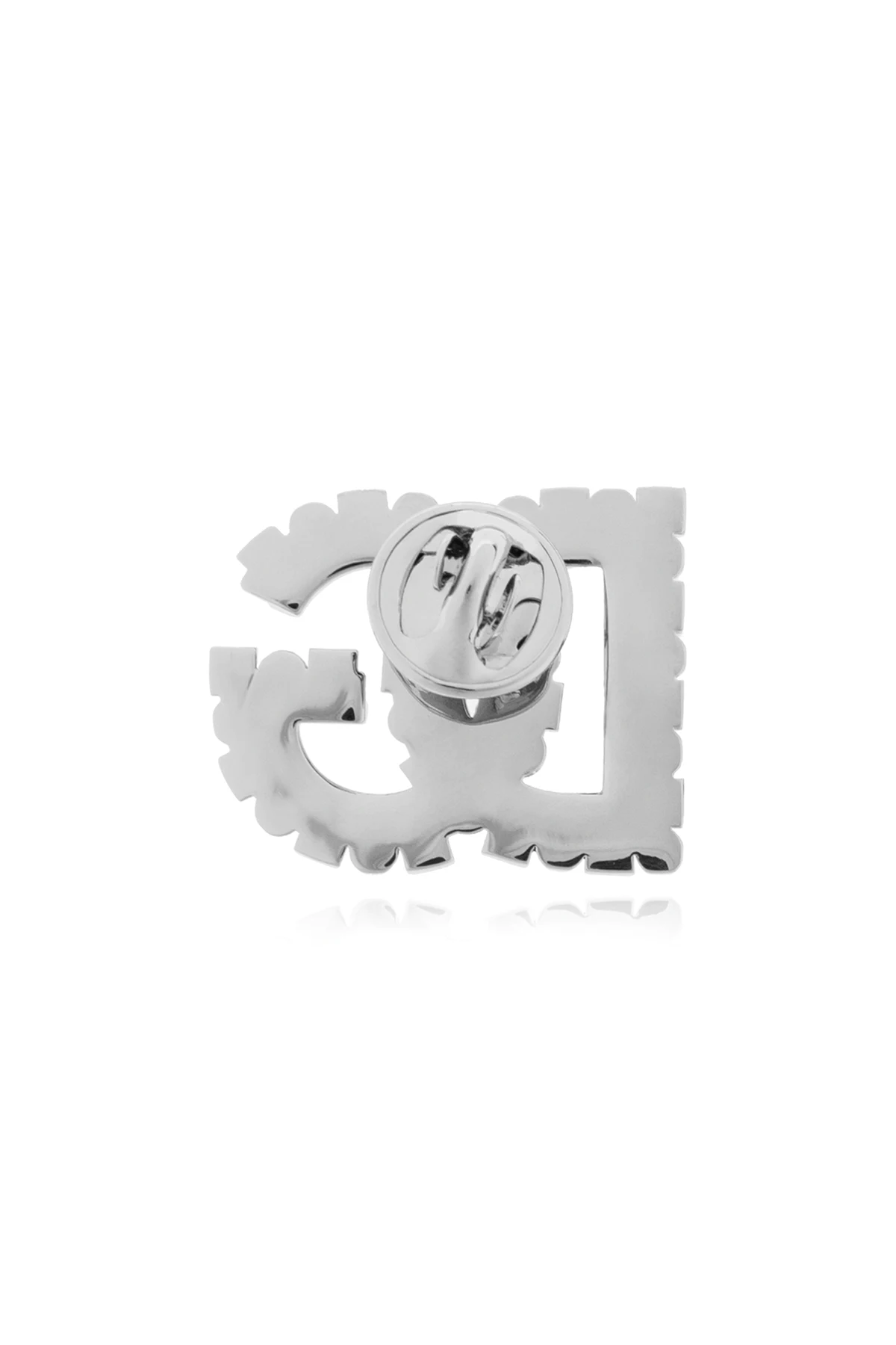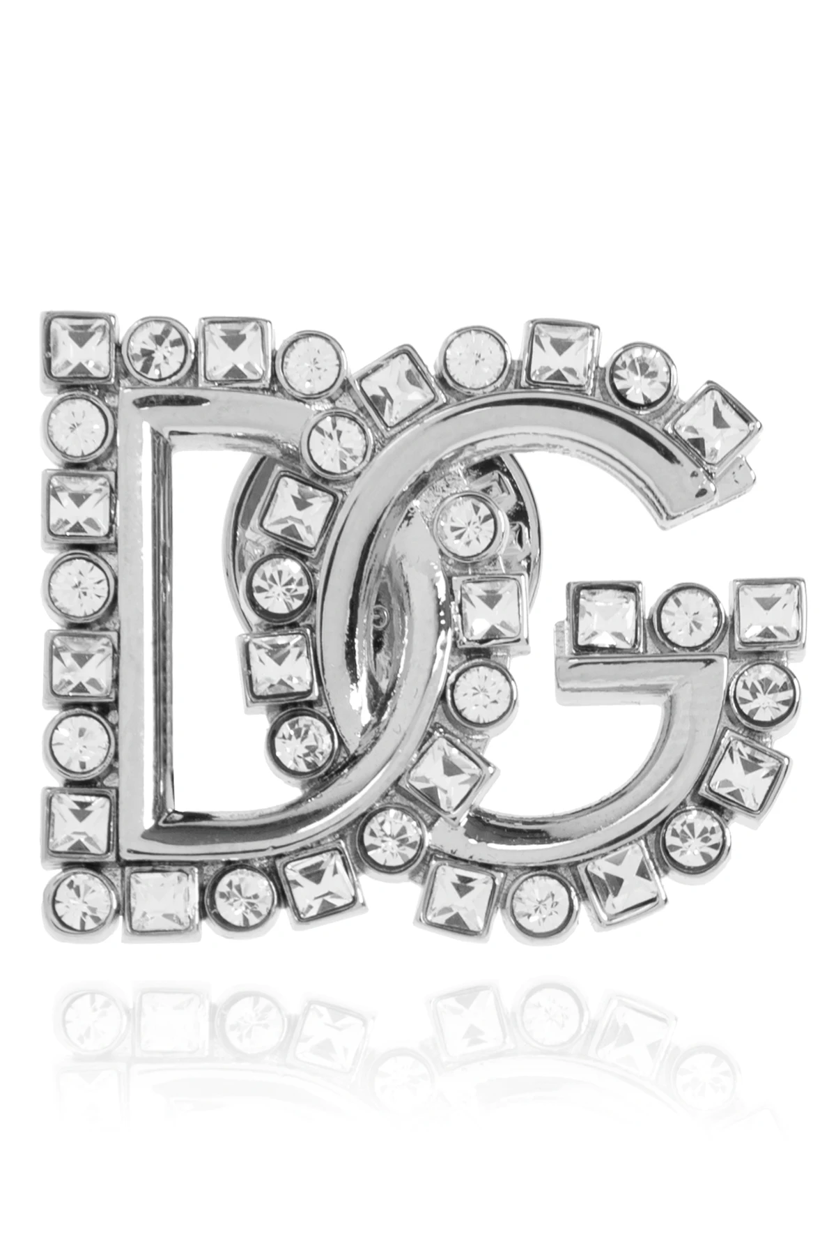 Przypinka o srebrnym kolorze jest misternie ozdobiona różnokształtnymi kryształami, które tworzą wyraźny symbol „DG”. Delikatne zapięcie typu pin zapewnia łatwe i bezpieczne przypięcie do odzieży, podkreślając luksusowy charakter każdej stylizacji.