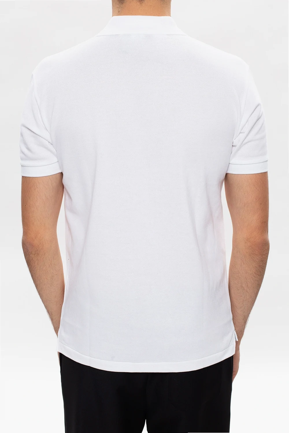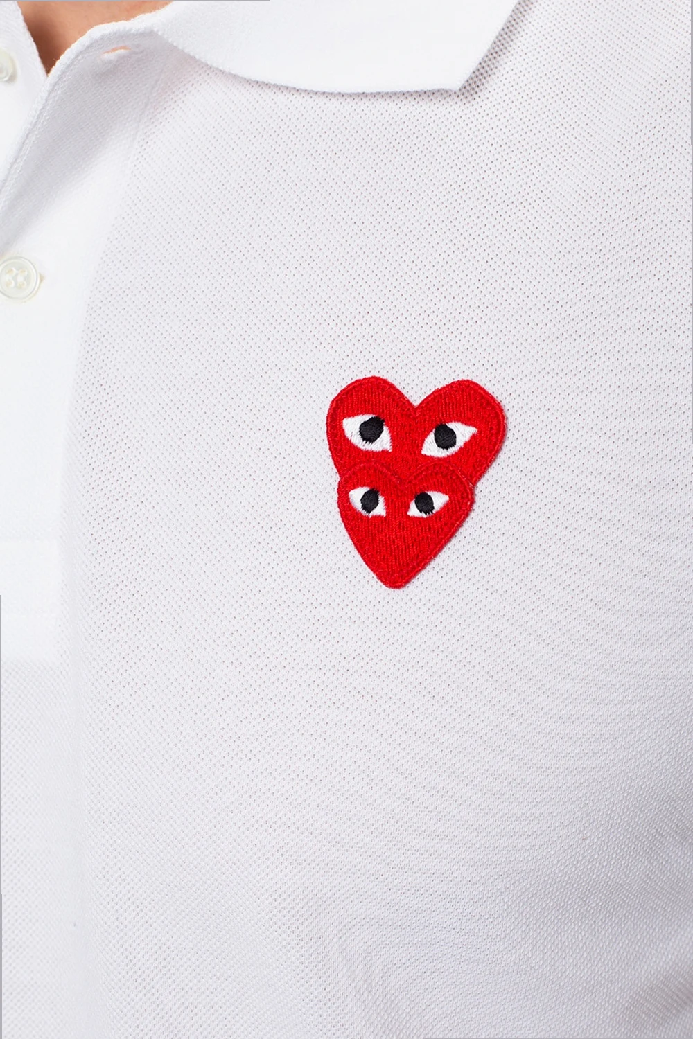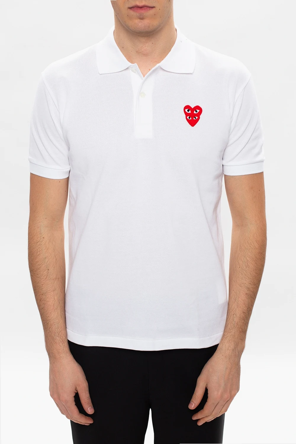 Białe polo Comme des Garçons Play. Wykonane z bawełny. Zapinane na guziki. Ozdobione logo w kolorze czerwono-biało-czarnym. Krótki rękaw.