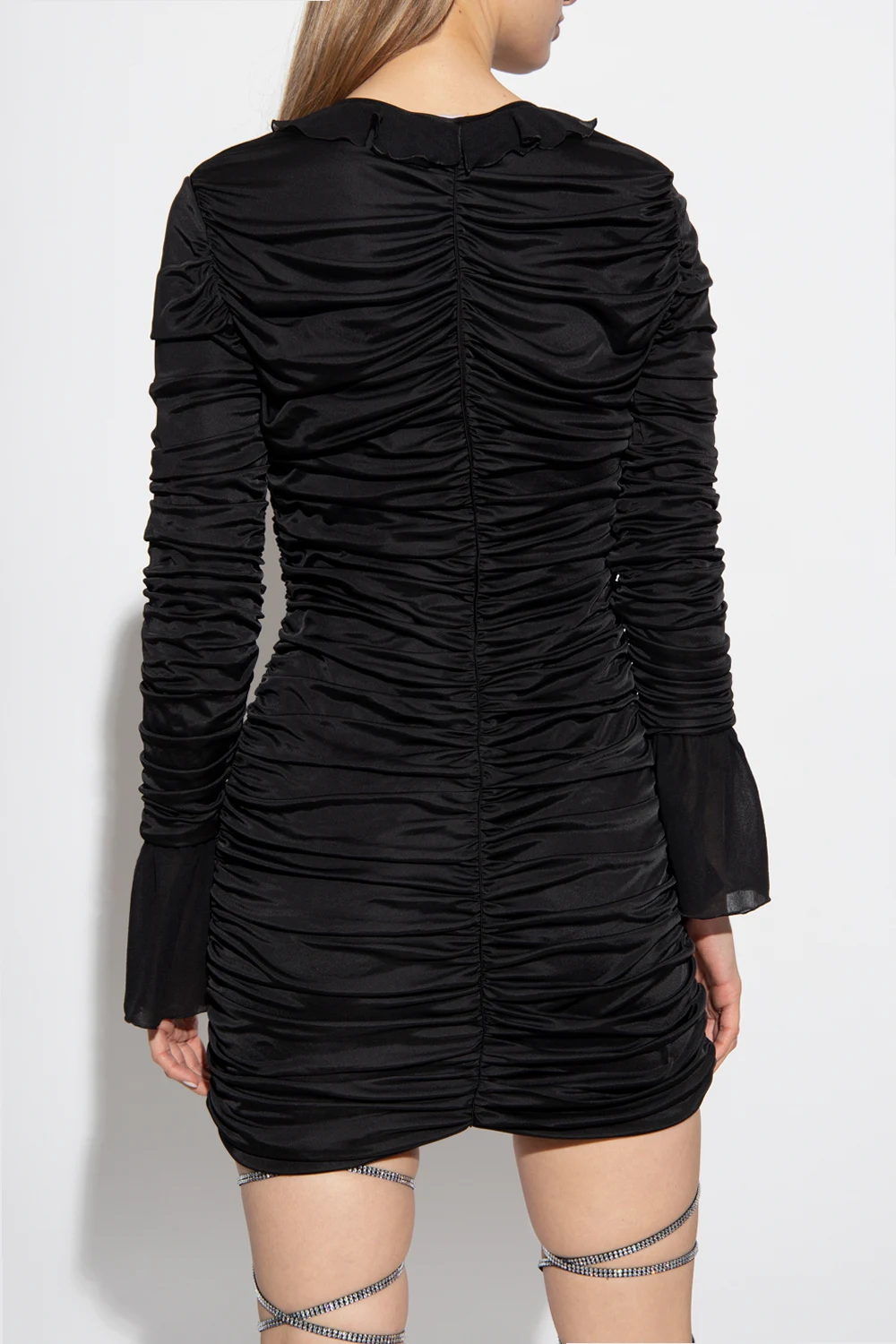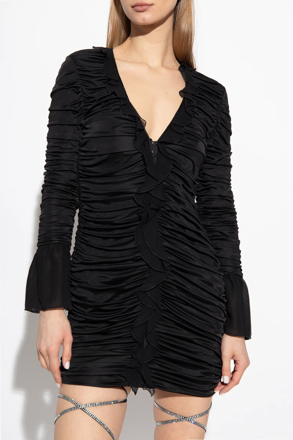 Czarna, marszczona, krótka sukienka Blumarine. Wykonana z materiału o połyskującej fakturze. Zapinana z przodu na haftki. Przy dekolcie w szpic i długich rękawach szyfonowe falbany.