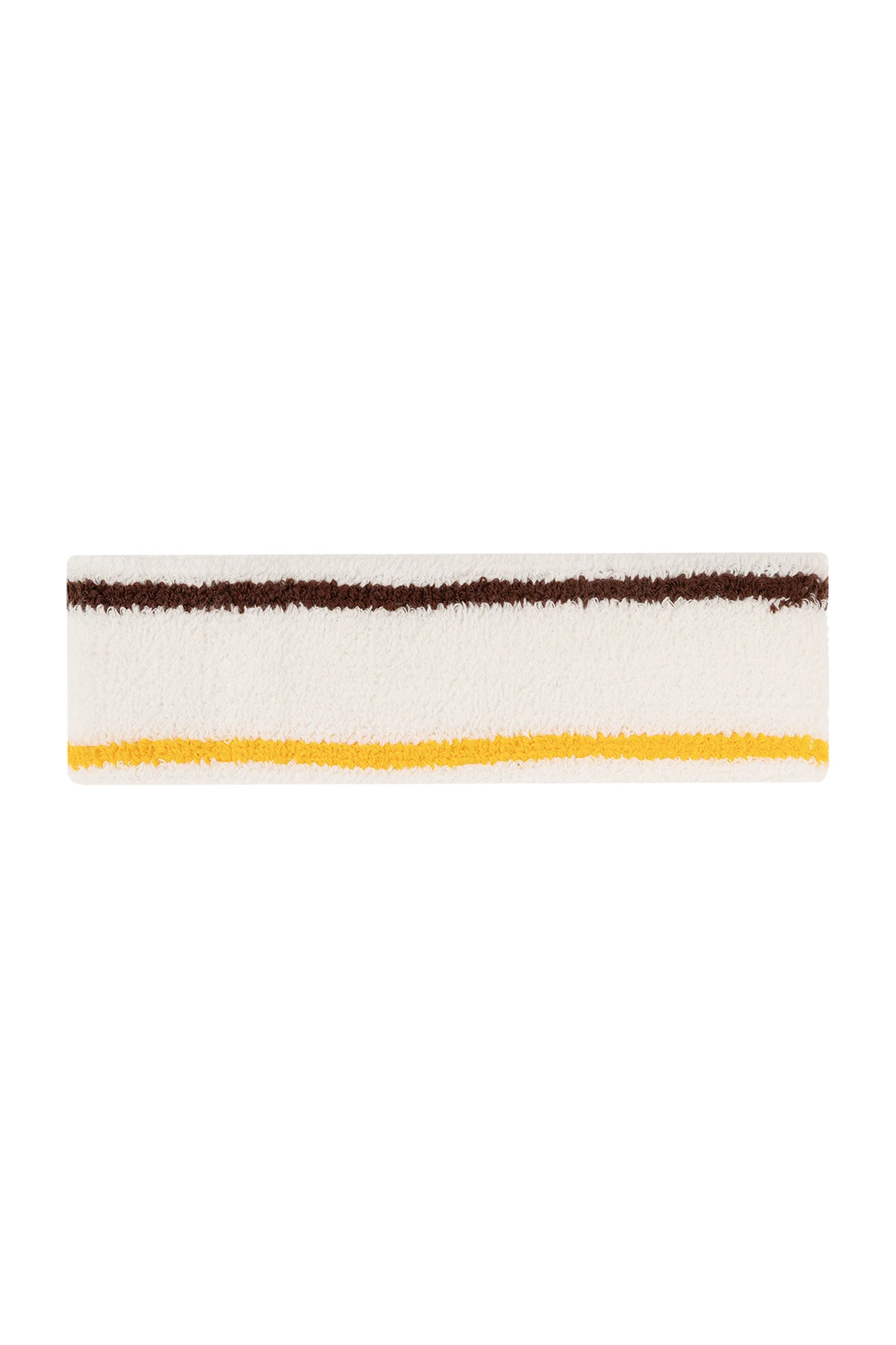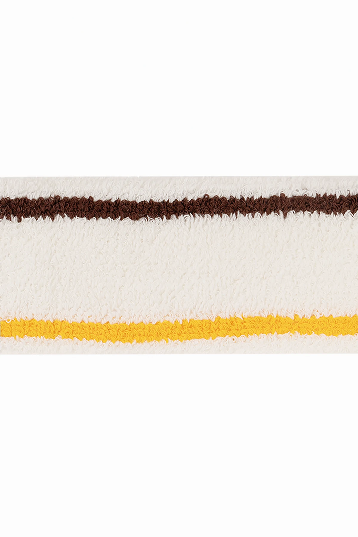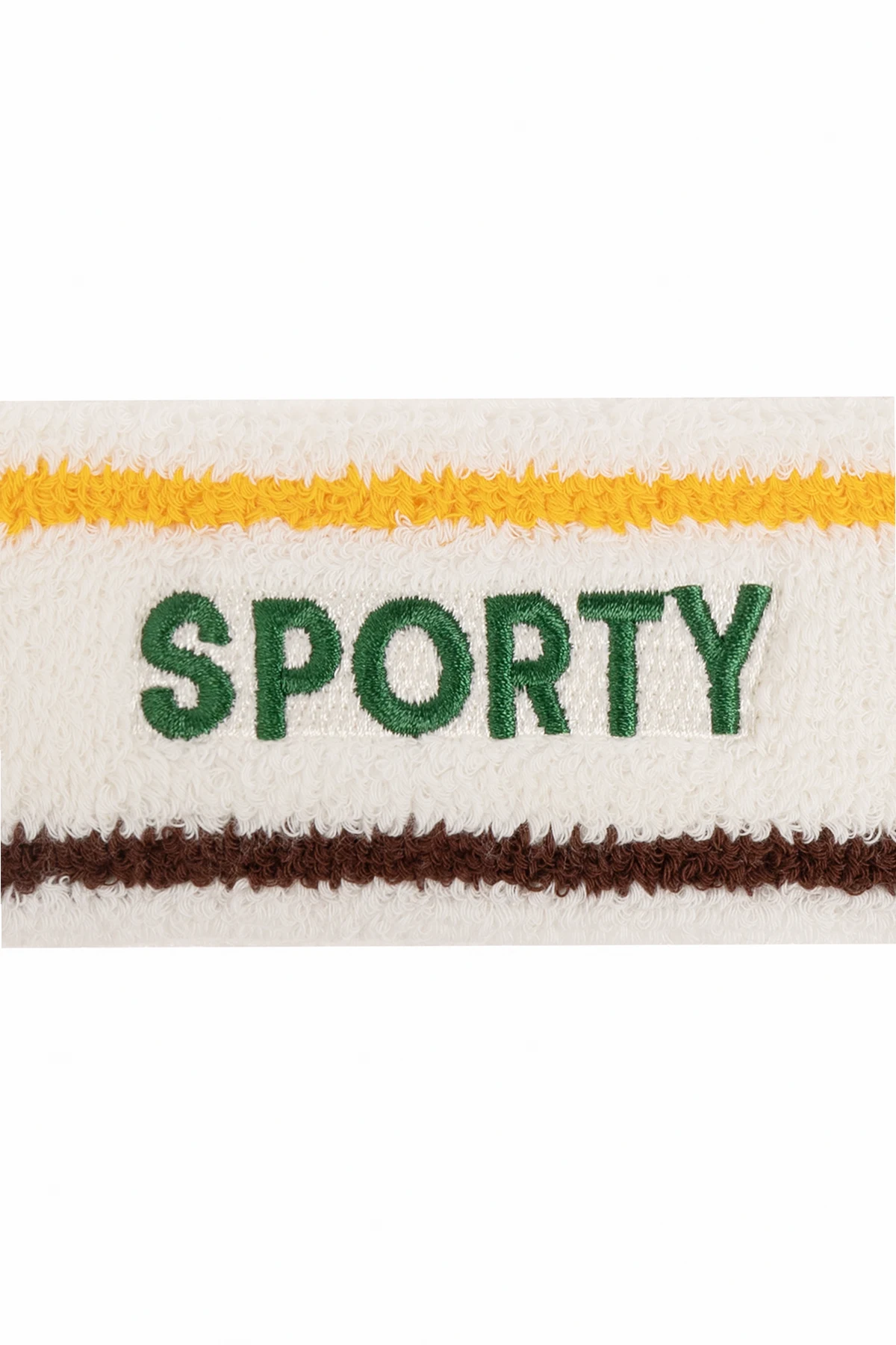 Jej wyjątkowy wzór, składający się z symetrycznych, poziomych pasów w kolorze bieli, żółci i brązu, przełamanych centralnie umieszczonym napisem "SPORTY" na białym tle, nadaje produktowi charakterystycznego, sportowego wyglądu. Zieleń liter sprawia, że napis wyróżnia się, a całość staje się nie tylko funkcjonalnym, ale i modnym dodatkiem do każdej stylizacji.