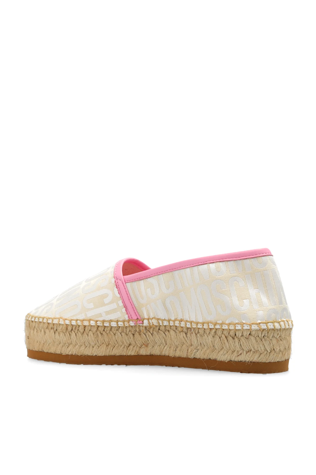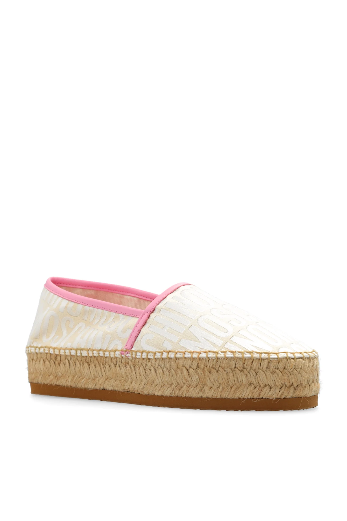 Beżowo-kremowo-różowe espadryle Moschino. Wykonane ze skóry i materiału. Ozdobione wzorem z logo. Brązowa, gumowa podeszwa.