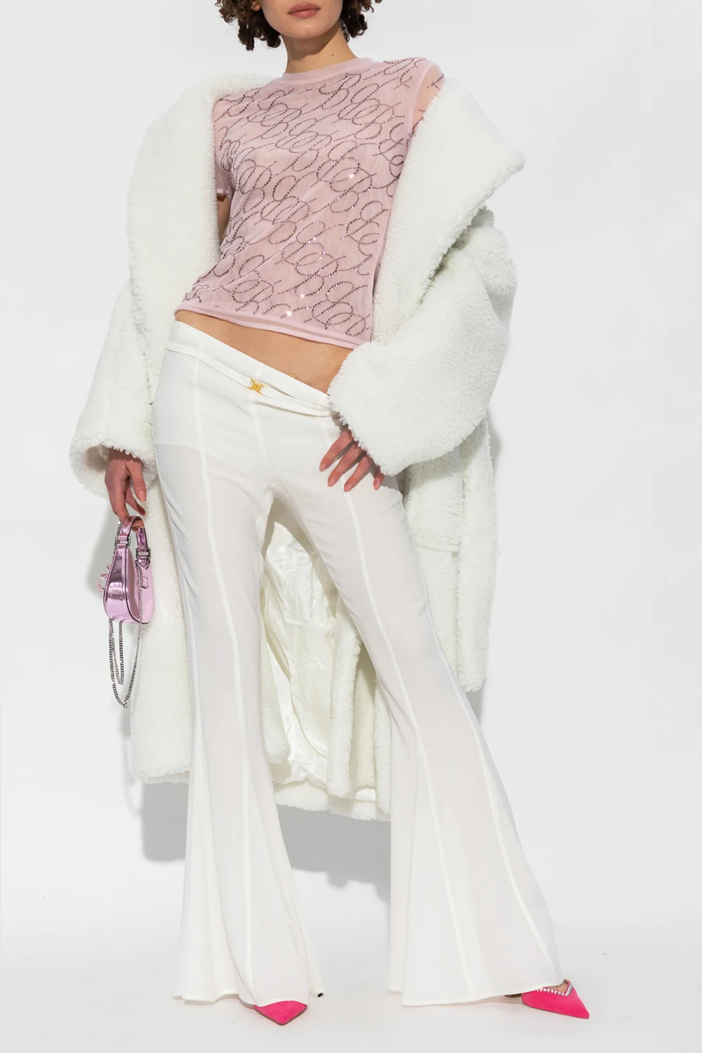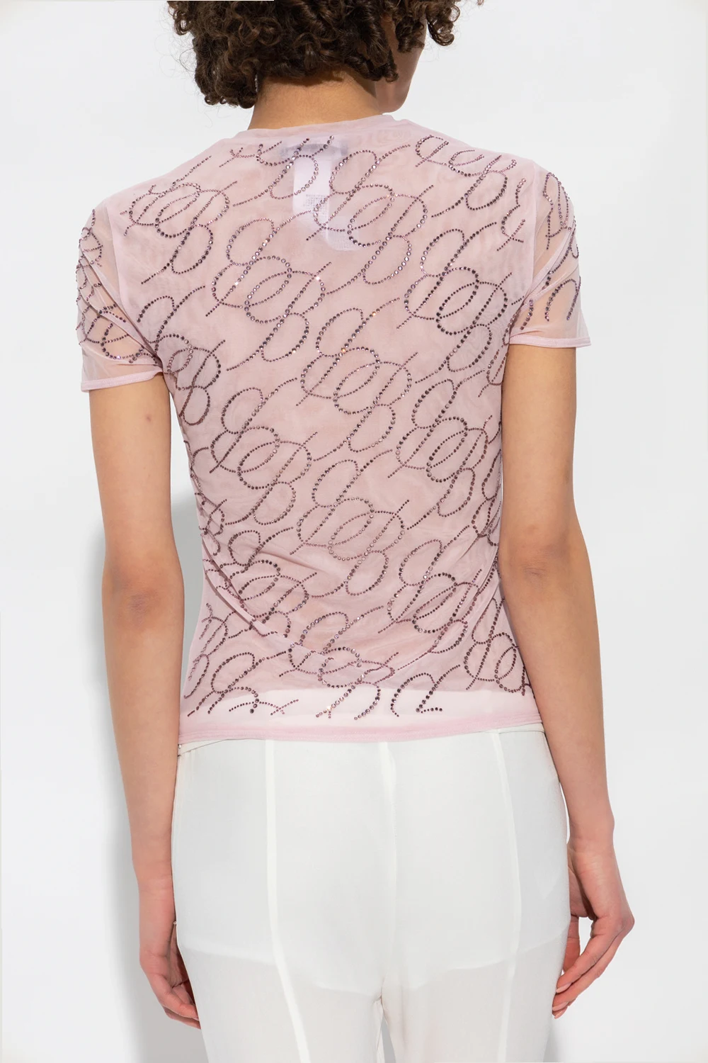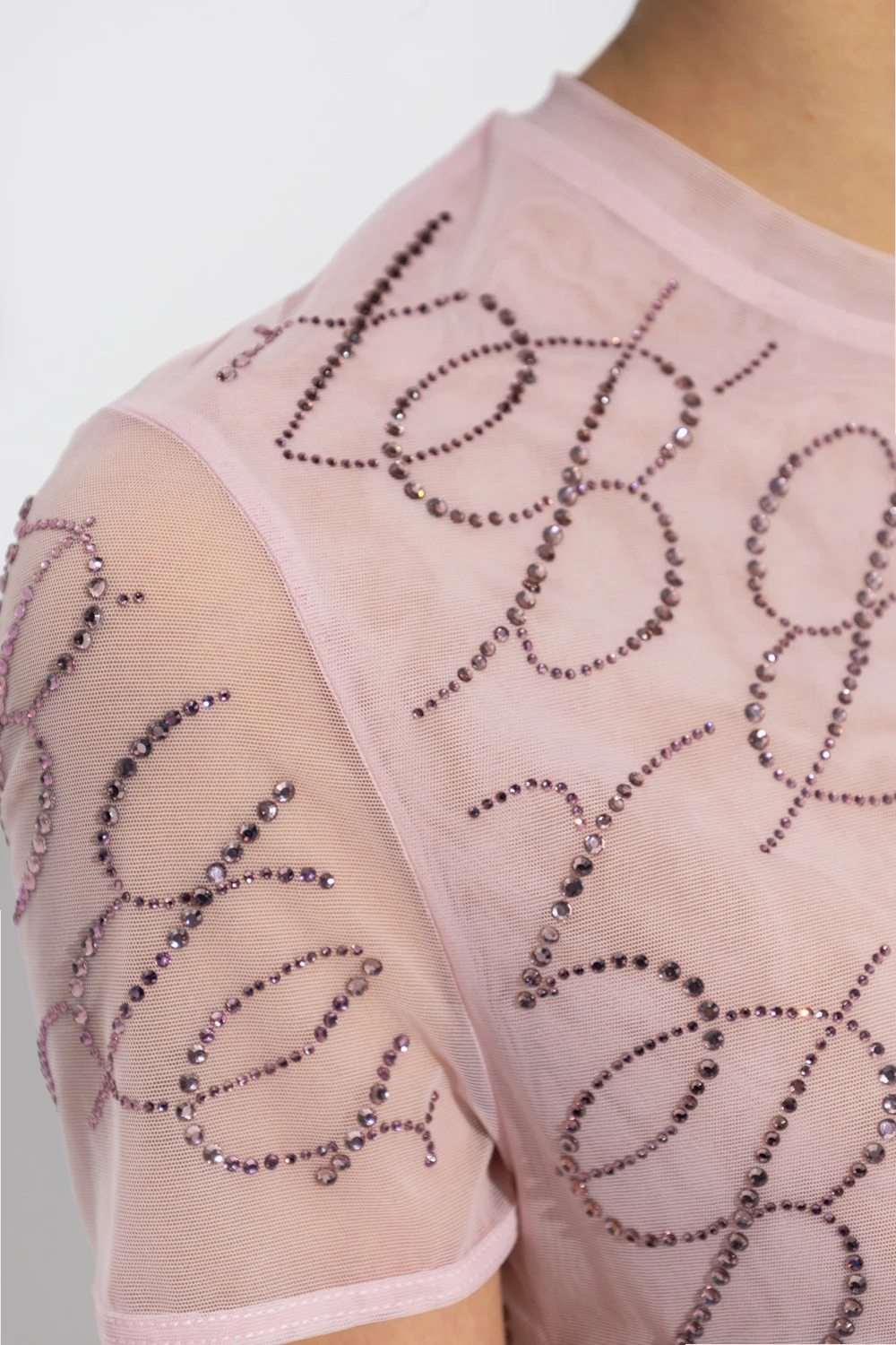 Różowy, transparentny top Blumarine. Ozdobiony połyskującymi wstawkami z logo. Okrągły dekolt. Krótkie rękawy.