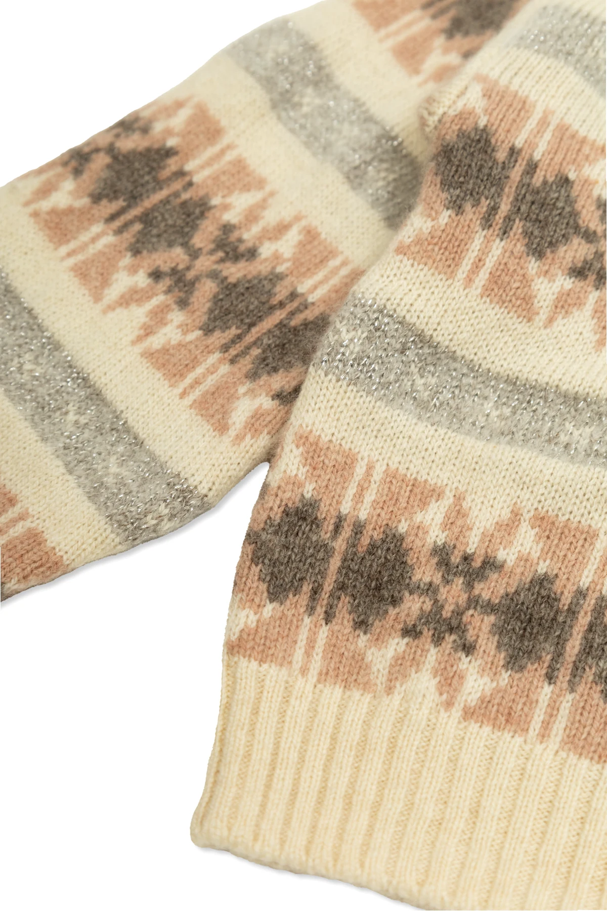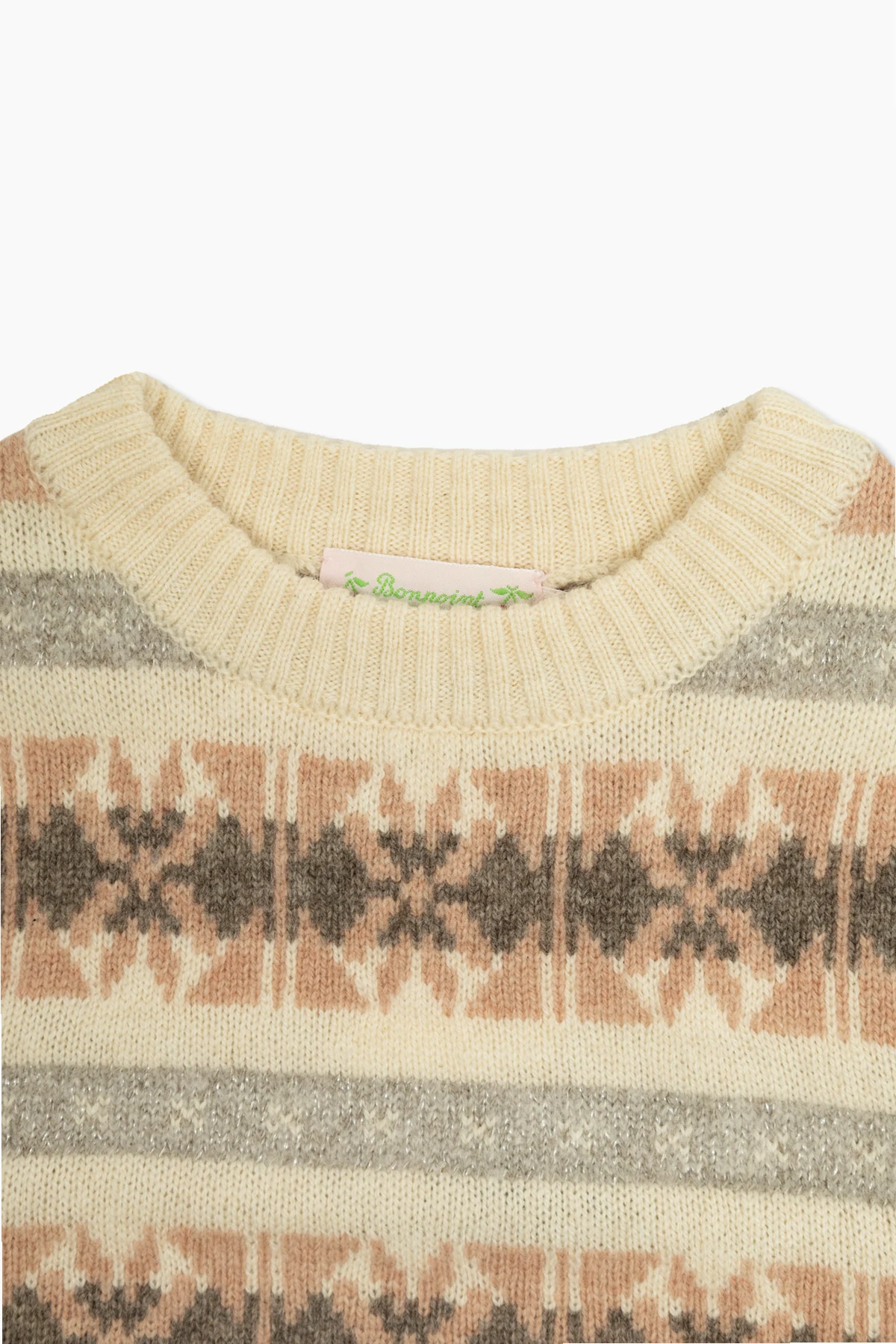 Sweter ‘Greet’ charakteryzuje się klasycznym, zimowym wzorem w paski oraz motywy geometryczne, inspirowane tradycyjnymi nordyckimi motywami. Dominujące kolory to kremowy, szary, beżowy i brązowy, co tworzy harmonijną i elegancką kompozycję. Prosty krój z długimi rękawami oraz okrągłym dekoltem zapewnia komfort noszenia, a ściągacze przy mankietach, u dołu oraz przy szyi gwarantują idealne dopasowanie.