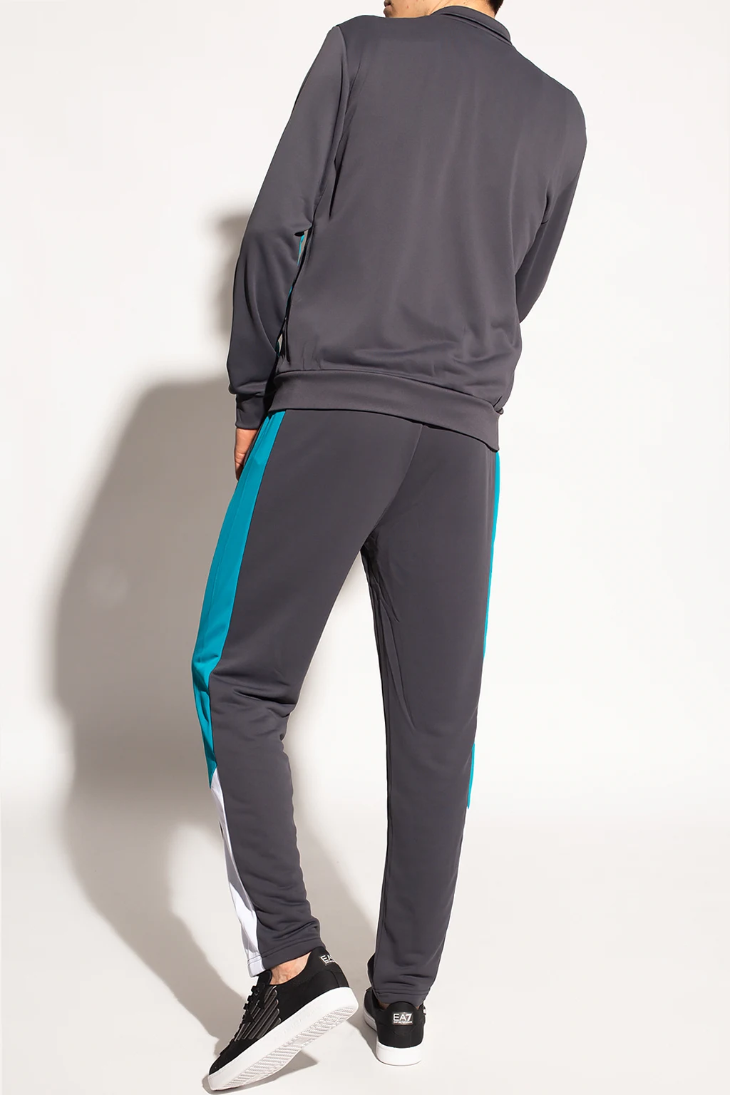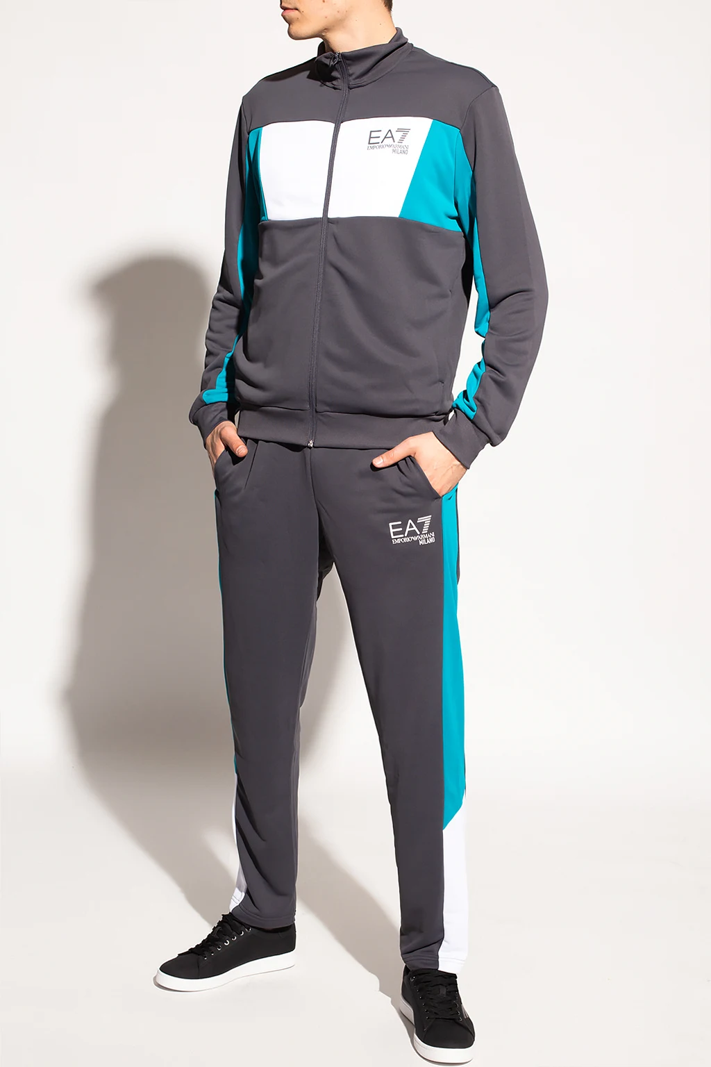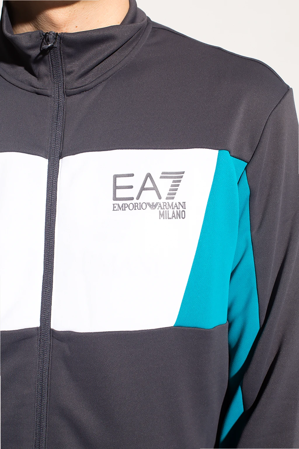 Komplet w kolorze szaro-biało-zielonym: bluza oraz spodnie dresowe EA7 Emporio Armani. Ozdobiony nadrukowanym logo w kolorze szarym. Bluza ze stójką, zapinana na zamek. Spodnie dresowe z dwiema wsuwanymi kieszeniami.
