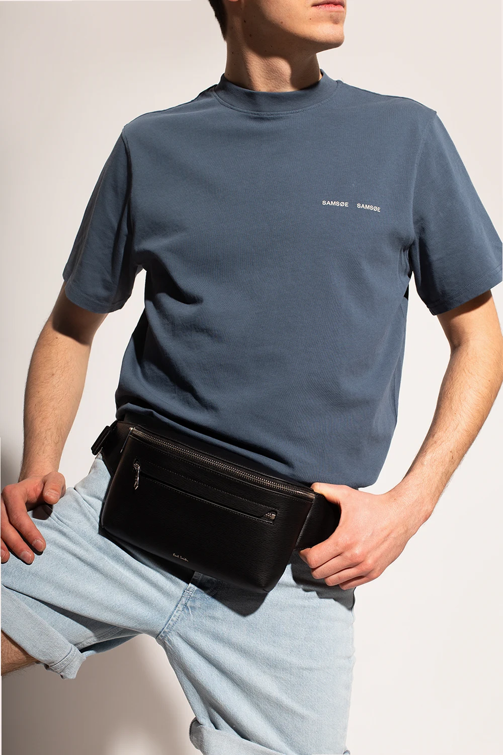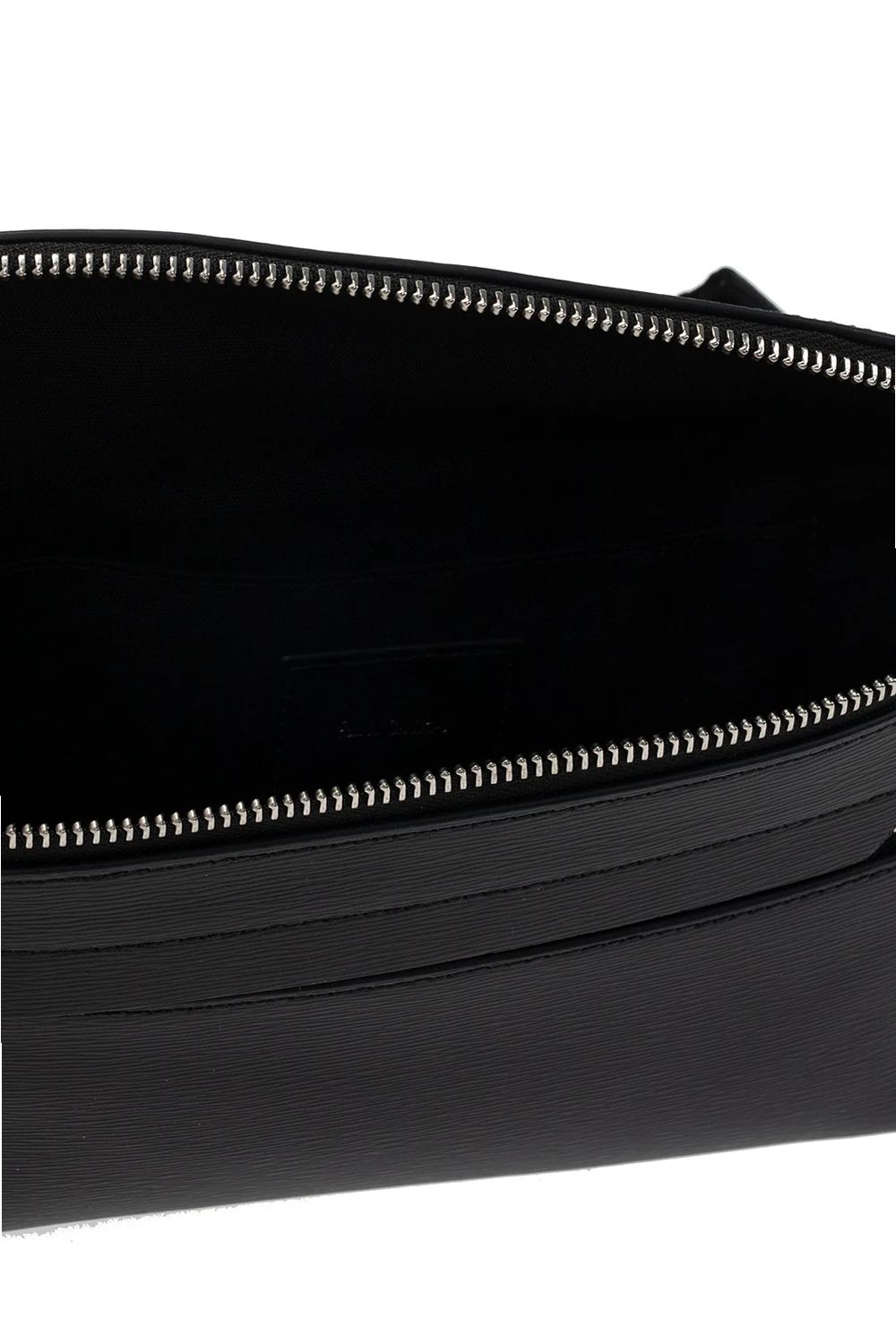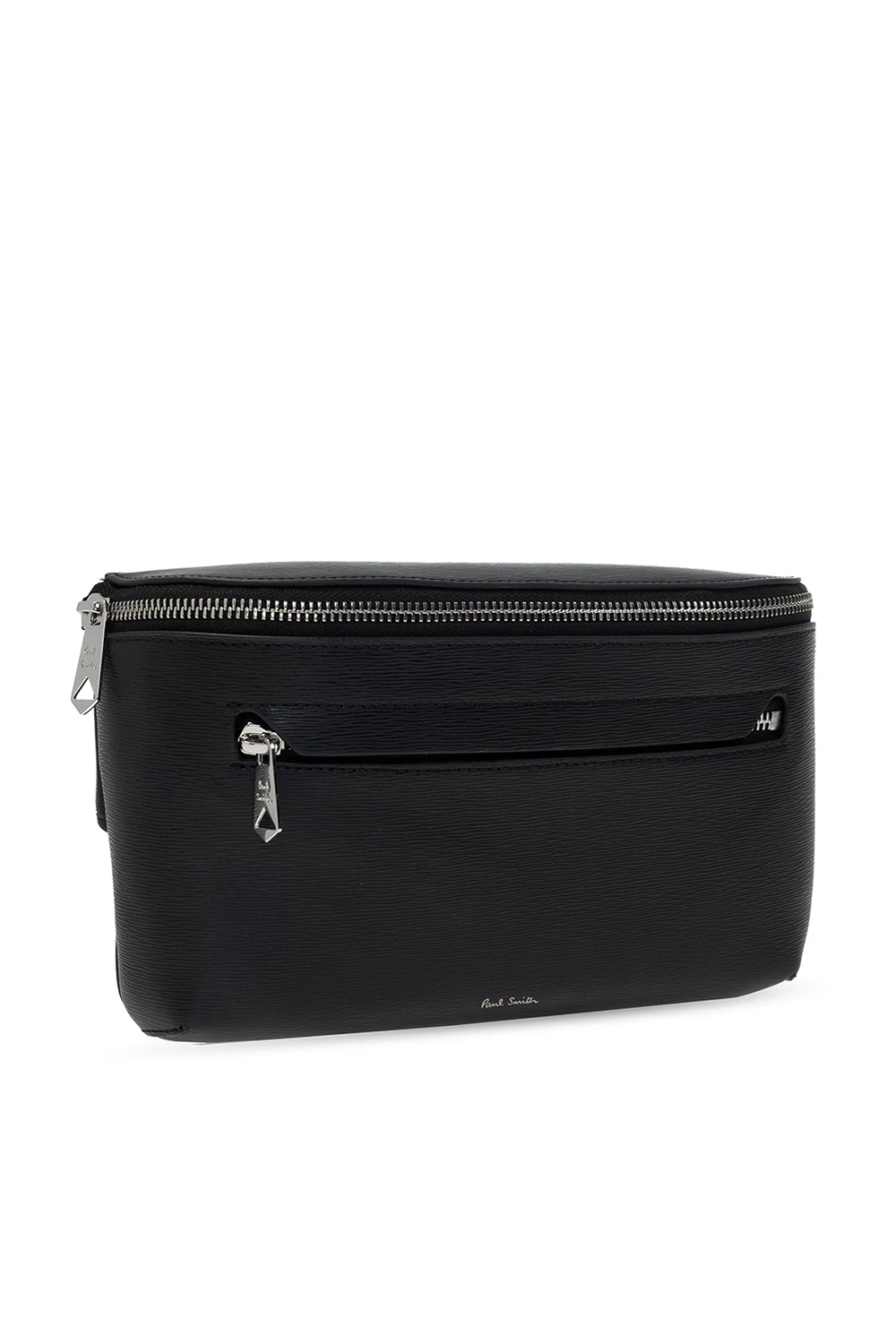 Czarna torba na pas Paul Smith. Wykonana ze skóry o specjalnej fakturze. Zamykana na zamek. Ozdobiona nadrukowanym logo w kolorze srebrnym. Z przodu kieszeń zamykana na zamek. Regulowany pasek biodrowy. Wewnątrz komora z wsuwaną kieszenią.
