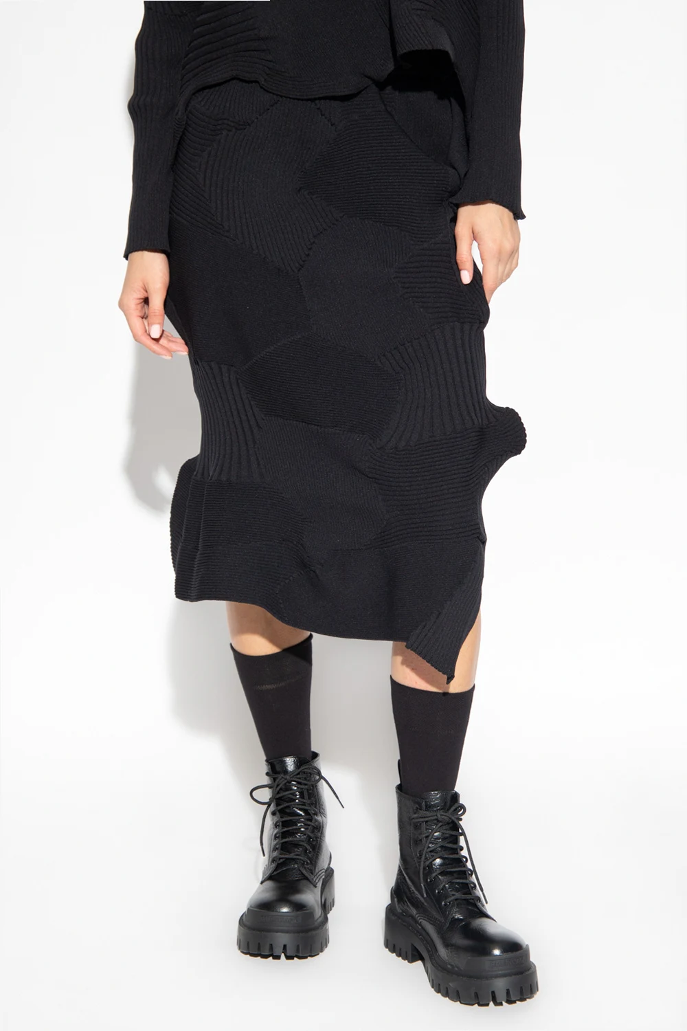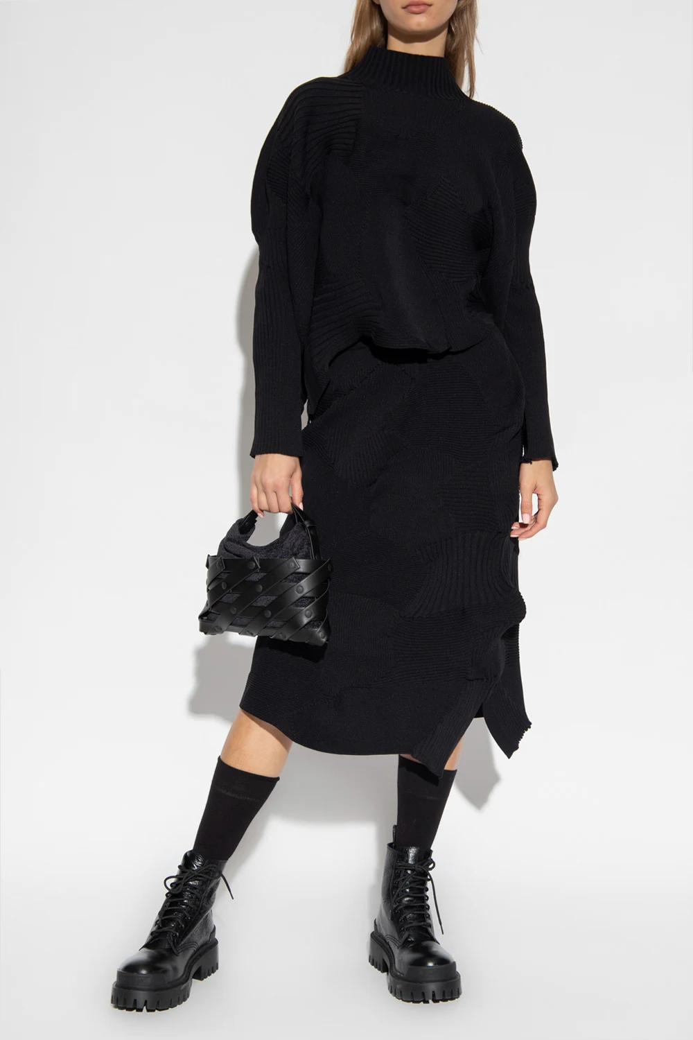 Czarna, prążkowana spódnica Issey Miyake. W pasie wszyta guma. Z boku rozcięcie.