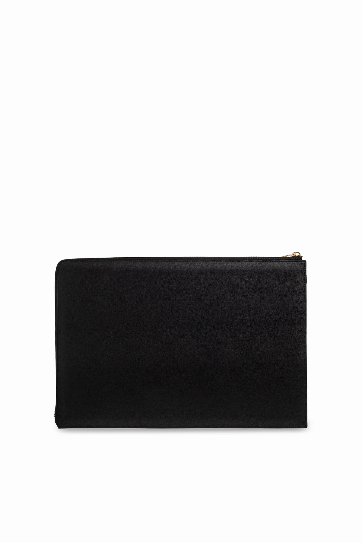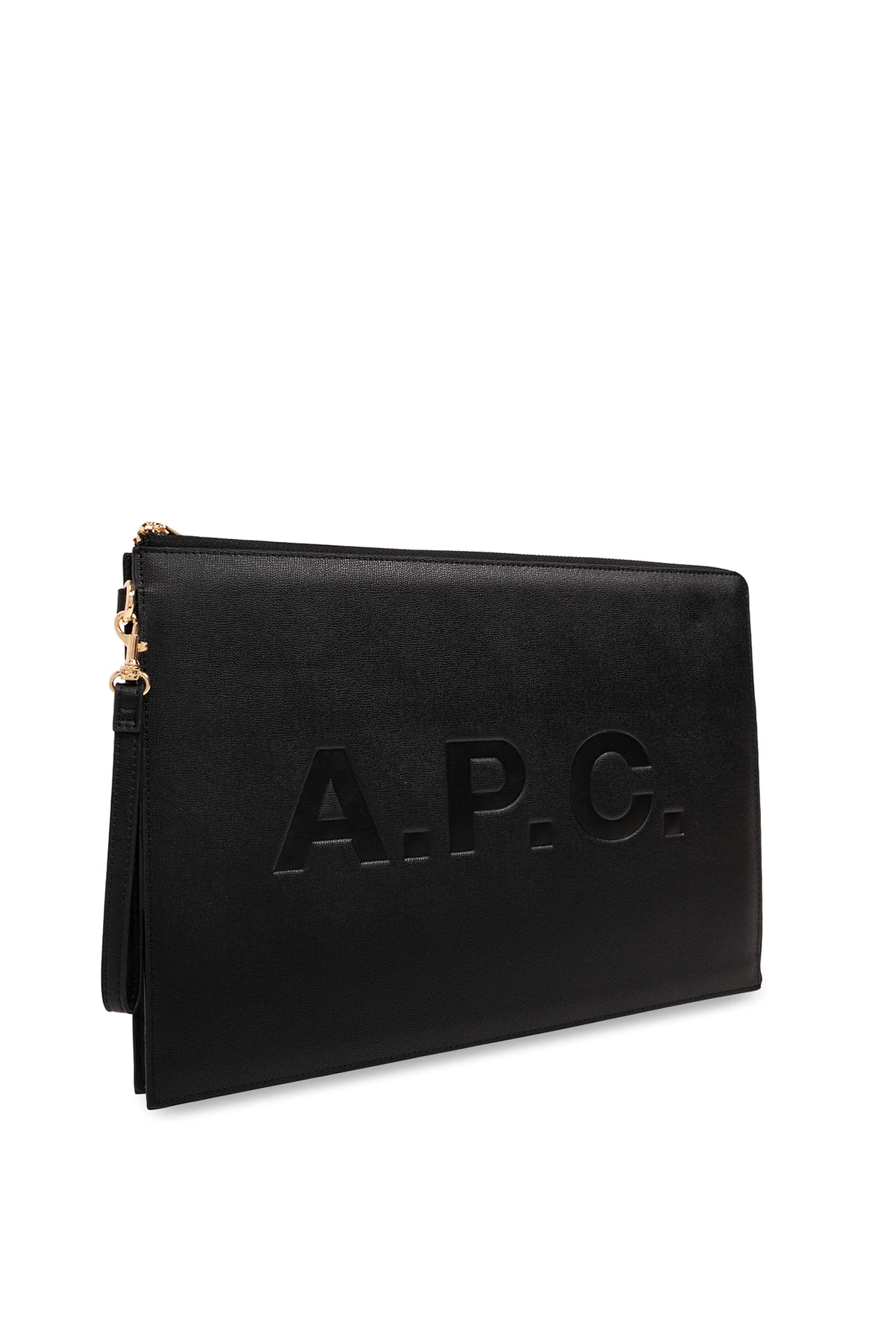 Czarna aktówka A.P.C. Zamykana na zamek. Z przodu ozdobiona wytłoczonym logo. Wewnątrz komora oraz trzy wsuwane kieszenie. Metalowe elementy w kolorze złotym.