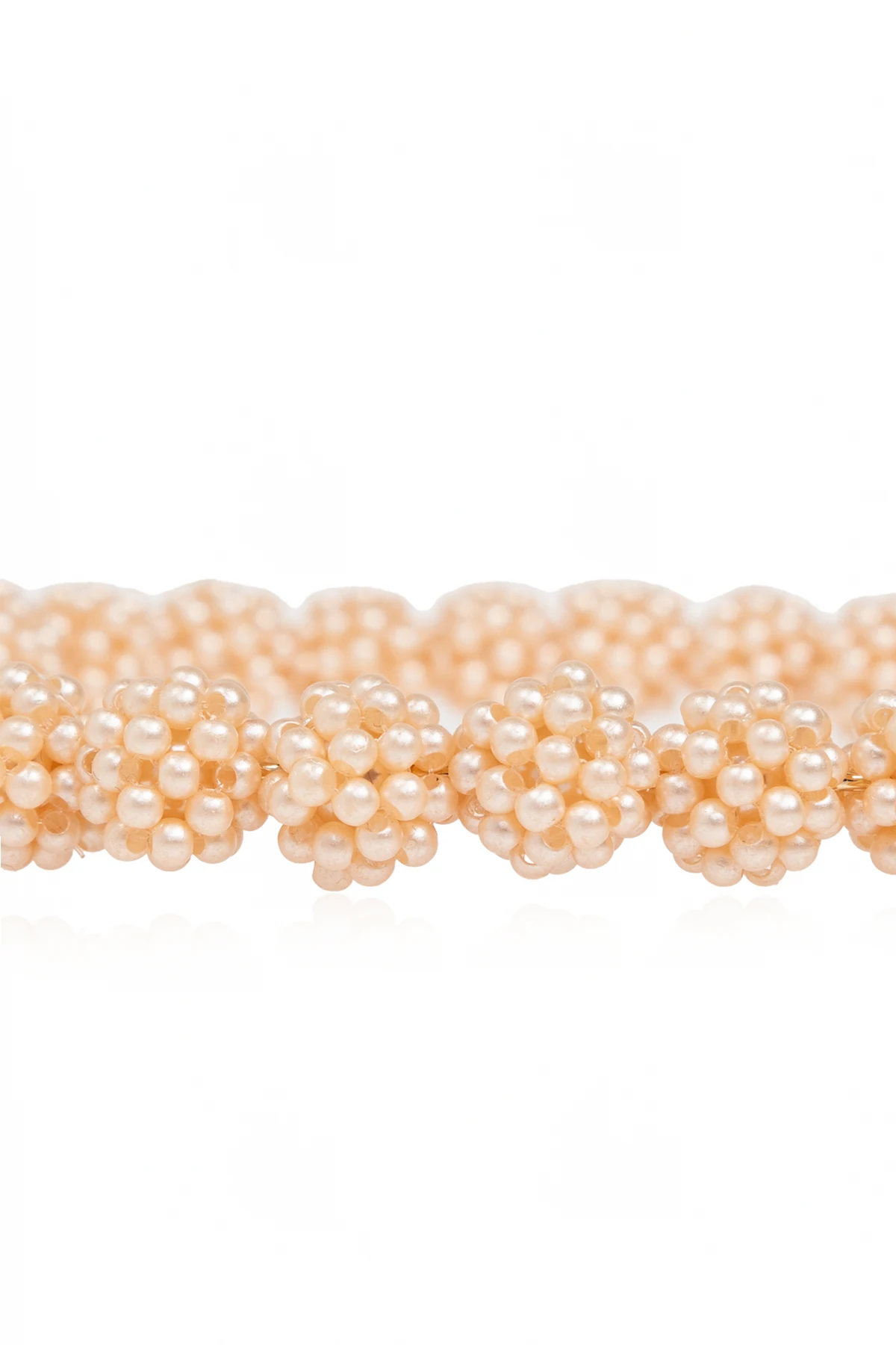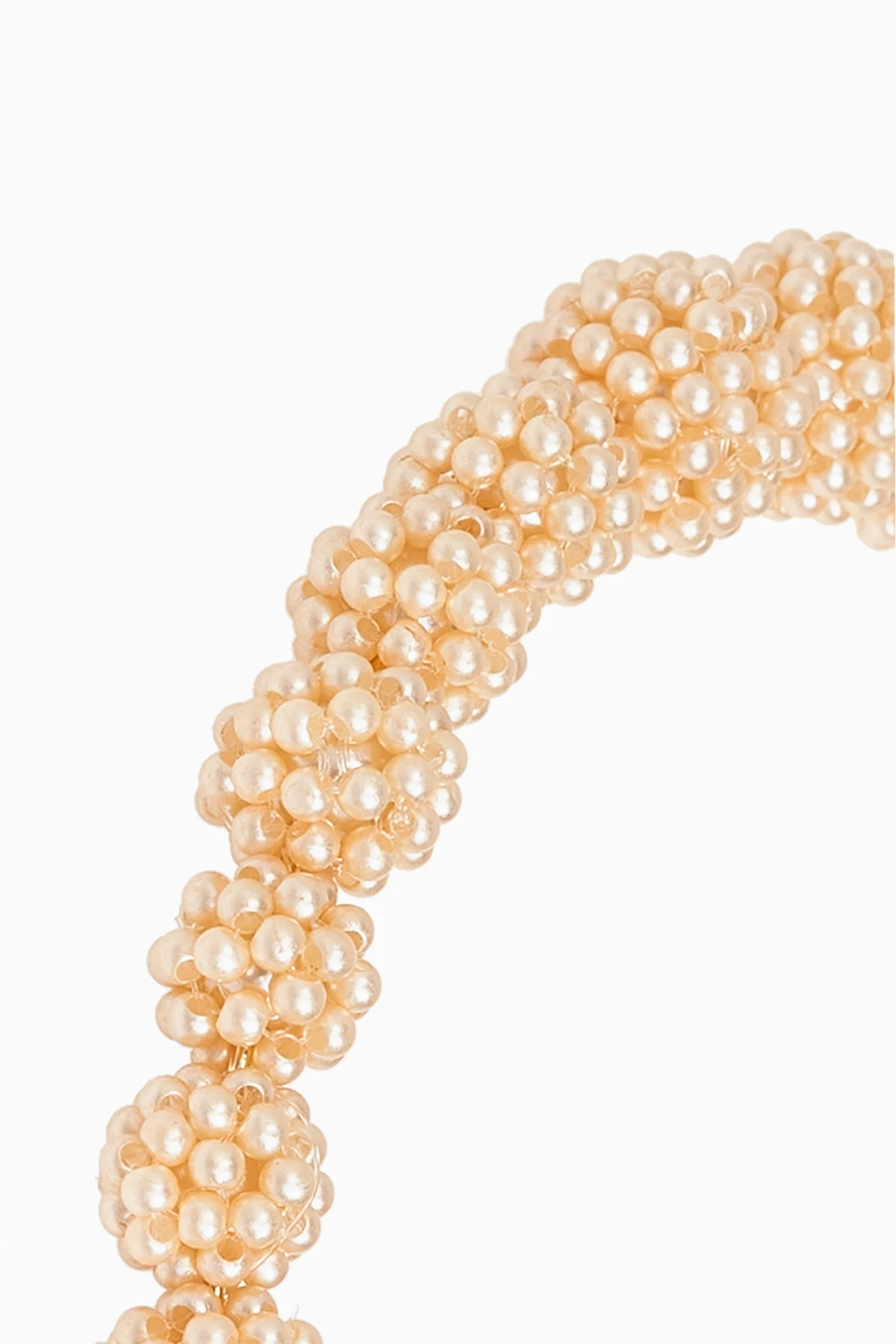 Cała powierzchnia opaski jest misternie zdobiona perłowymi kulkami w różnej wielkości, co tworzy efekt bogatego splotu i nadaje jej niepowtarzalny, luksusowy wygląd. Dominujący, kremowy odcień kulek doskonale imituje naturalne perły, dodając opasce wyjątkowego blasku.