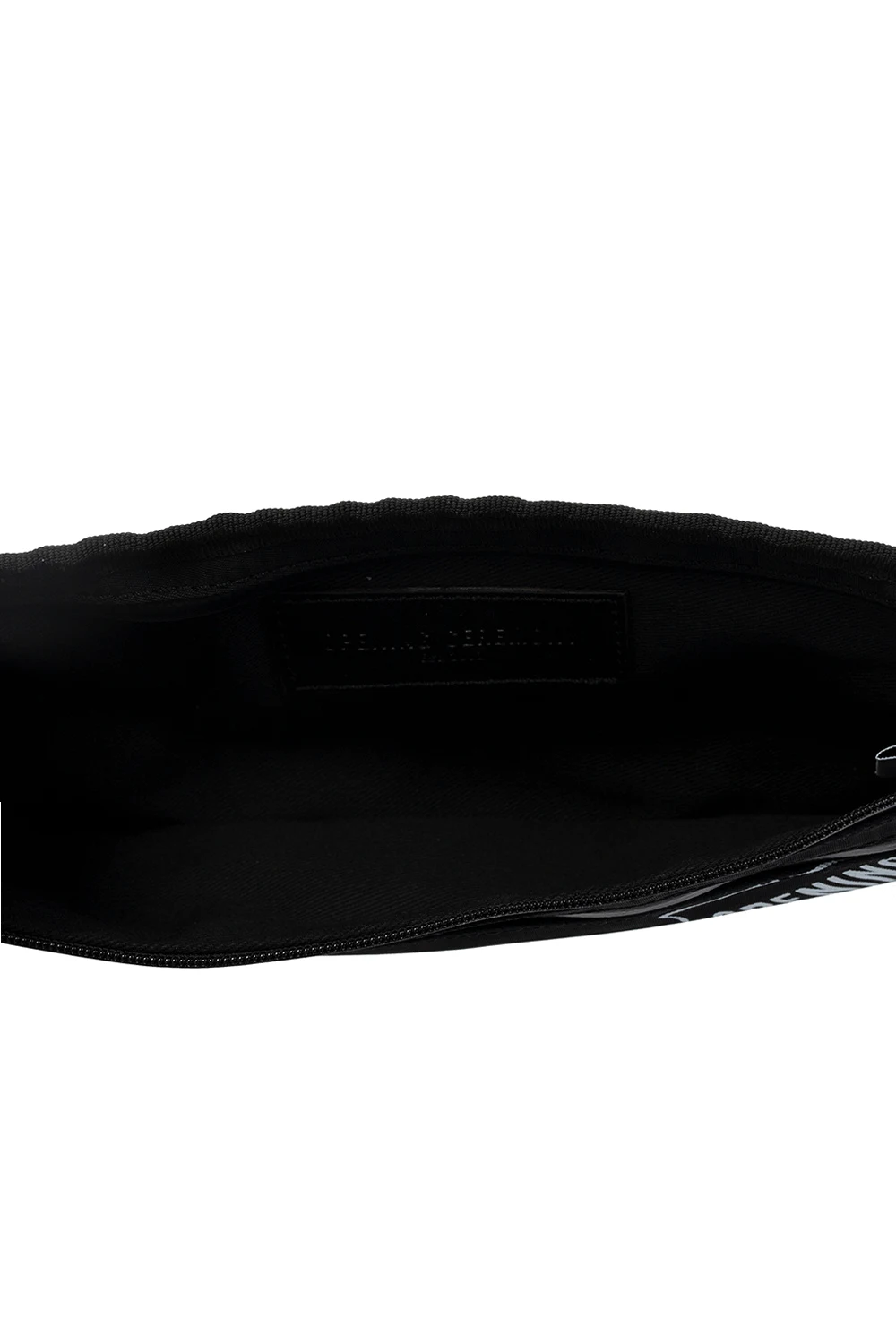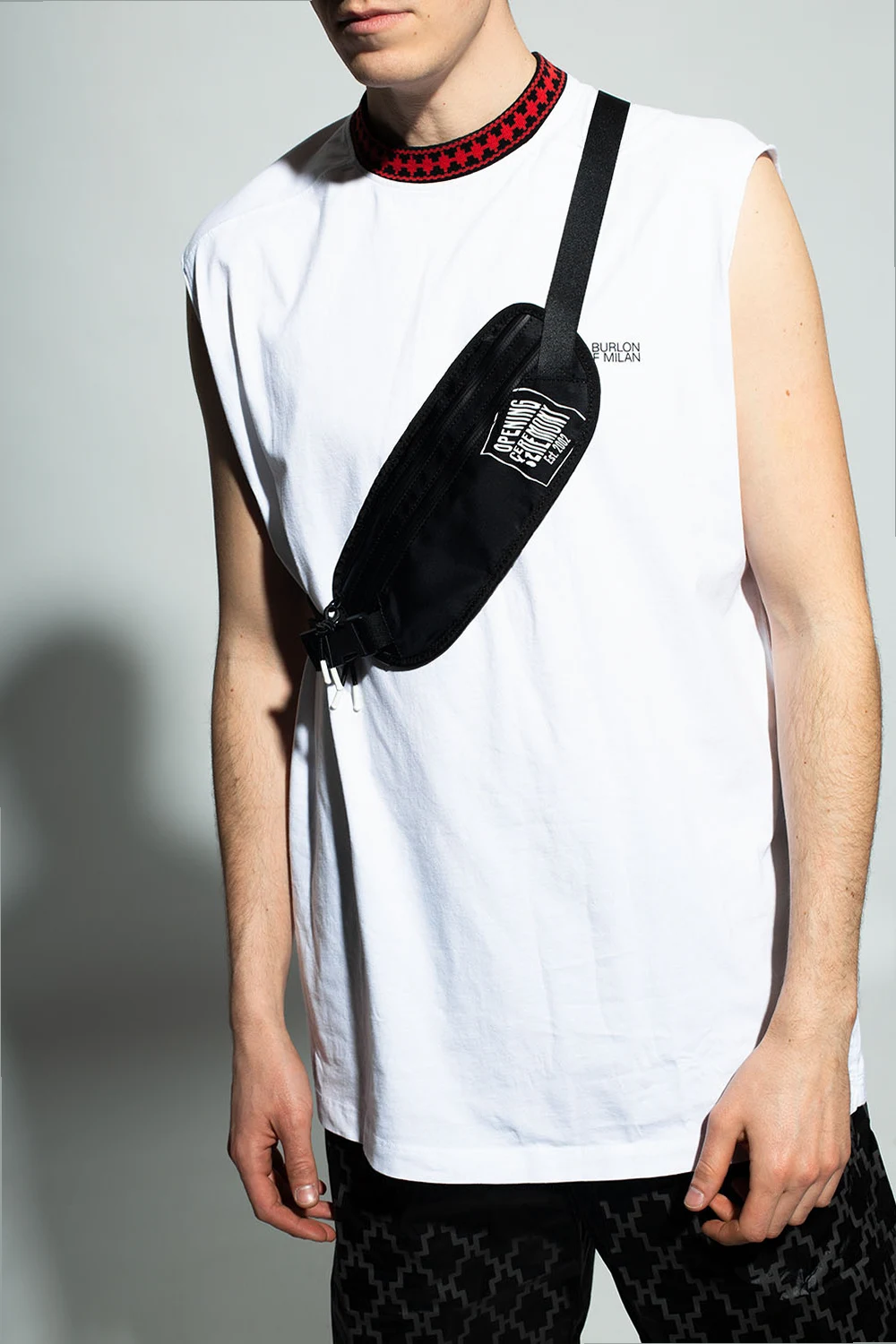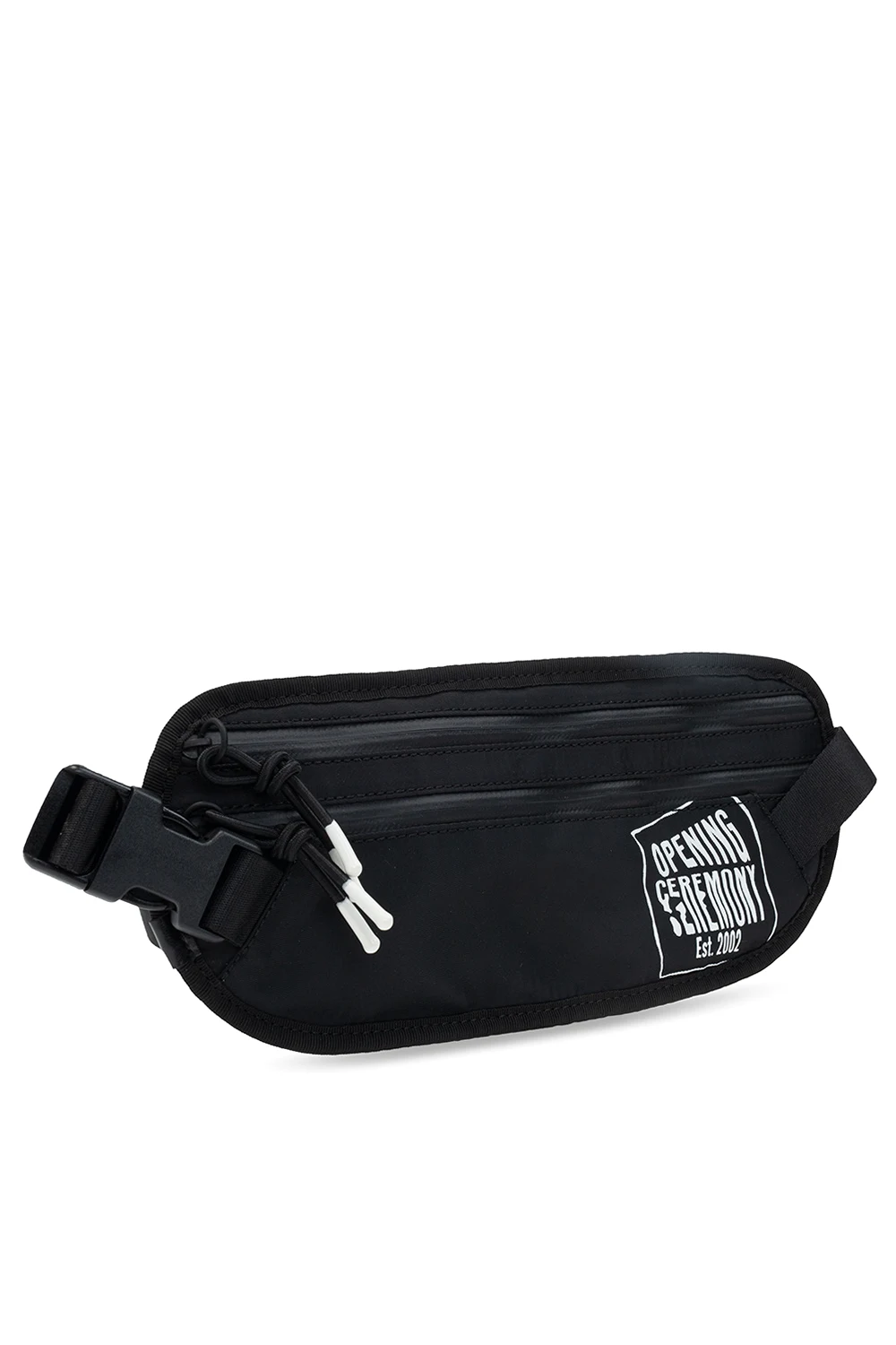 Czarna torba na pas Opening Ceremony. Zamykana na zamek. Z przodu kieszeń zamykana na zamek. Ozdobiona nadrukowanym wzorem z logo w kolorze białym. Pas biodrowy z możliwością regulacji długości. Metalowe wykończenie w kolorze czarnym.