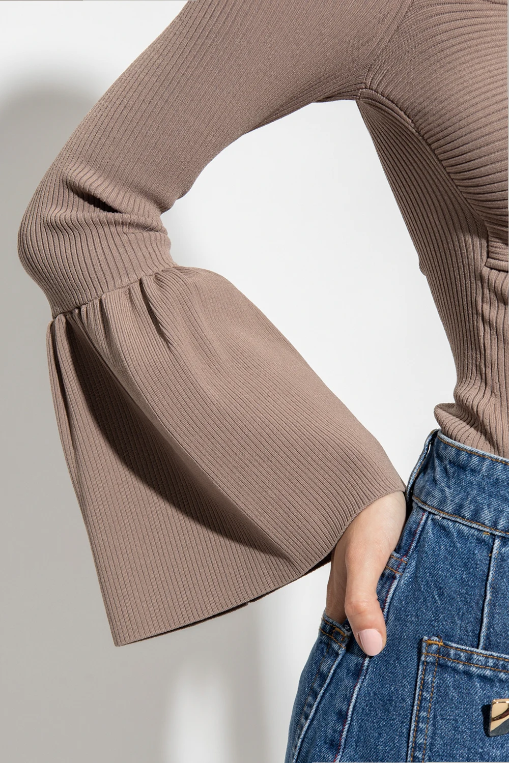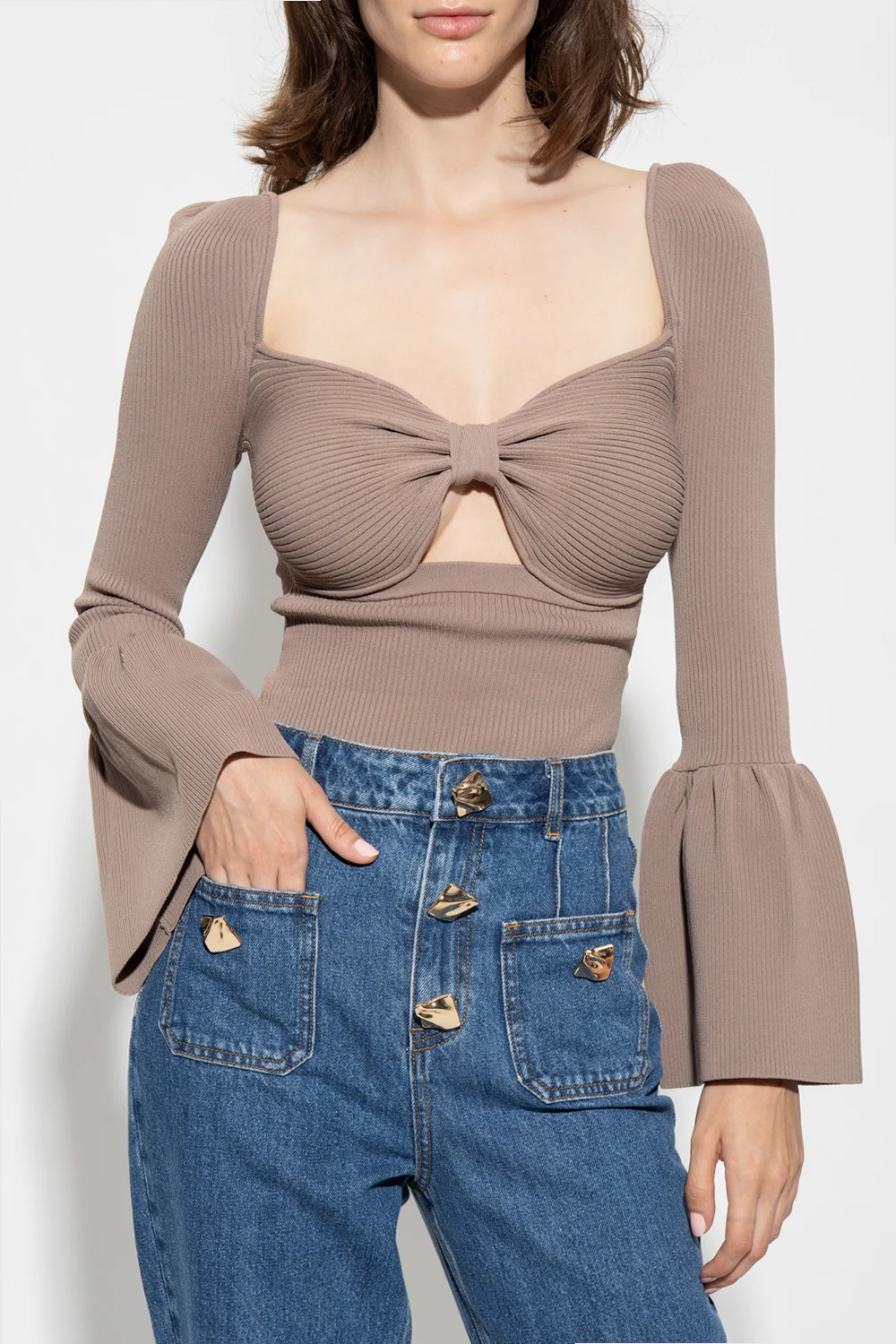 Brązowoszary, prążkowany top o dopasowanym kroju Self-Portrait. Z przodu ozdobiony węzłem oraz dekoracyjnym wycięciem. Kwadratowy dekolt, długie rękawy zakończone falbaną.