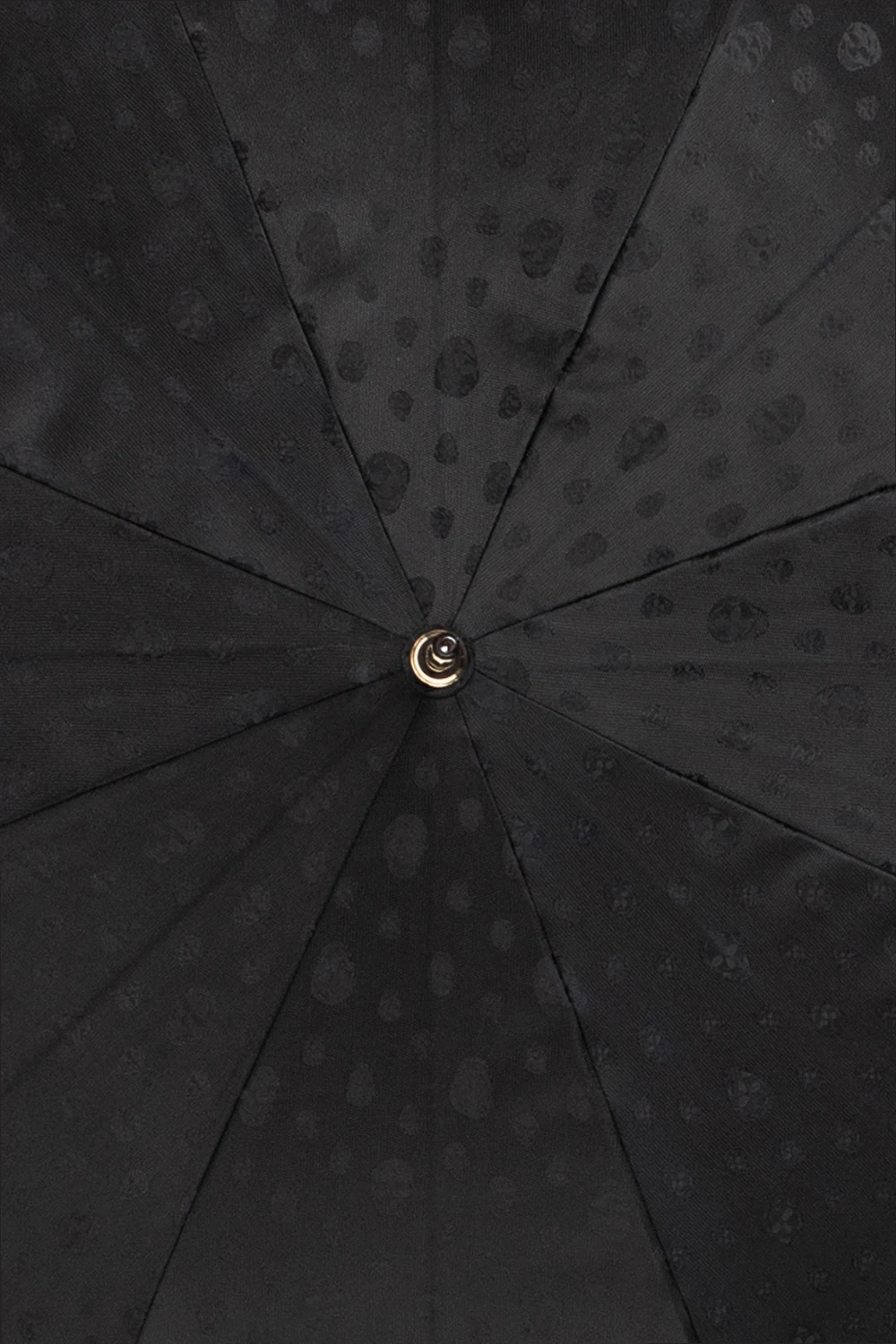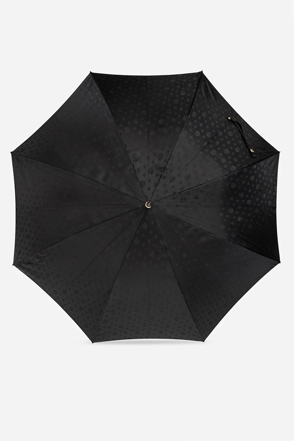 Duży, czarny parasol Alexander McQueen. Wykonany z fakturowanej tkaniny z charakterystycznym motywem czaszki. Zapinany na zatrzask. Rączka z motywem czaszki wysadzana połyskującymi kryształami. Metalowe elementy w kolorze złotym z wygrawerowanym logo.