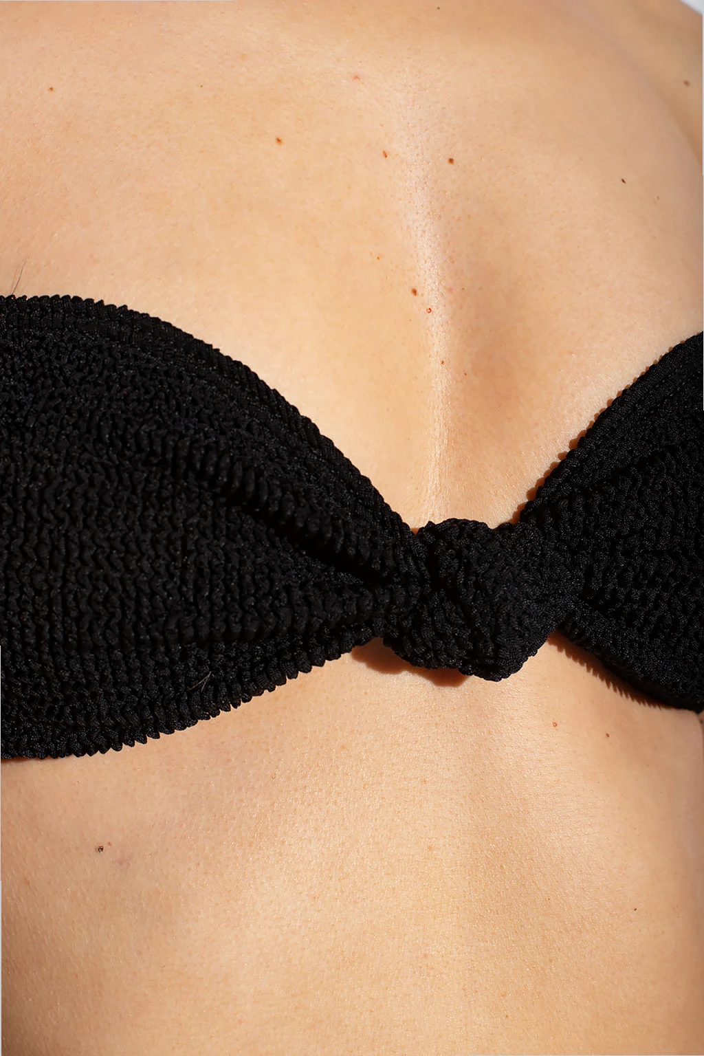 Czarna, prążkowana góra od kostiumu kąpielowego, model ‘Sahara’ Bond-Eye. Wykonana z materiałów z recyklingu. Z przodu dekoracyjne wiązanie. Wykończona gumą.