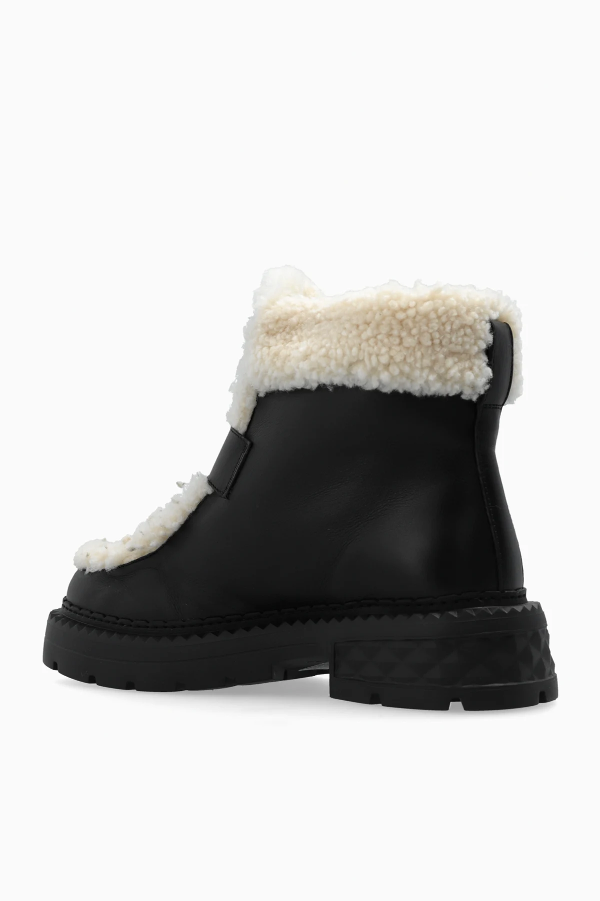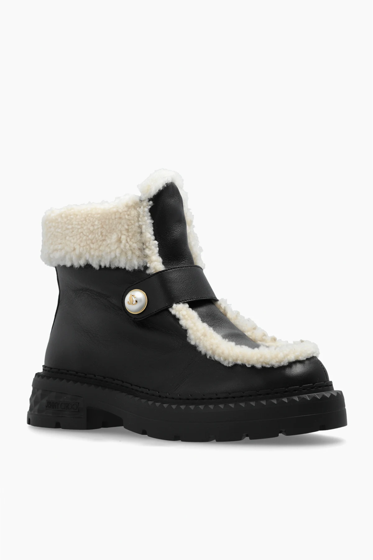 Gruba, platformowa podeszwa z bieżnikiem gwarantuje stabilność i wygodę podczas chodzenia. Wkładka z logiem projektanta „Jimmy Choo” wewnątrz buta potwierdza jego ekskluzywny charakter. Detale, takie jak ozdobny guzik i widoczne futro na krawędziach cholewki oraz języka buta, nadają botkom unikalnego wyglądu.