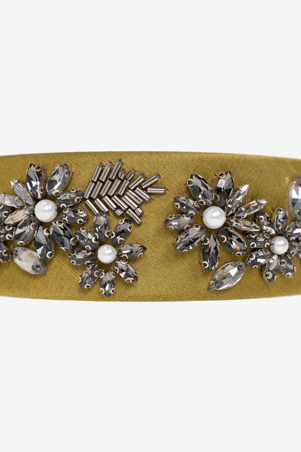 Zielona opaska Erdem. Wykonana z materiału o satynowym wykończeniu. Ozdobiona połyskującymi aplikacjami z motywem roślinnym ze szklanych kamieni w kolorze srebrnym.