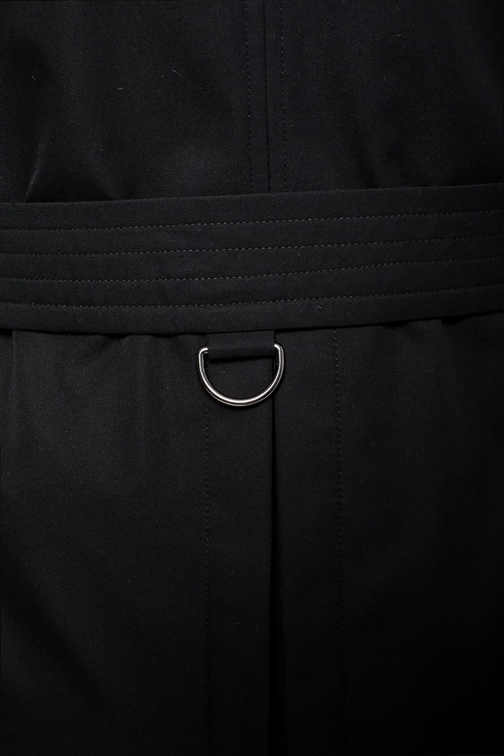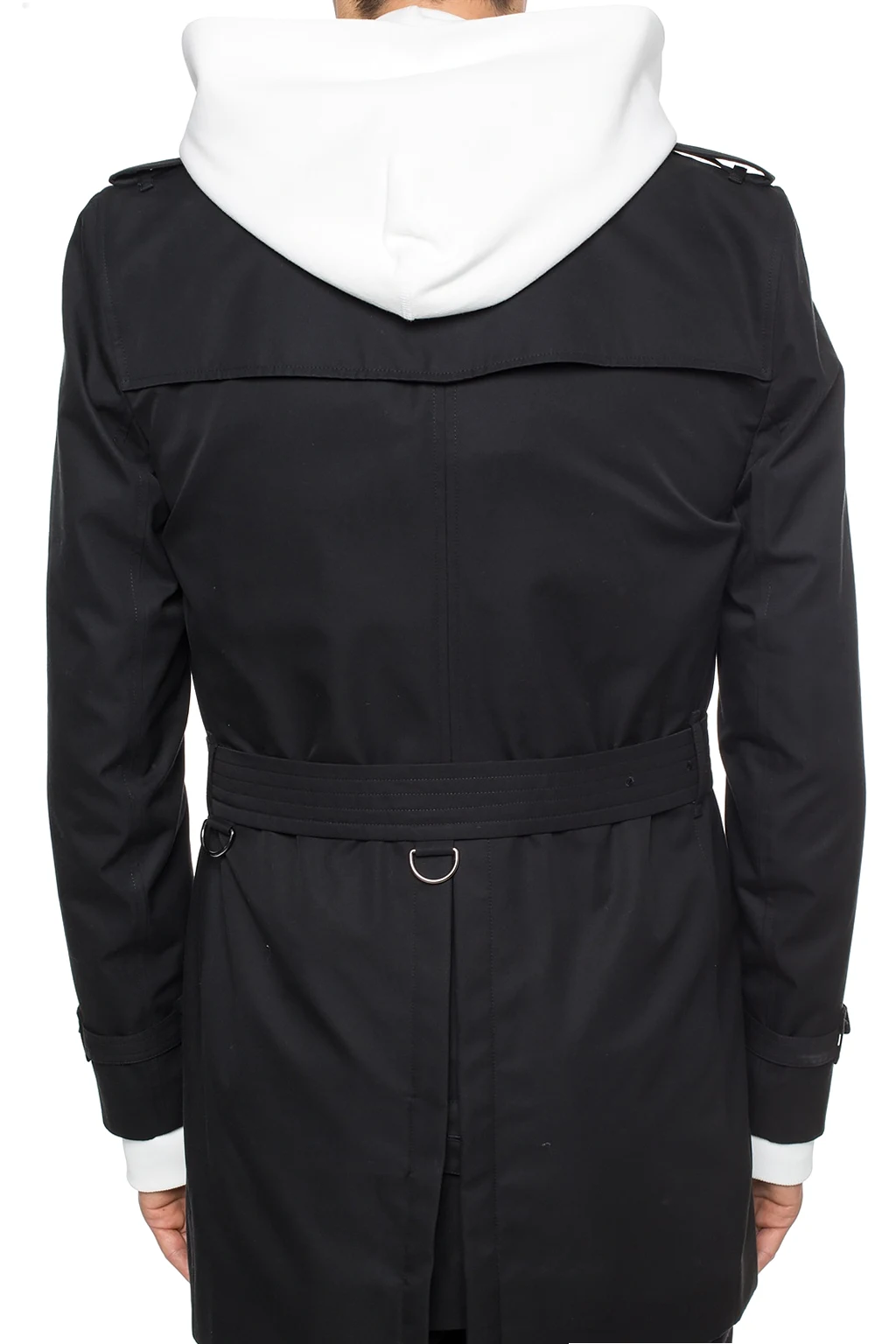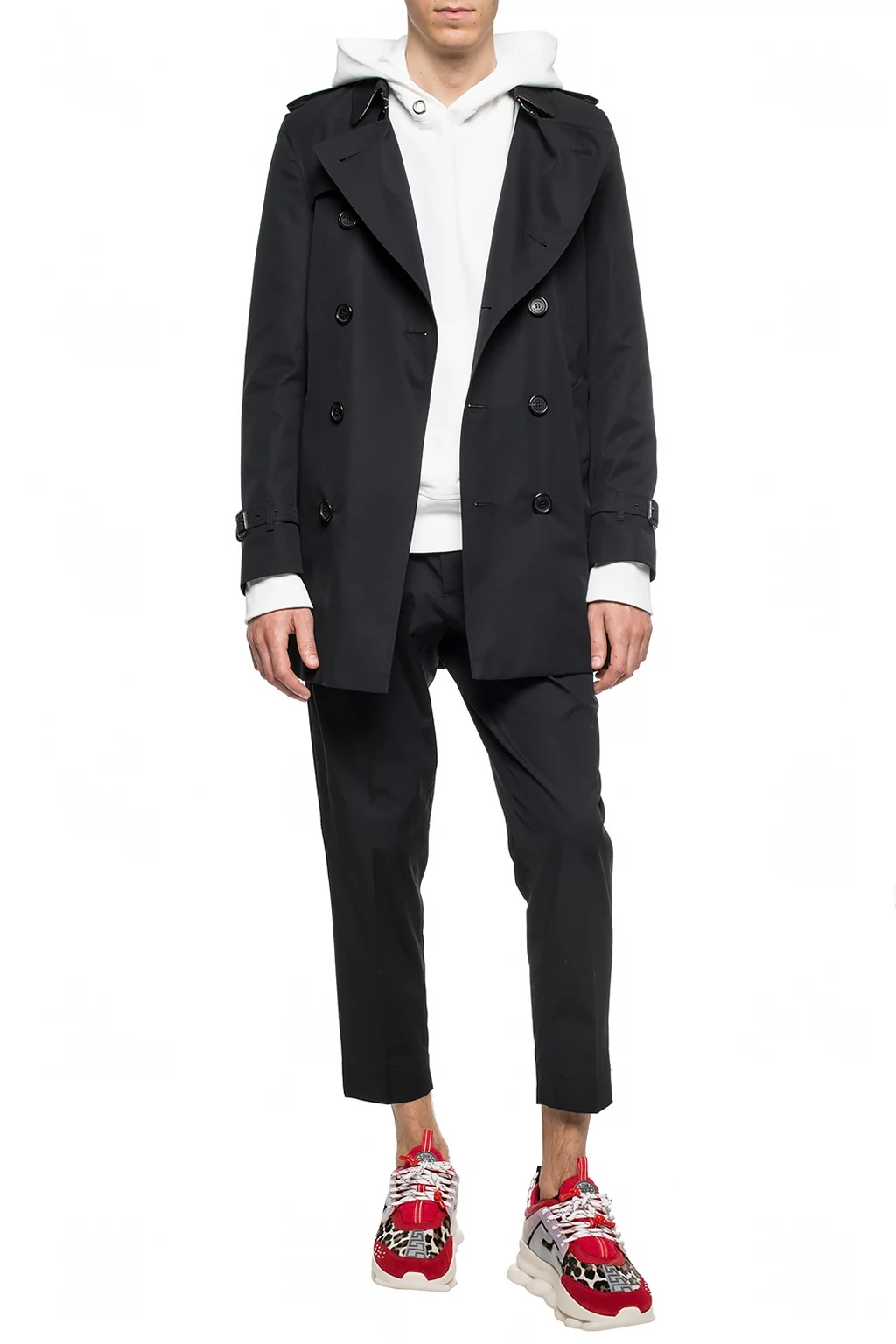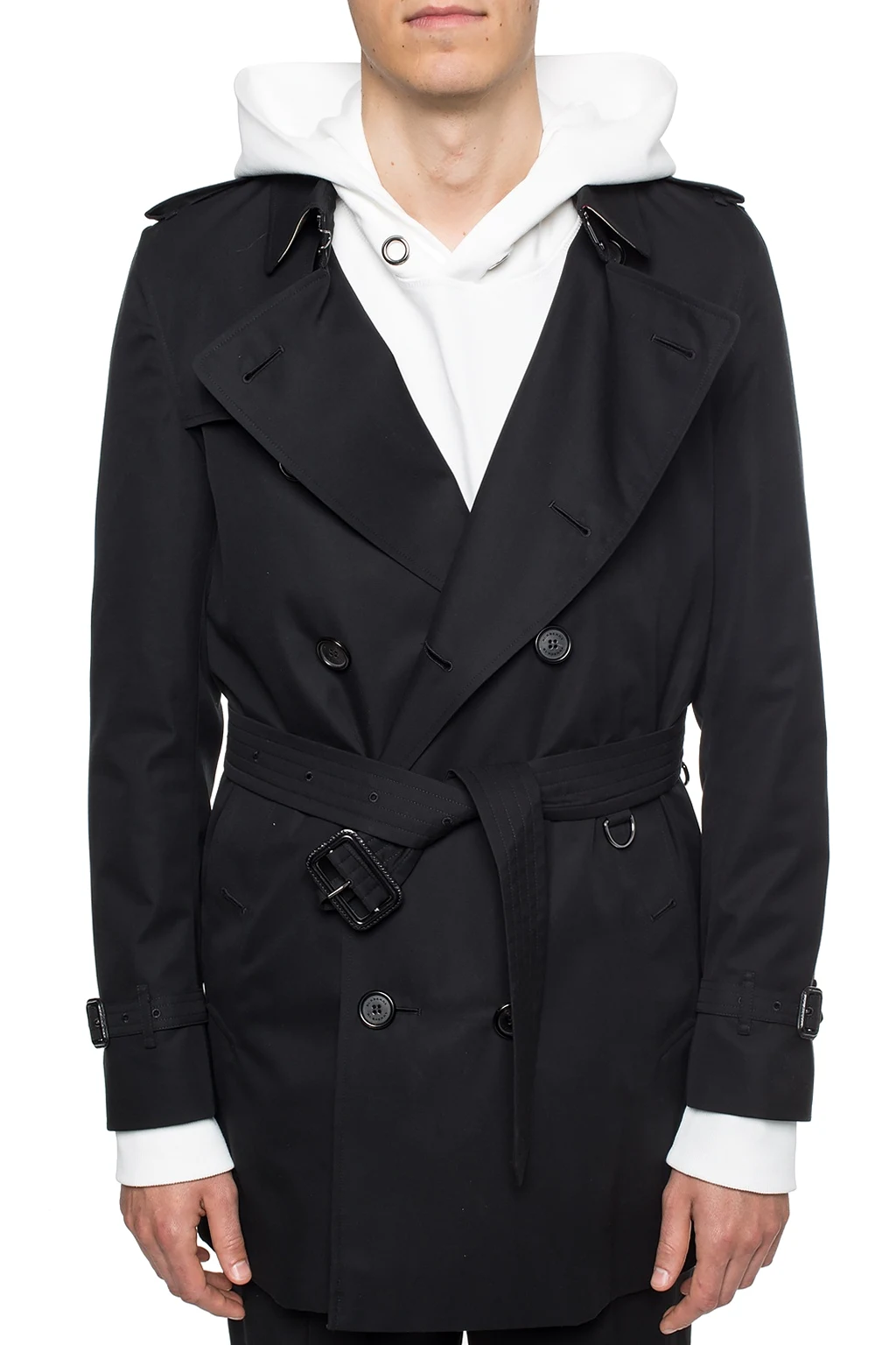 Czarny, bawełniany, dwurzędowy trencz, model 'The Kensington' Burberry. Zapinany na guziki. Na ramionach pagony. Z przodu dwie kieszenie zapinane na guzik. W talii pasek z klamrą. Z tyłu pojedyncze rozcięcie. Bawełniana warstwa wewnętrzna ozdobiona charakterystyczną dla marki kratą w kolorze beżowo-czerwono-czarnym.