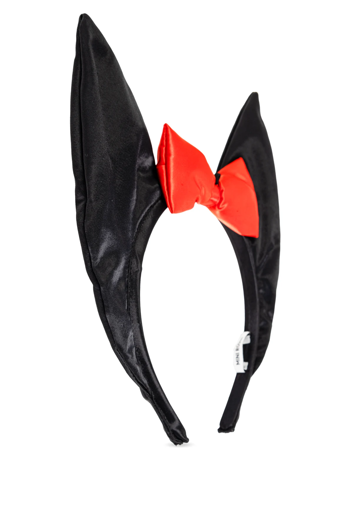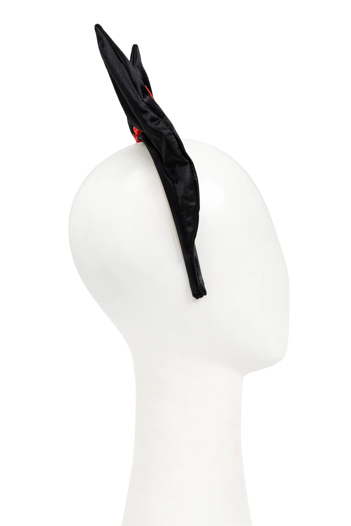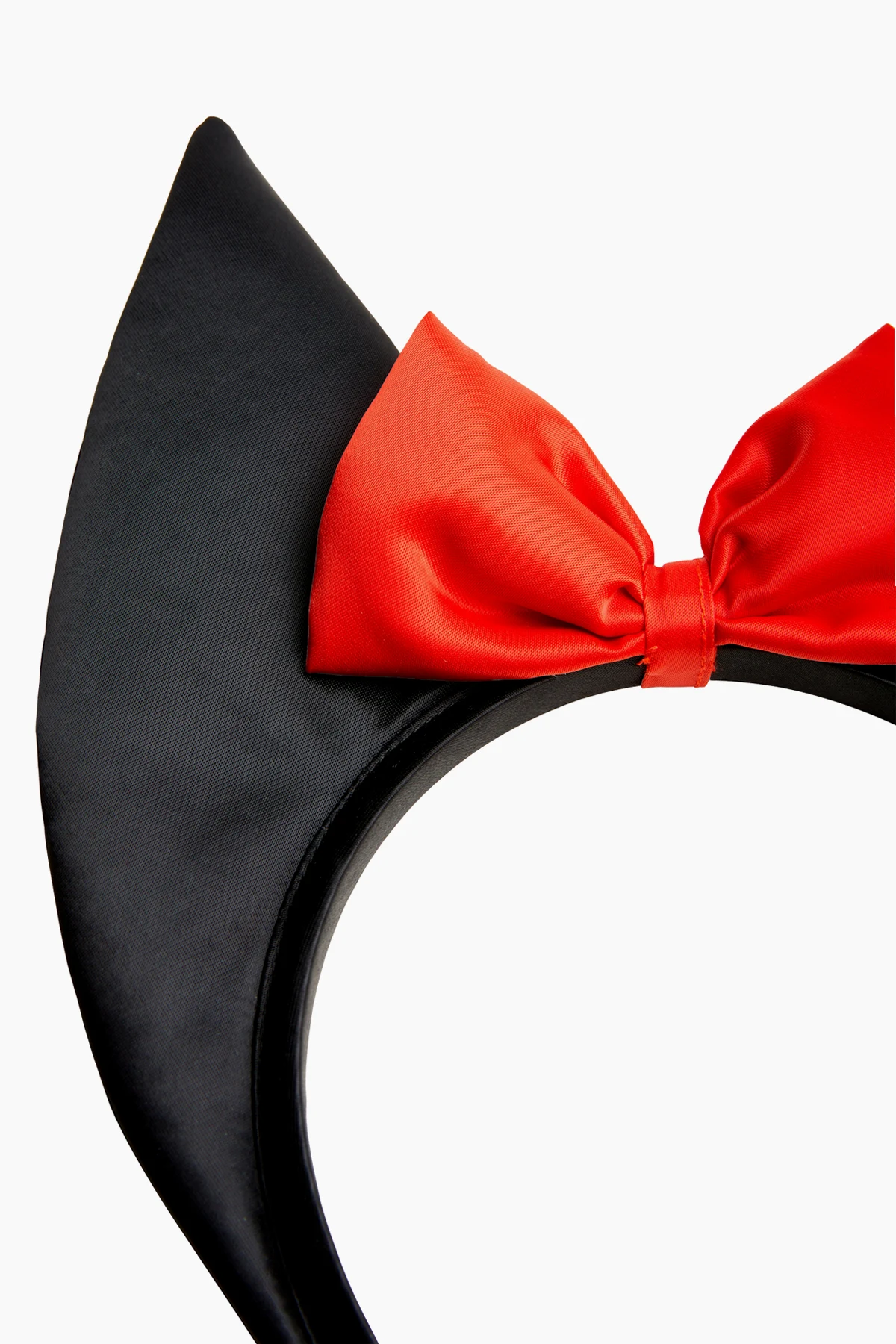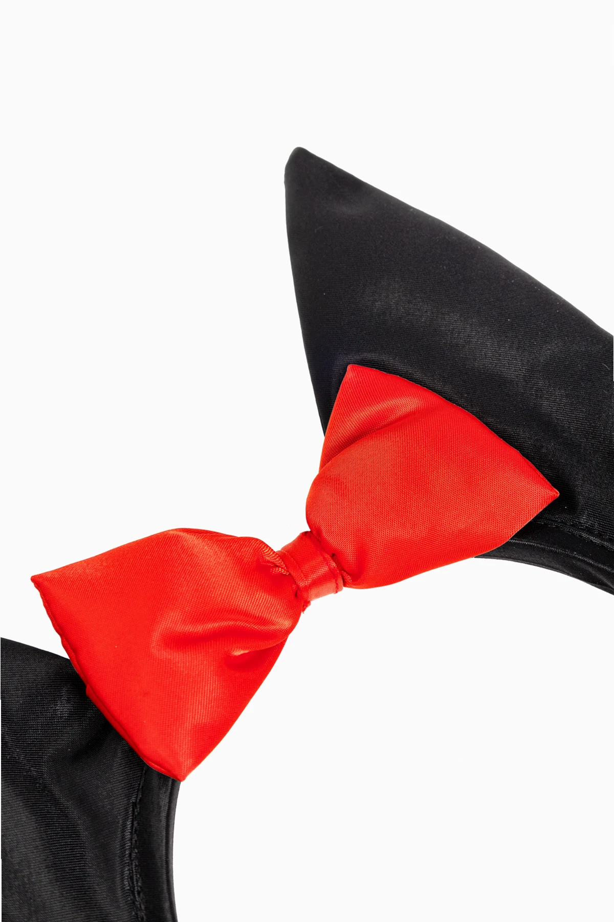 Na środku opaski, pomiędzy uszami, znajduje się starannie wykonana, intensywnie czerwona kokarda, która kontrastuje z dominującą czernią opaski. Ten wyrazisty akcent sprawia, że produkt wyróżnia się i przyciąga wzrok.