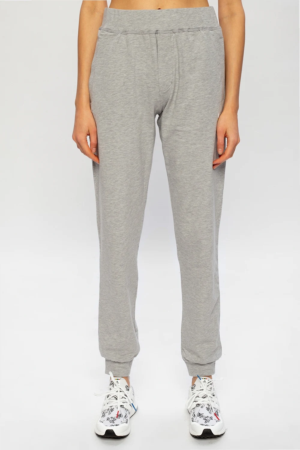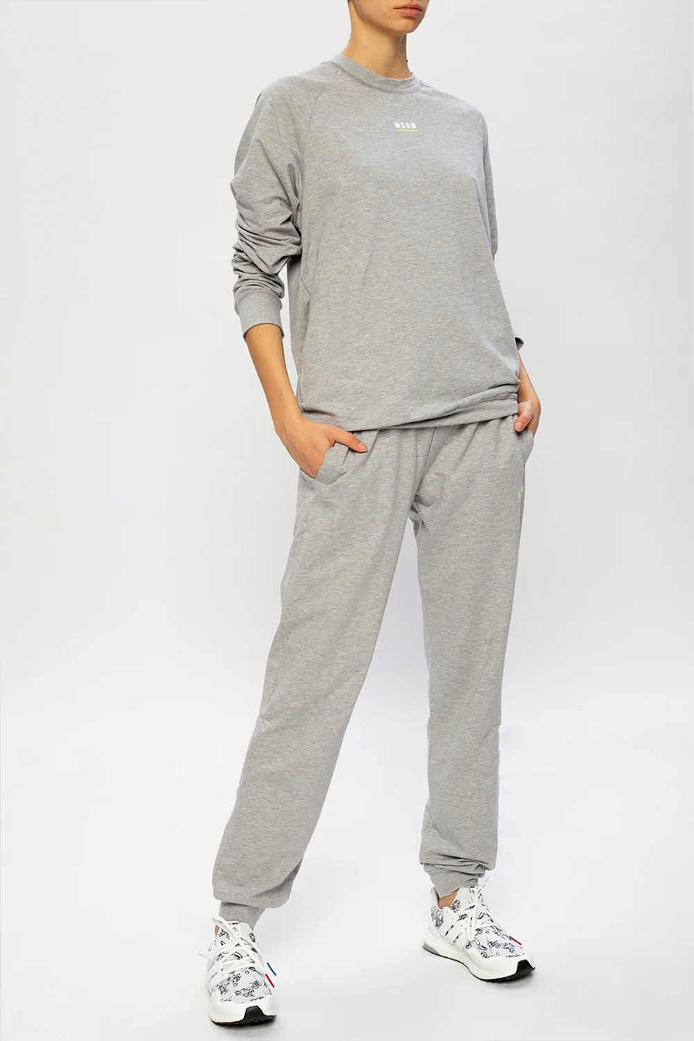 Szare, bawełniane spodnie dresowe MSGM. W pasie ściągane trokami. Z przodu dwie kieszenie i nadrukowane logo.