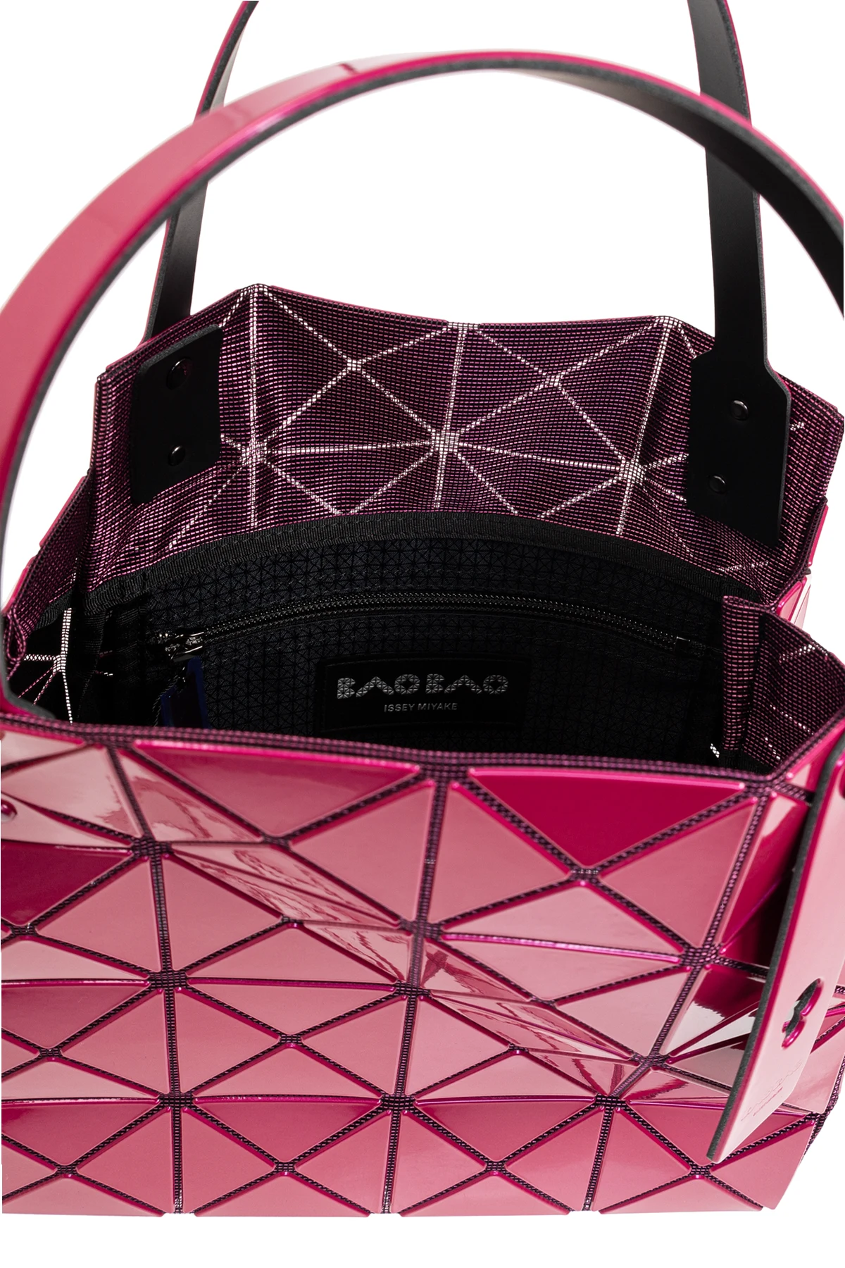 Prostokątny kształt z lekko sztywną konstrukcją oraz geometryczny motyw trójkątnych paneli, podkreślony błyszczącym, lakierowanym materiałem, nadają torbie lustrzany wygląd. Panele są połączone ciemnymi liniami, co dodatkowo uwydatnia nowoczesny wzór. Dwa uchwyty umożliwiają wygodne noszenie w ręku, a ozdobny pasek z logotypem projektanta dodaje torbie ekskluzywnego charakteru.