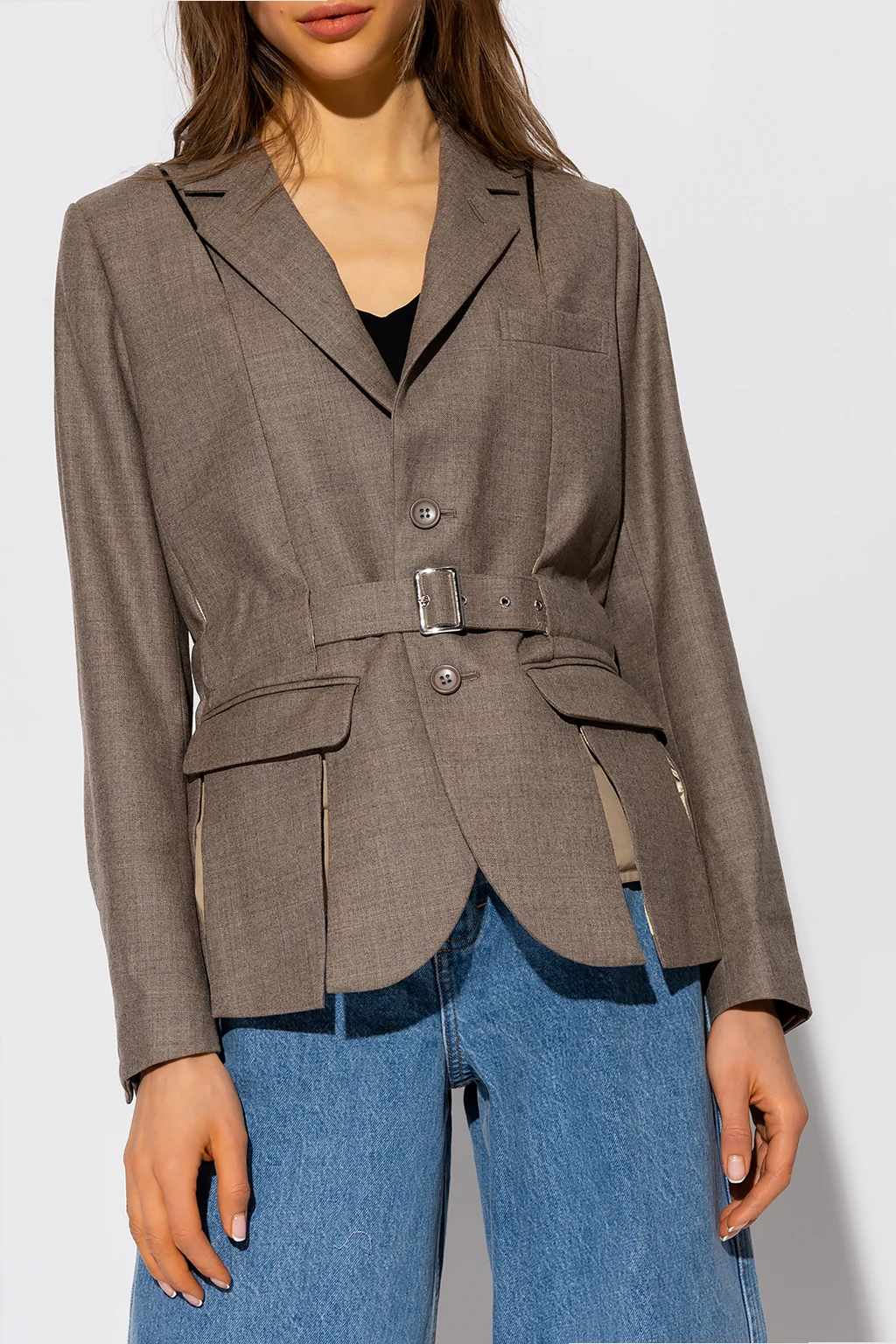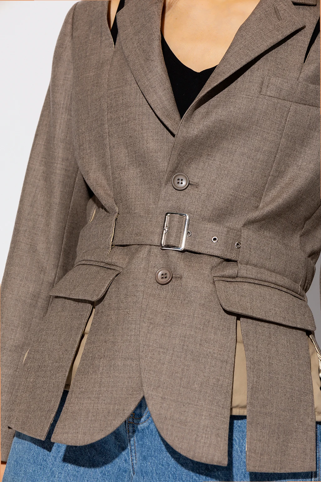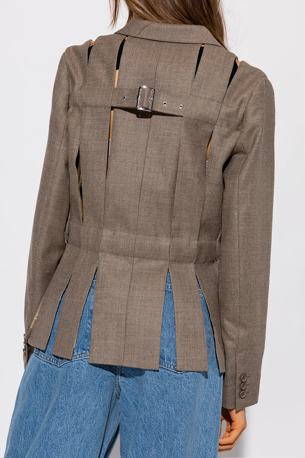 Brązowa, jednorzędowa marynarka Comme des Garcons Ninomiya. Wykonana z wełny. Zapinana na guziki oraz regulowany pas z klamrą w talii. Na ramionach rozcięcia wykończone łańcuchem. Kołnierz wykończony otwartymi klapami. Z przodu oraz z tyłu pionowe rozcięcia, na plecach pas z klamrą. Trzy wsuwane kieszenie. Długie rękawy zakończone zapięciem na guziki.