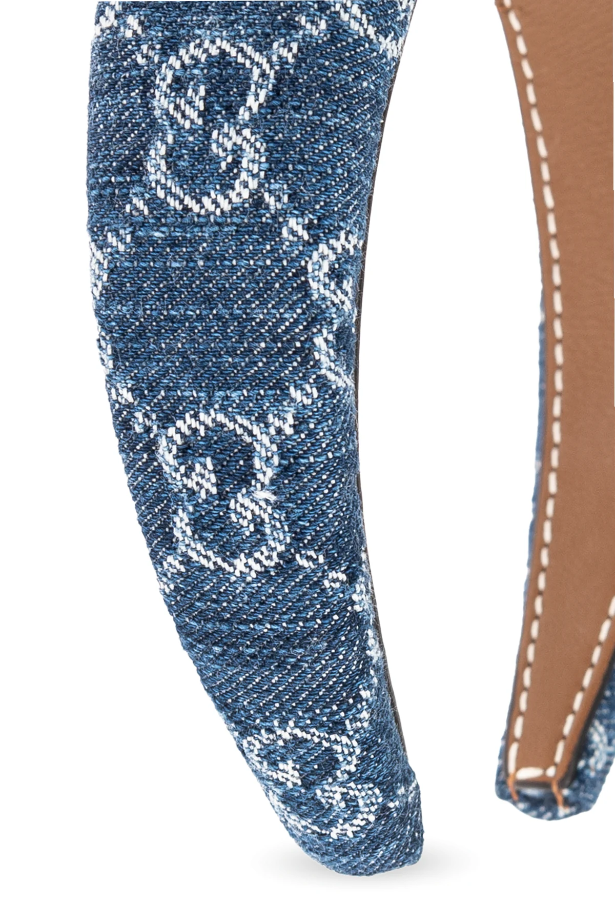 Na powierzchni opaski widoczny jest charakterystyczny wzór z białych liter "GG", subtelnie rozmieszczony, co świadczy o prestiżu i rozpoznawalności marki. Wnętrze opaski, utrzymane w brązowej tonacji, wykonane jest z miękkiego materiału, zapewniając komfort noszenia. Dodatkowo, białe przeszycia podkreślają dbałość o detale i perfekcyjne wykończenie.