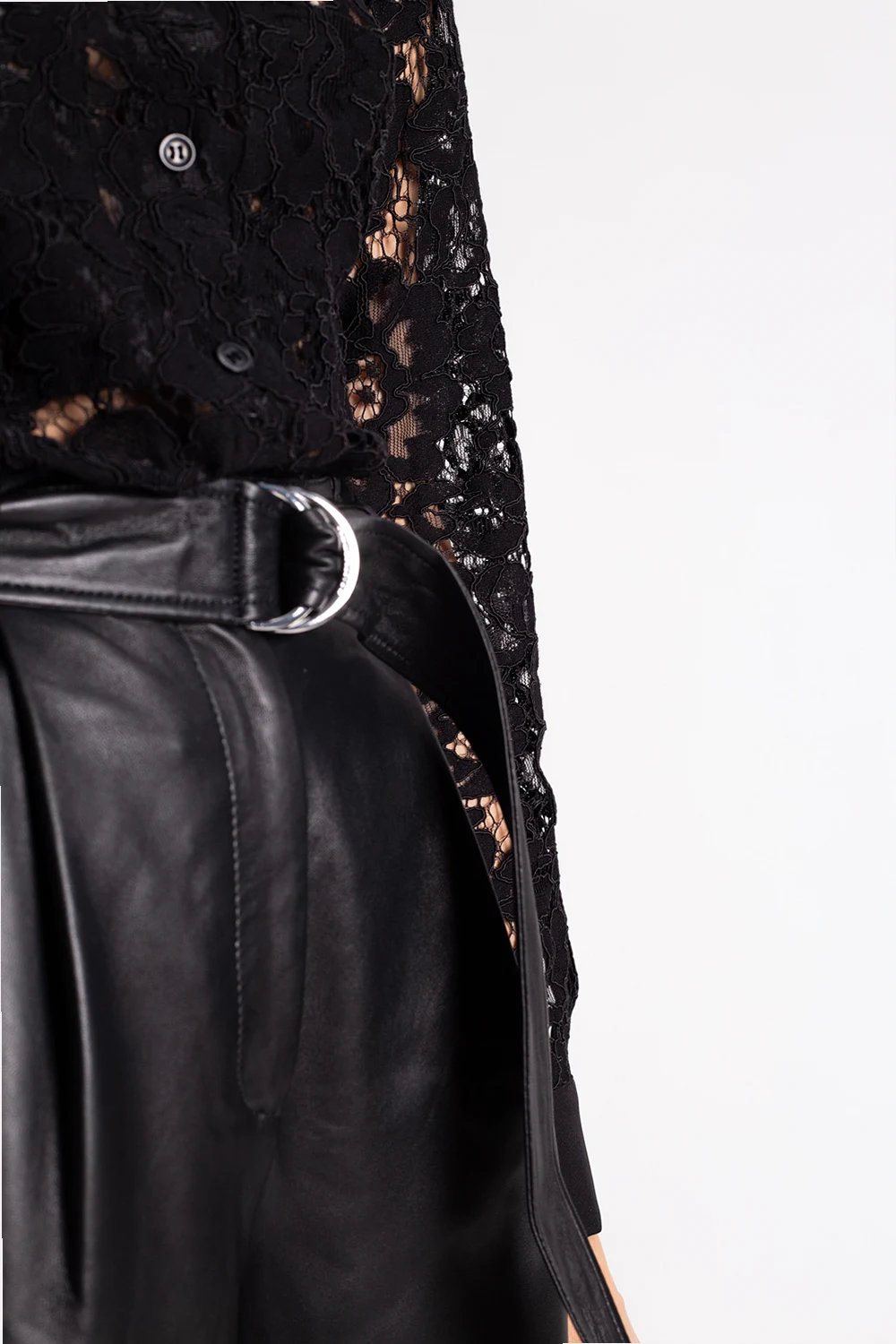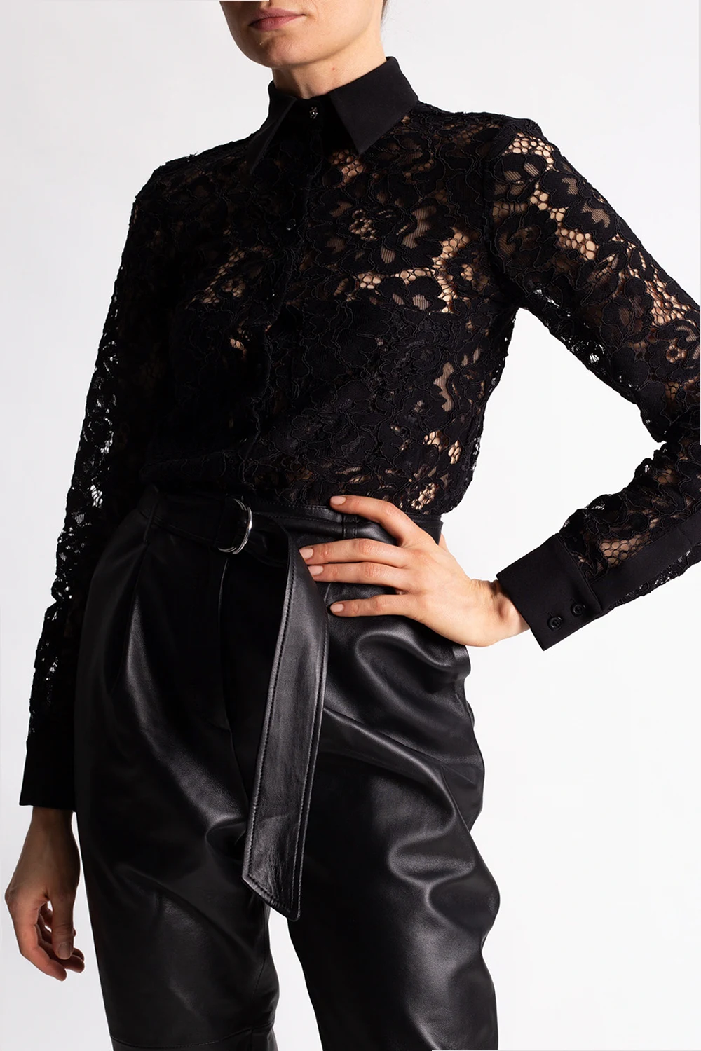 Czarna, koronkowa, transparentna koszula Philipp Plein. Zapinana na guziki. Z przodu dwie wsuwane kieszenie. Długie rękawy, makiety zapinane na guziki.