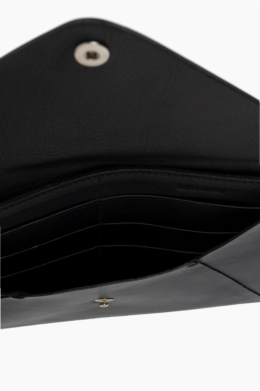 Czarny portfel VETEMENTS. Wykonany ze skóry. Zamykany na zatrzask. Z przodu wytłoczone logo. Wewnątrz dwie kieszenie i sześć miejsc na karty.