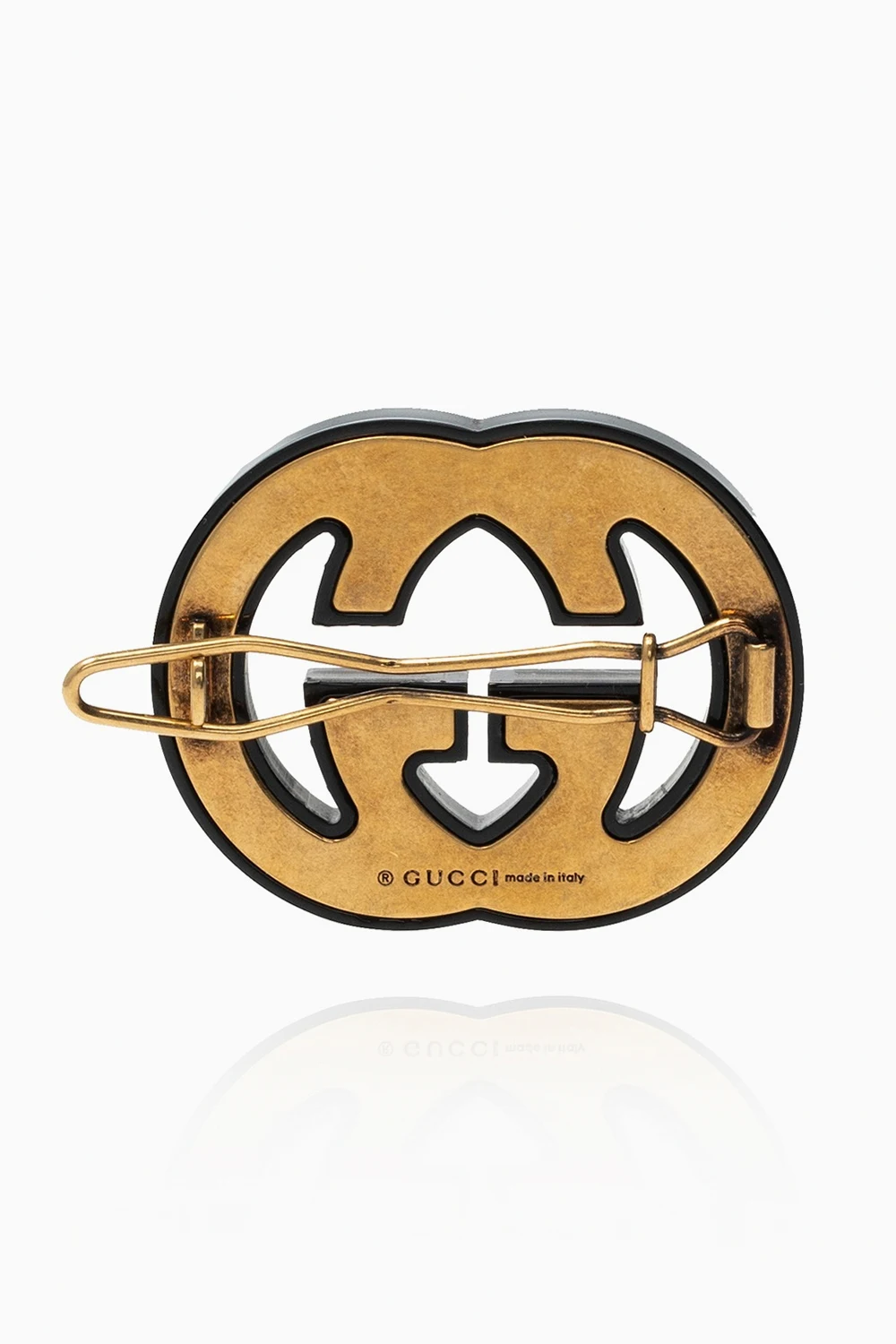 Czarno-złota spinka z logo Gucci. Ozdobiona dekoracyjnymi elementami w kolorze białym.