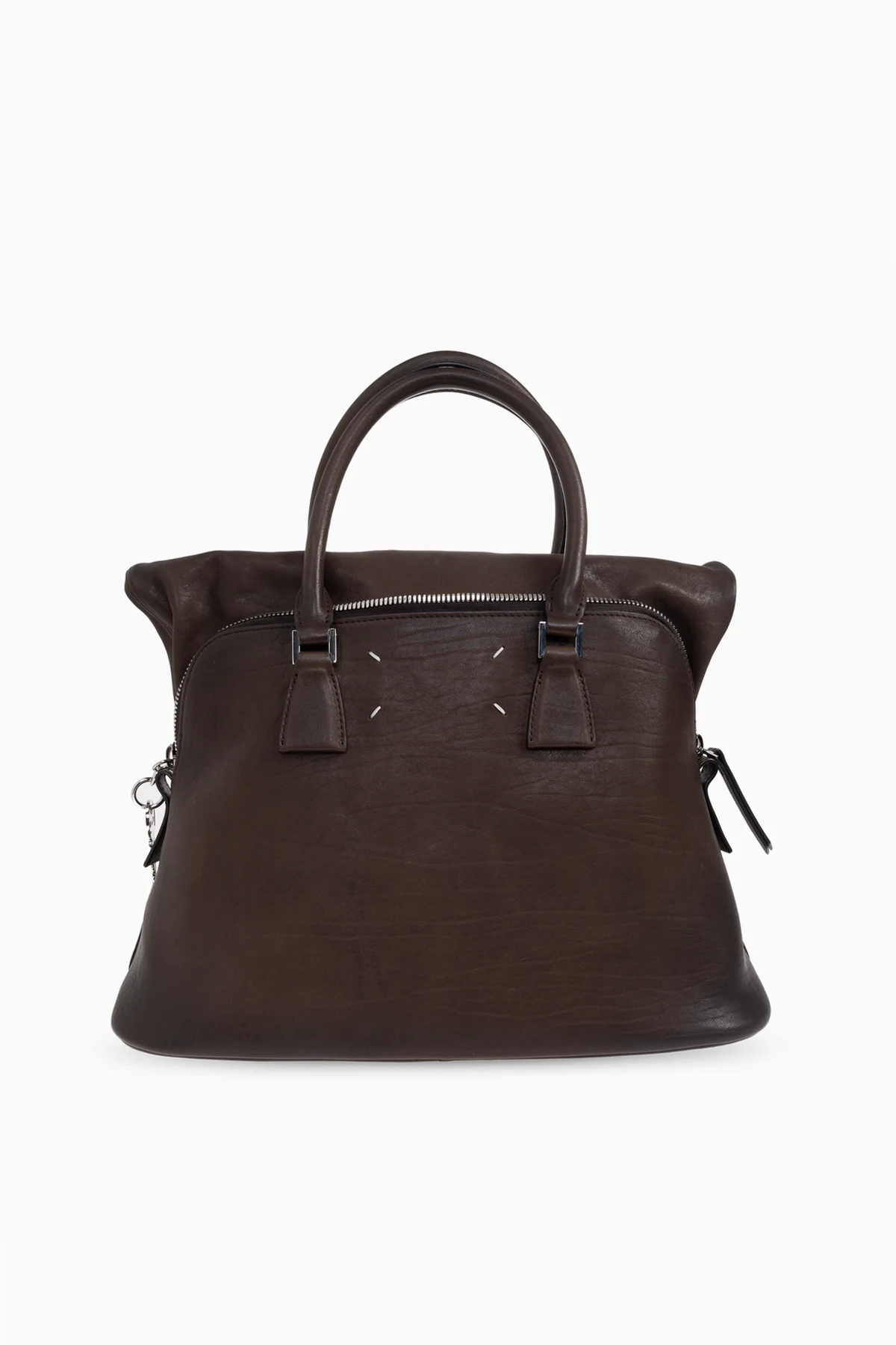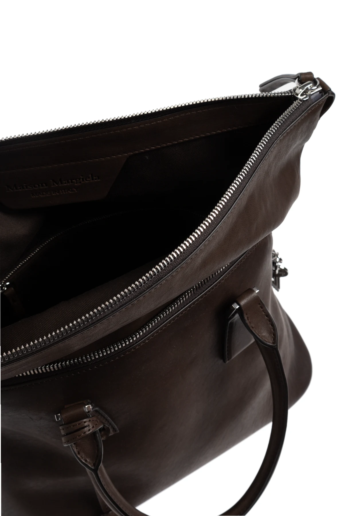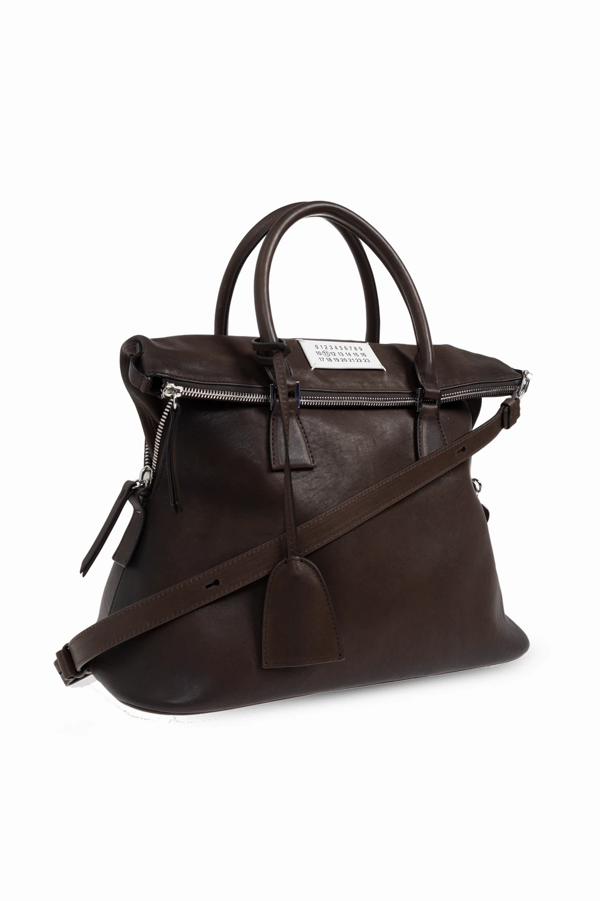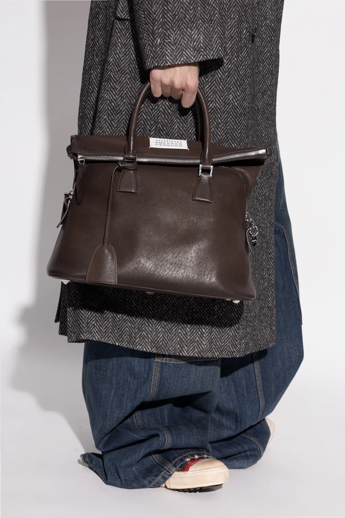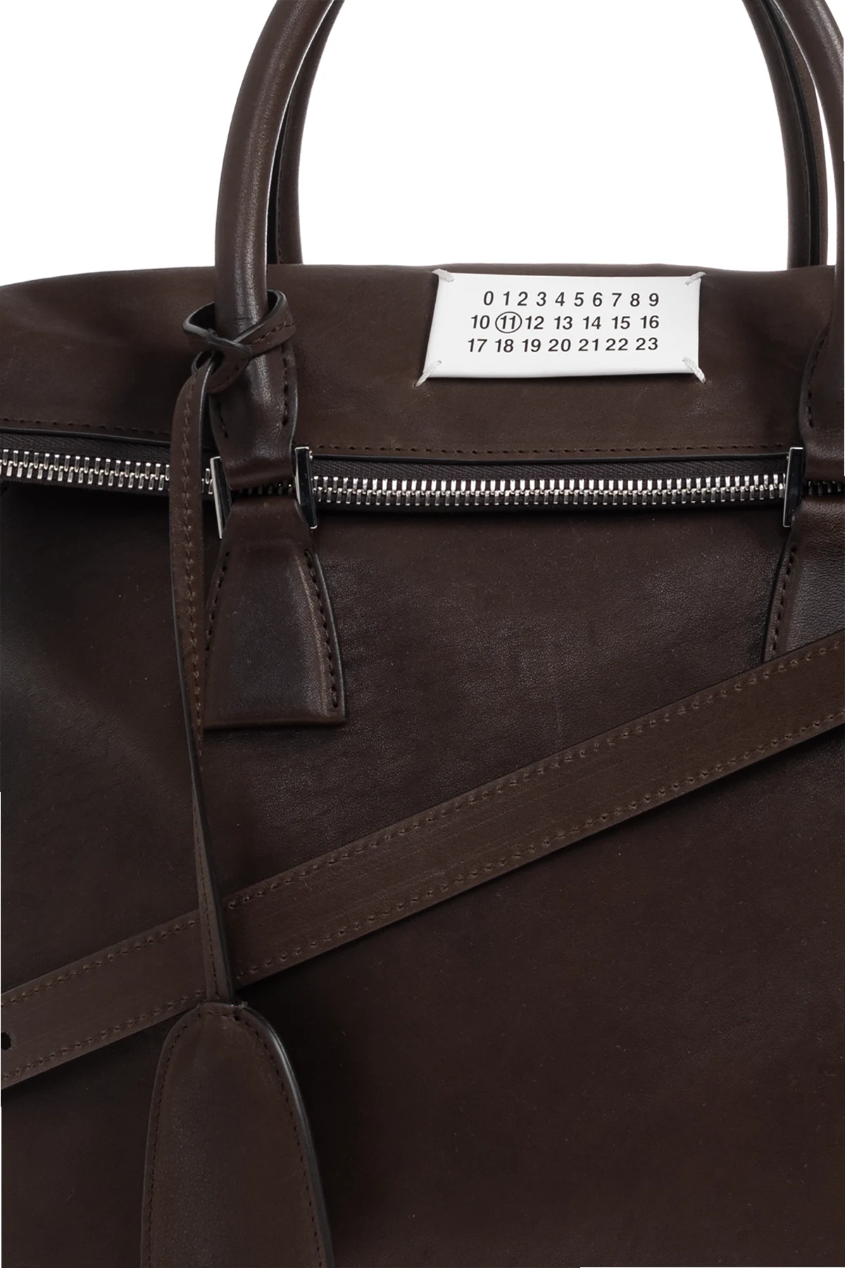 Gładka, minimalistyczna powierzchnia w głębokim brązowym odcieniu podkreśla ponadczasowy styl produktu. Rozpoznawalna biała wszywka z nadrukiem liczb i wyróżnioną cyfrą 11 stanowi czytelny znak marki Maison Margiela. Ekskluzywności dodają srebrne okucia oraz skórzany breloczek przy uchwycie.