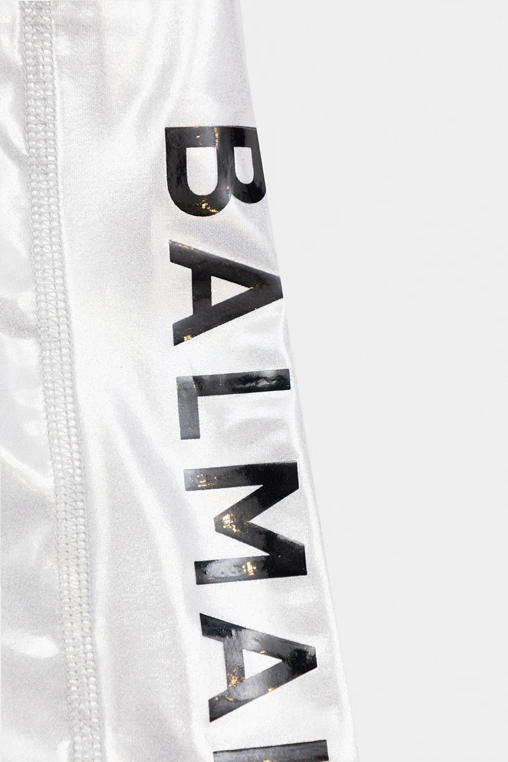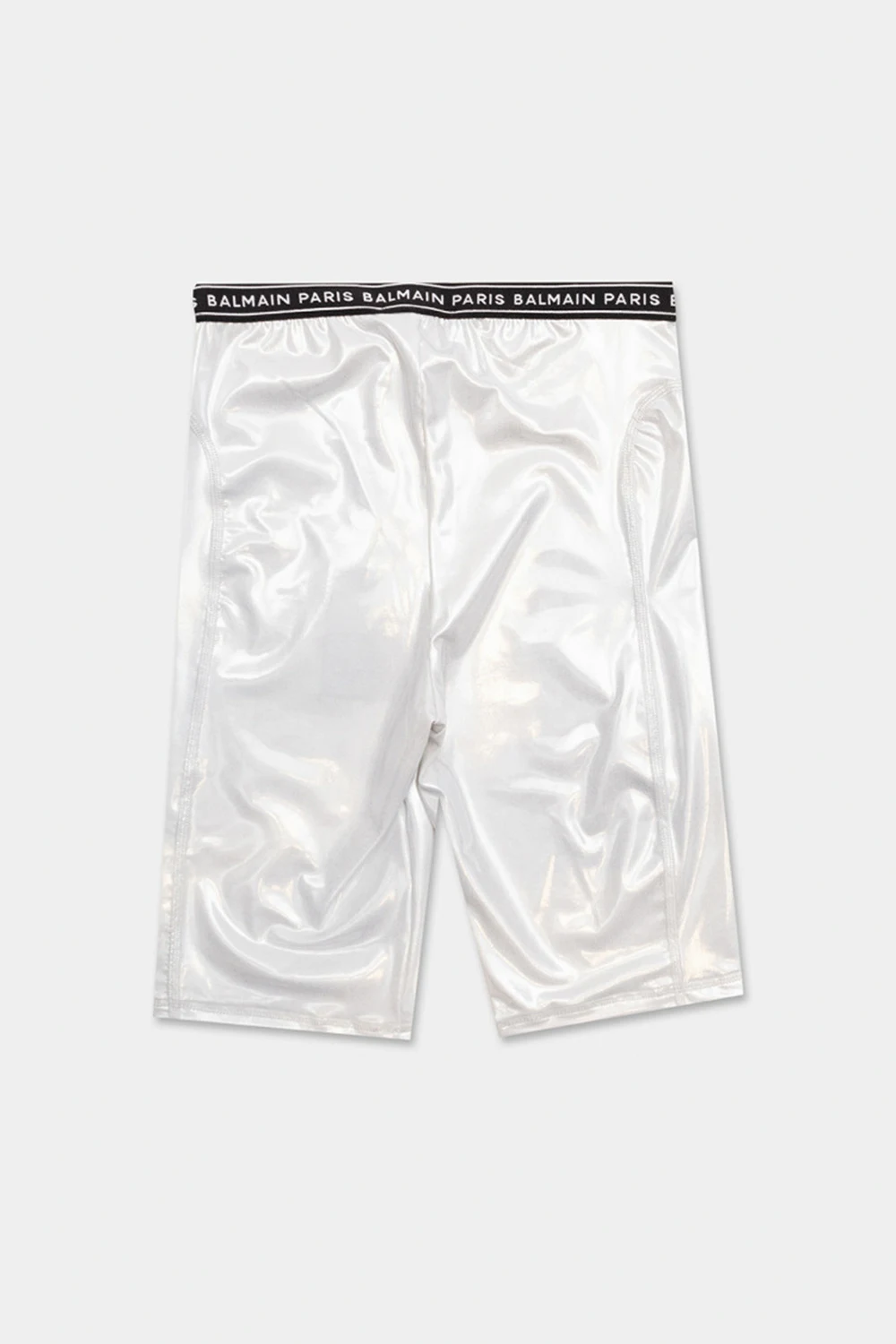 Legginsy w kolorze srebrnym Balmain Kids. W pasie wszyta guma. Ozdobione nadrukiem z logo w kolorze czarnym.