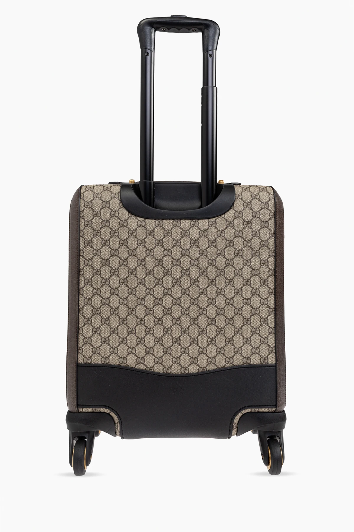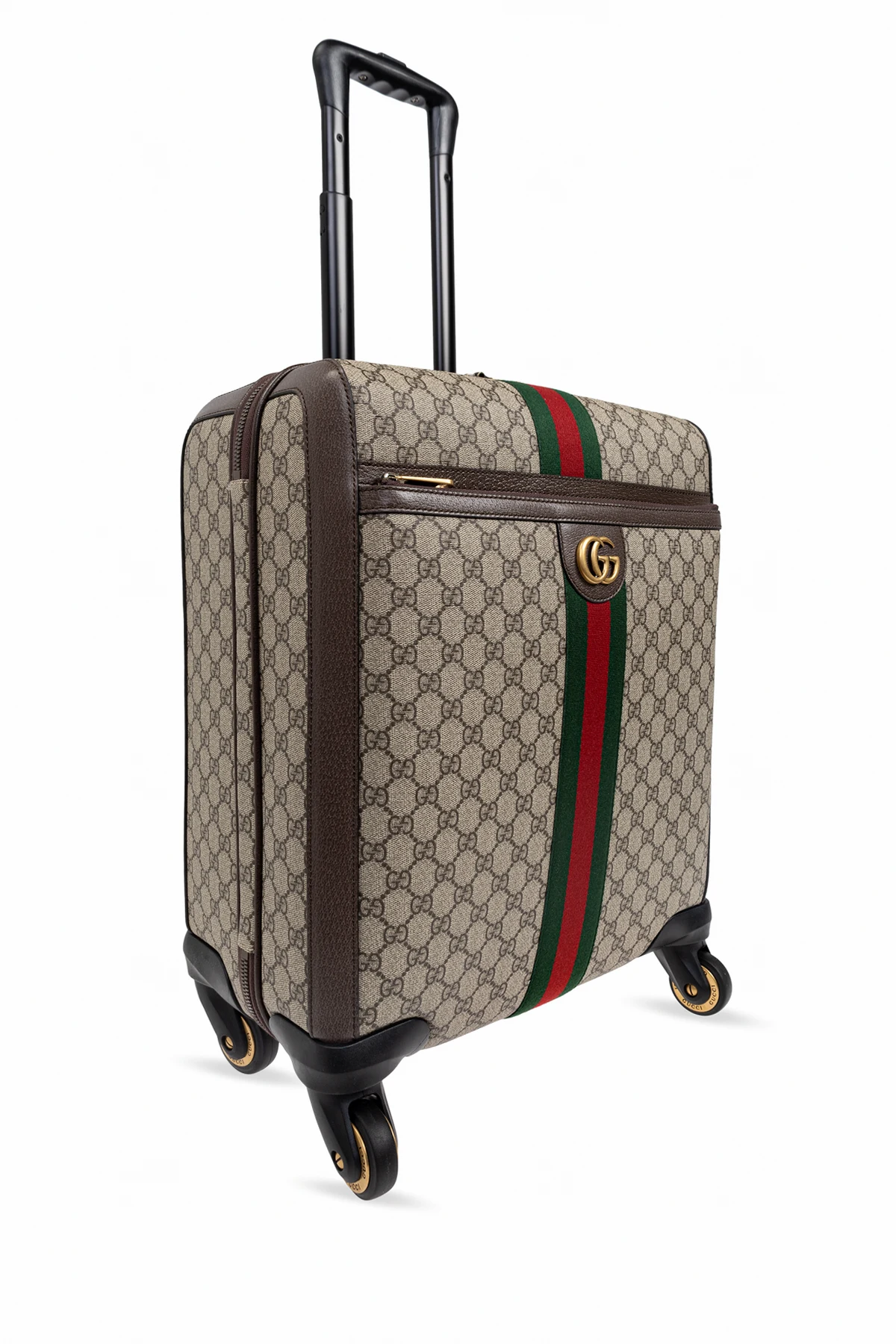 Przedstawiamy Walizkę Gucci Savoy , arcydzieło współczesnego designu sygnowane przez renomowaną markę Gucci . Ta ekskluzywna walizka przyciąga wzrok dzięki charakterystycznemu wzorowi z logo marki, osadzonemu w dominujących beżowych tonacjach, z wyrazistym zielono-czerwonym paskiem - symbolem luksusu i elegancji.