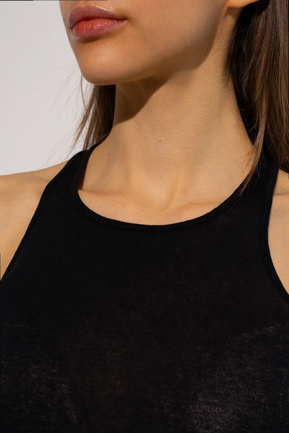 Czarny, bawełniany top na ramiączkach Rick Owens. Okrągły dekolt. Asymetryczny, surowo wykończony dół.
