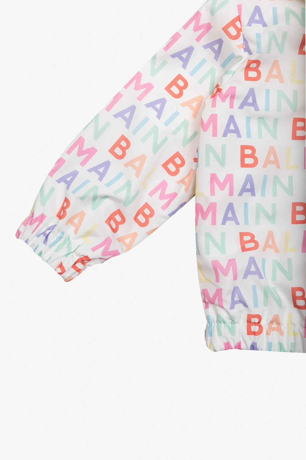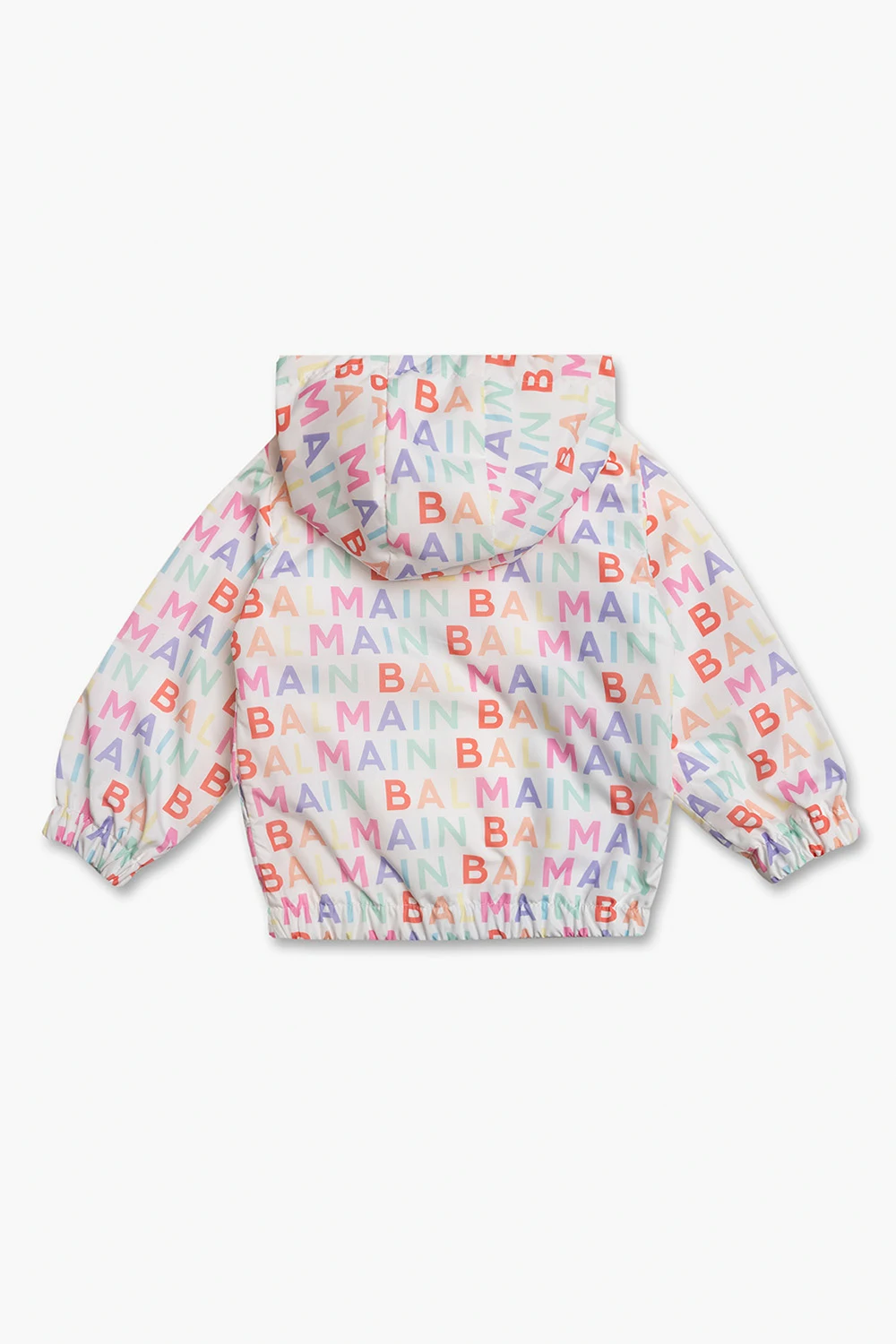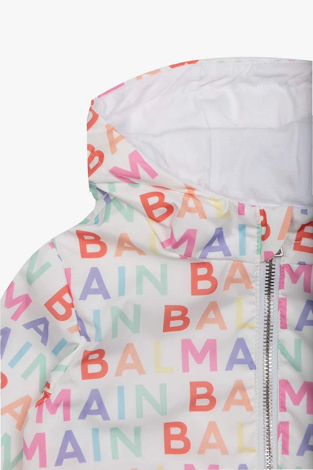Biała kurtka z kapturem Balmain Kids. Zapinana na zamek. Kolorowy nadruk z logo. Dwie wsuwane kieszenie. Warstwa wewnętrzna wykonana z bawełny. Zakończona ściągaczami.