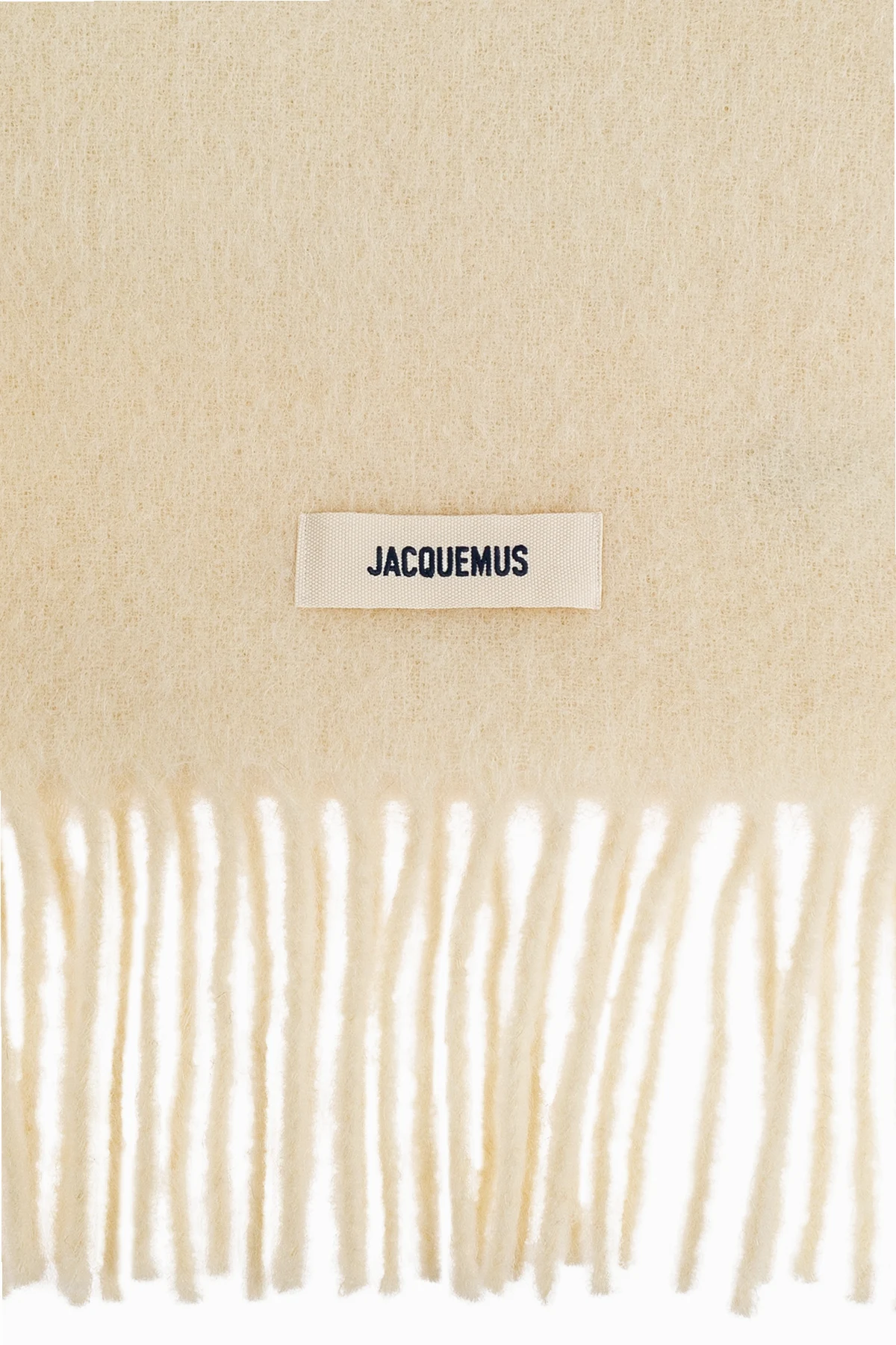 Wykonany z puszystej dzianiny z przędz moheru, alpaki oraz wełny o kremowej, jednolitej barwie, szal zachwyca miękkością i ciepłem. Długi rząd grubych frędzli na obu końcach podkreśla jego elegancki, niewymuszony charakter, a subtelna, jasna naszywka z kontrastującym logo Jacquemus jest ukłonem w stronę sztuki detalu.