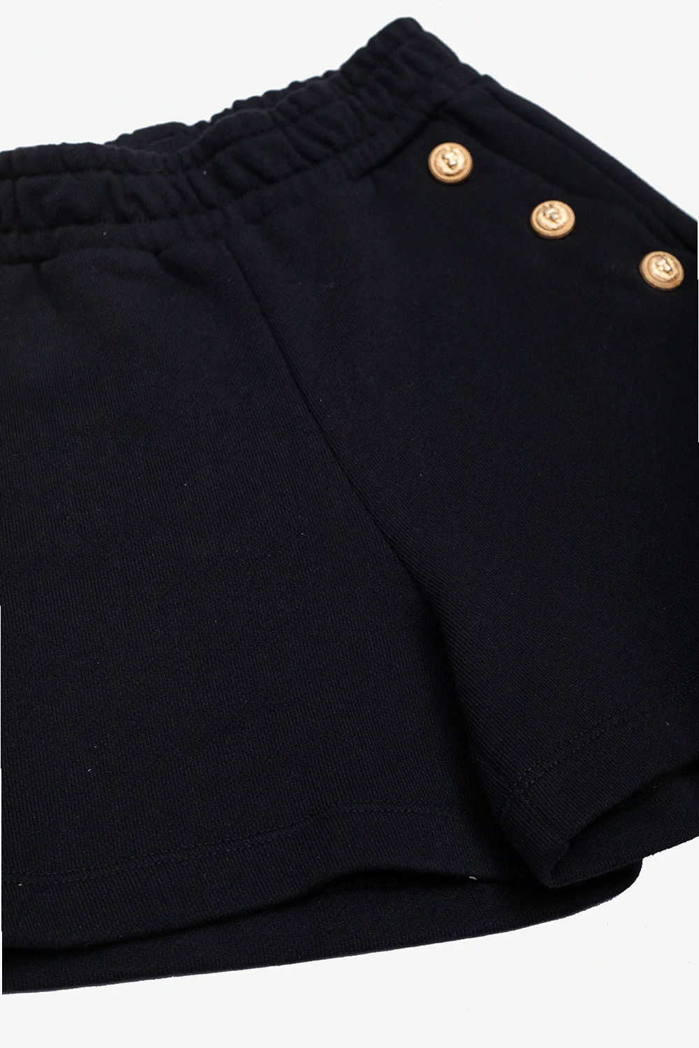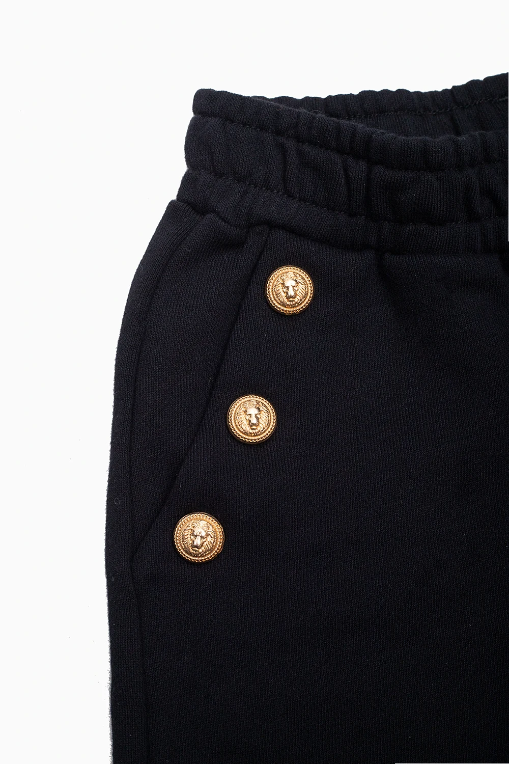 Czarne, bawełniane szorty Balmain Kids. W pasie ściągane trokami. Z przodu dwie kieszenie i okrągłe aplikacje w kolorze złotym z charakterystyczną głową lwa.