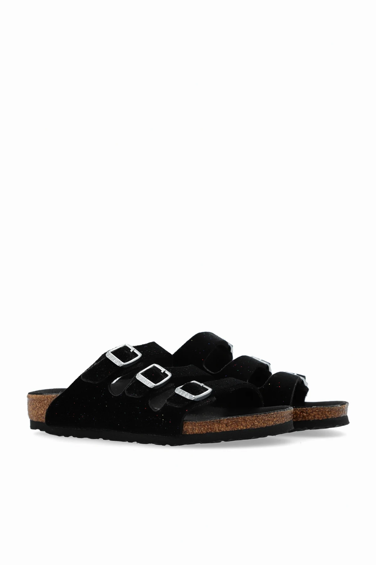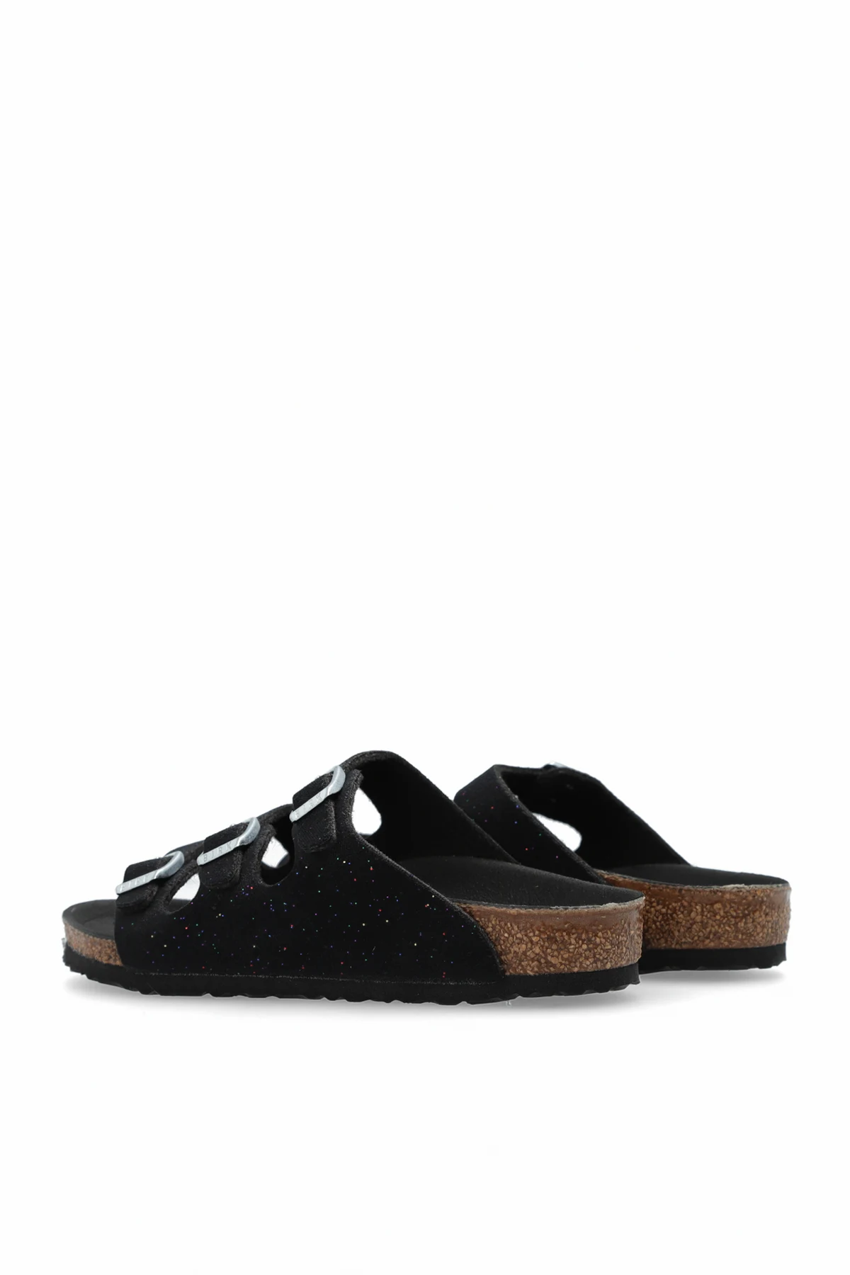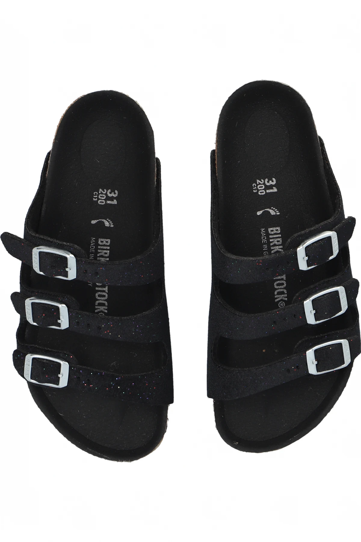 Czarne klapki, model ‘Florida’ Birkenstock. Cholewka o zwężanej szerokości wykonana z materiału wykończonego kolorowym, połyskującym brokatem. Zapinane na regulowane paski z klamrą w kolorze srebrnym. Z boku wytłoczone logo w kolorze białym. Anatomicznie ukształtowana wkładka korkowo-lateksowa. Czarna podeszwa z pianki EVA.