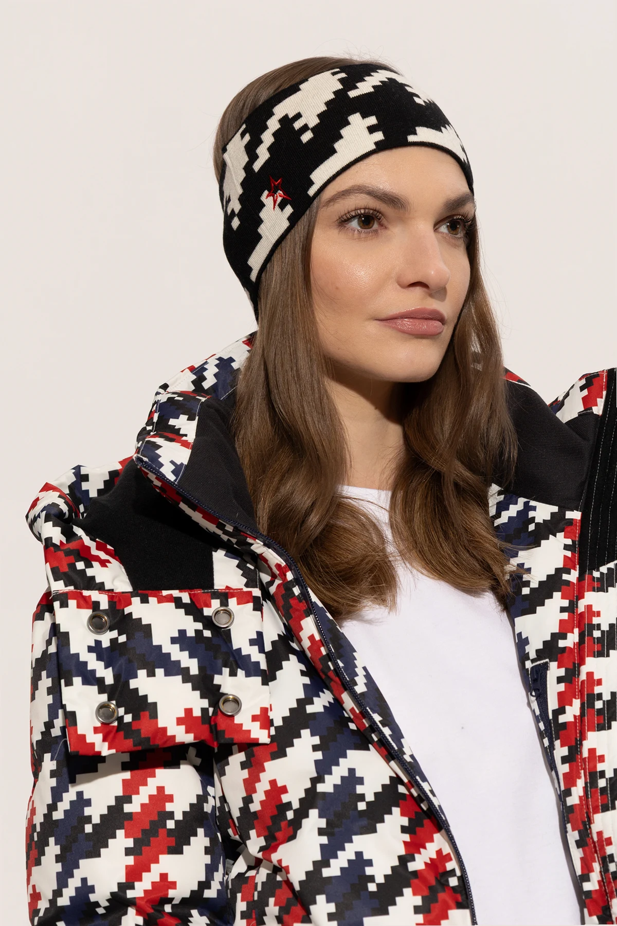Klasyczna opaska na głowę marki Perfect Moment to oryginalna propozycja dla koneserów wysmakowanych dodatków. Dominujący czarny kolor został uzupełniony wyrazistym, geometrycznym wzorem przypominającym dużą pepitkę, podkreślając uniseksowy charakter akcesorium. Dzianinowy, miękki materiał zapewnia wyjątkową elastyczność oraz komfort termiczny, doskonale współgrając z urbanistycznym stylem oraz sportową elegancją.