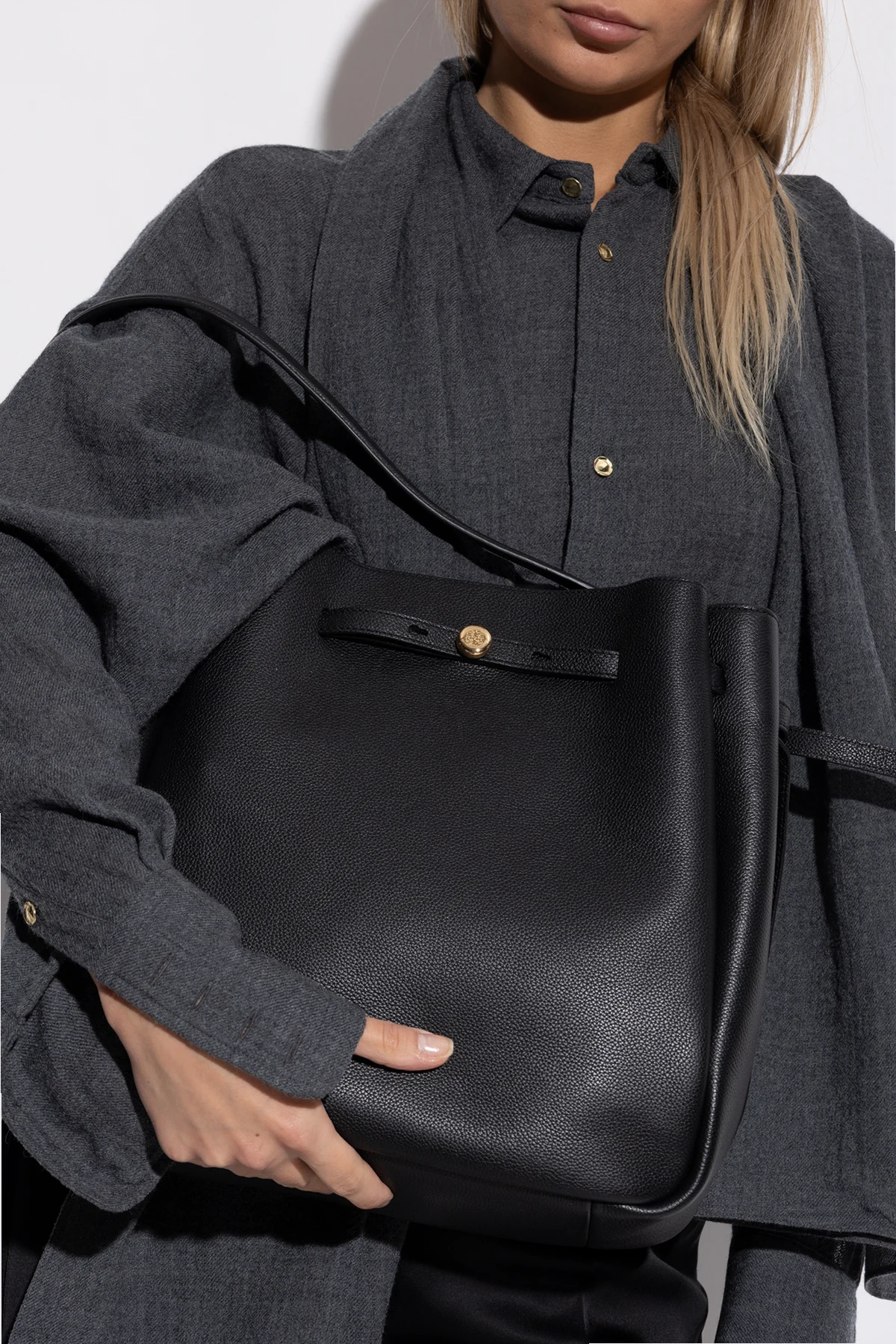 Torba na ramię Romy Large marki Tory Burch ukazuje ponadczasową elegancję w pełnej prostocie. Utrzymana w szlachetnym, czarnym kolorze, zachwyca workowatą, lekko zaokrągloną formą, która harmonijnie łączy nowoczesność z klasyczną subtelnością.