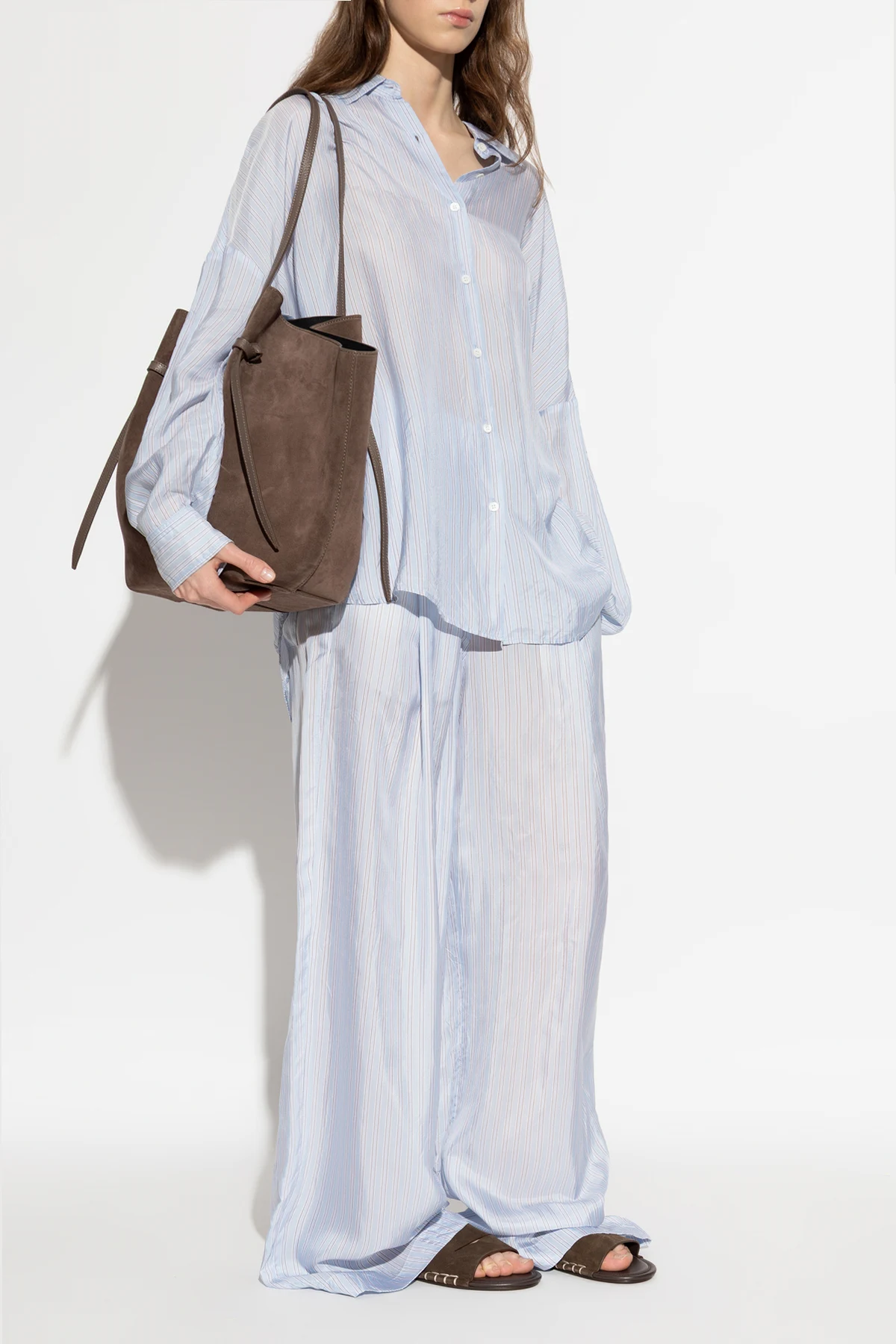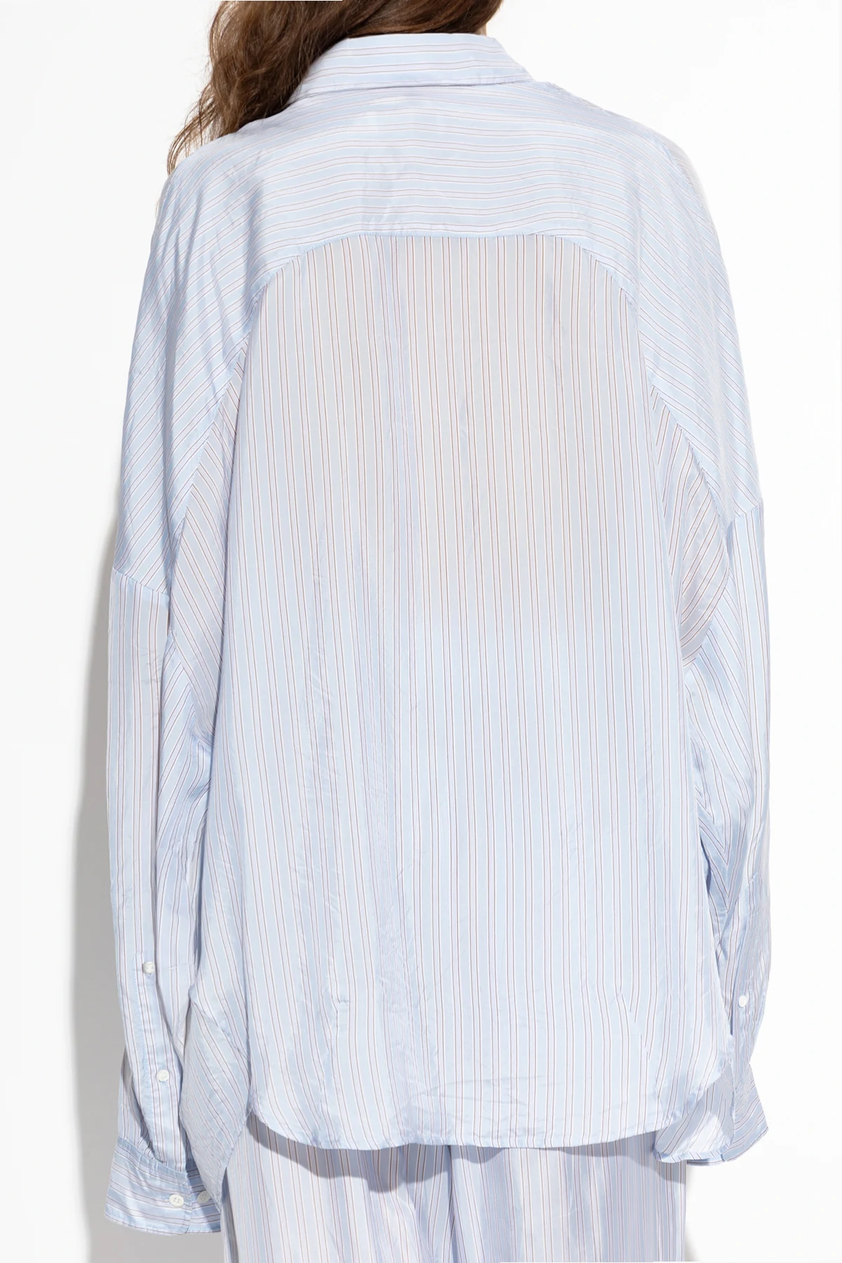 Koszula Casia z ekskluzywnej linii Dries Van Noten to wyrafinowana propozycja o luźnym, oversize’owym fasonie, podkreślonym subtelnie obniżoną linią ramion oraz szerokimi, długimi rękawami z eleganckimi mankietami. Model wyróżnia się lekko zaokrąglonym, przedłużonym z tyłu dołem – detalem nadającym dynamizmu i lekkości sylwetce.