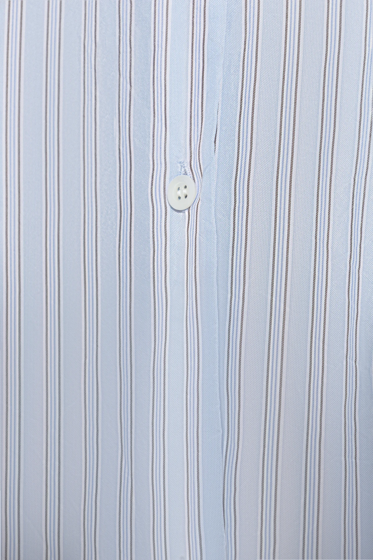 Wykonana z niezwykle delikatnego cupro, koszula urzeka spektakularną lekkością i przewiewnością. Subtelny, pionowy wzór w cienkie paski w odcieniach niebieskiego i beżu, dopełnia klasyczny kołnierz oraz dyskretne zapięcie na białe guziki. Unikatowa kompozycja kolorystyczna i najwyższej próby materiał wpisują się w nowoczesną, szlachetną estetykę projektanta, stając się wyrazem ponadczasowej elegancji.